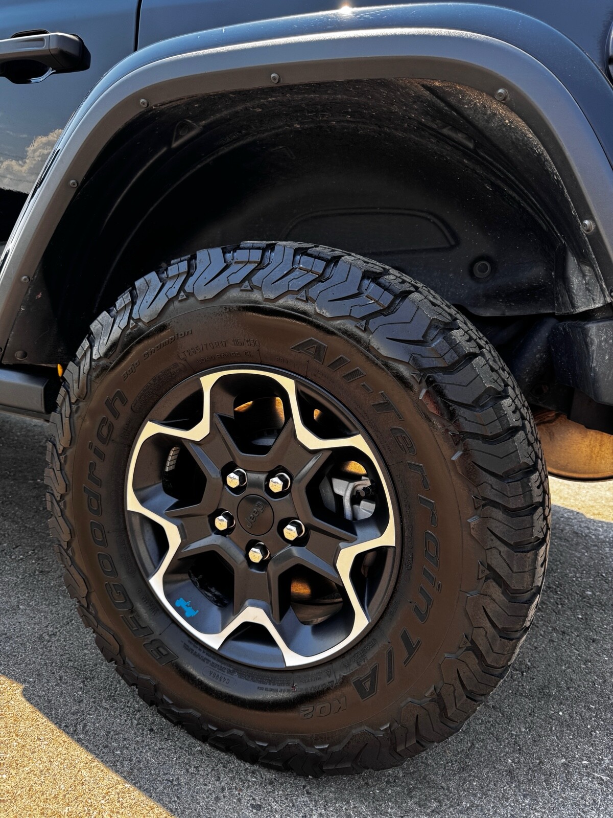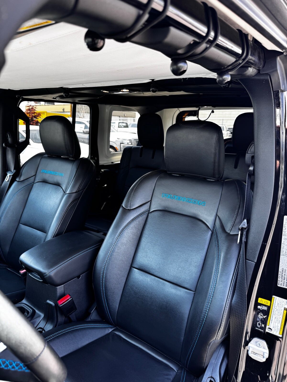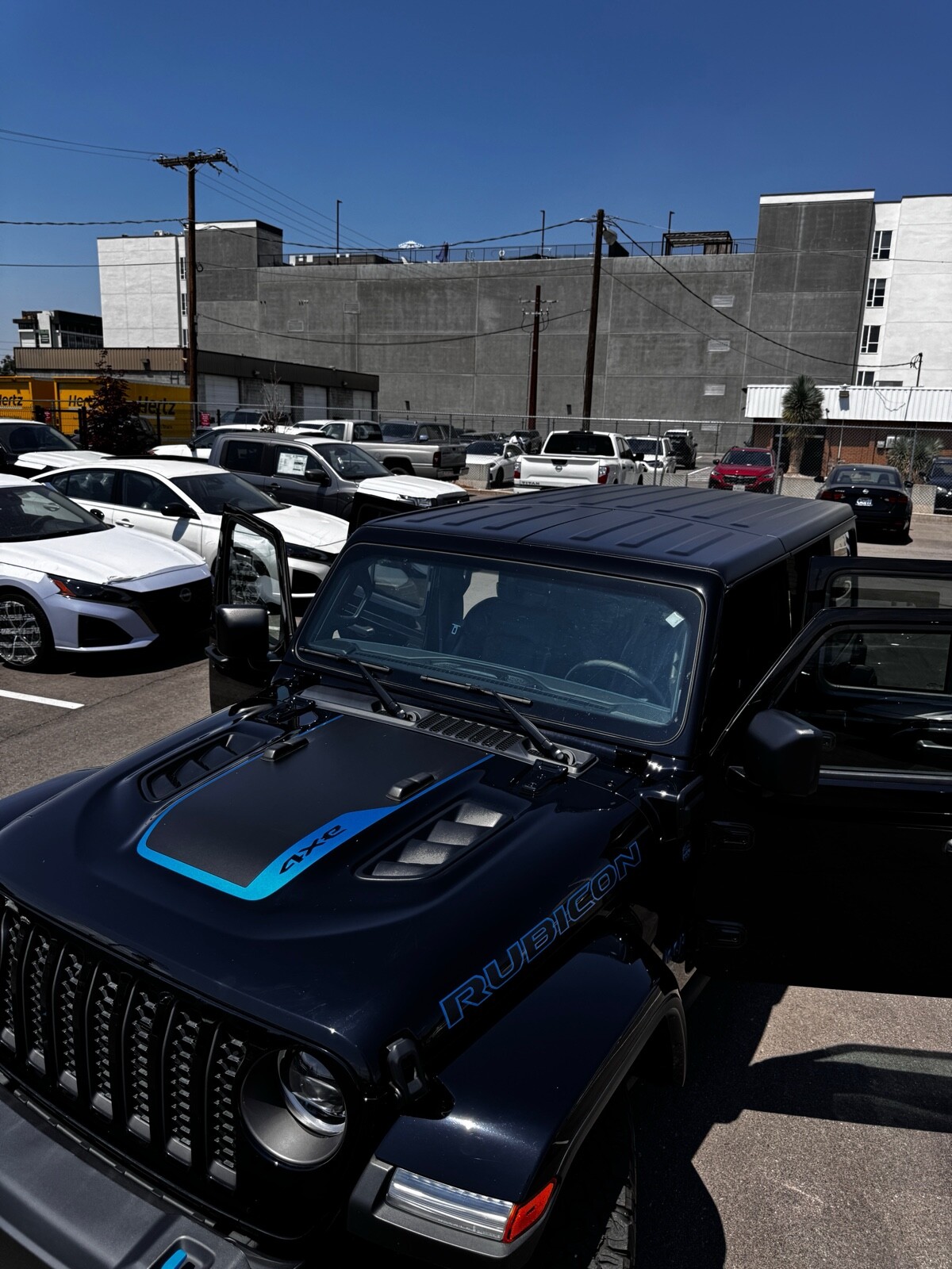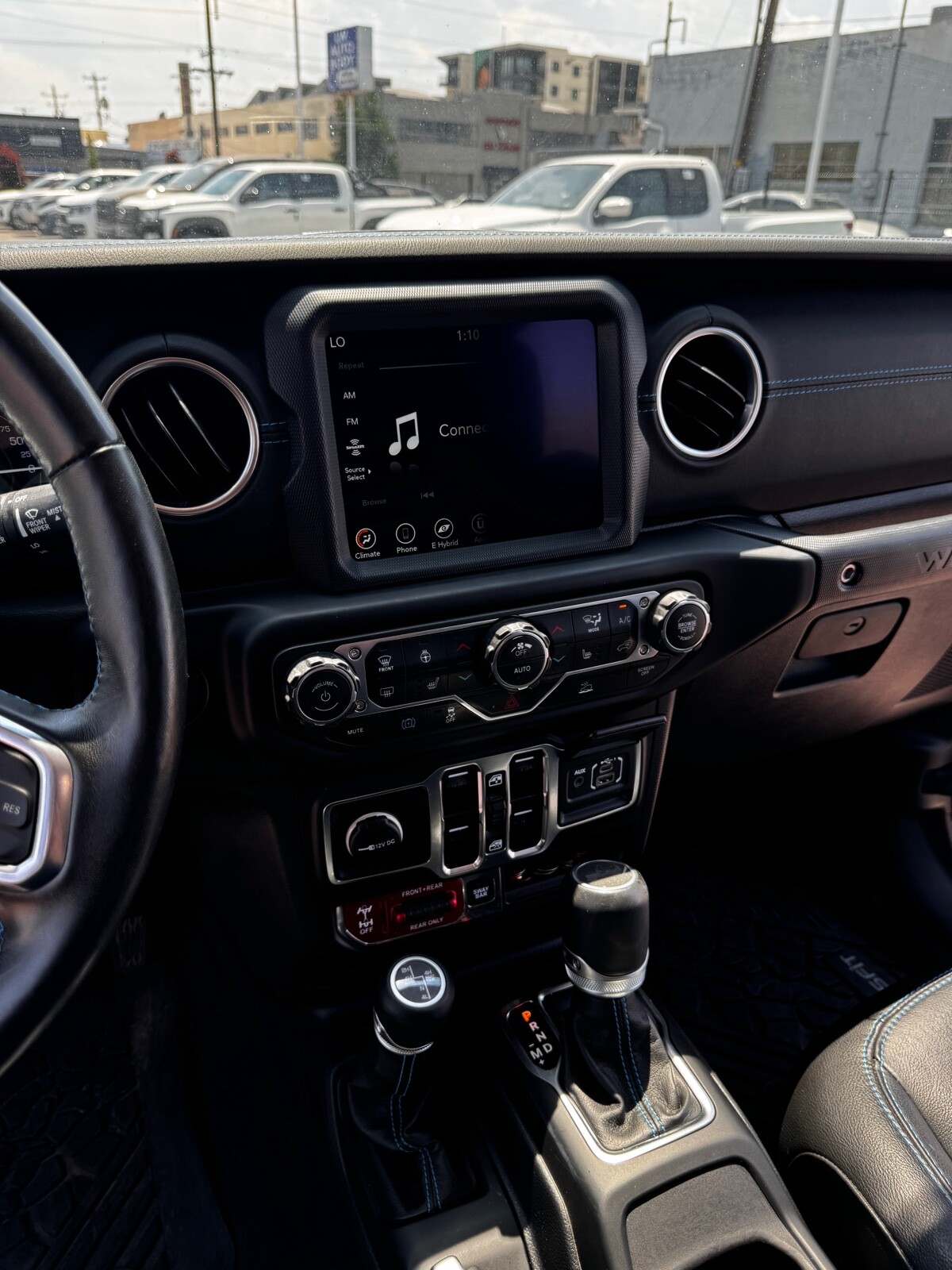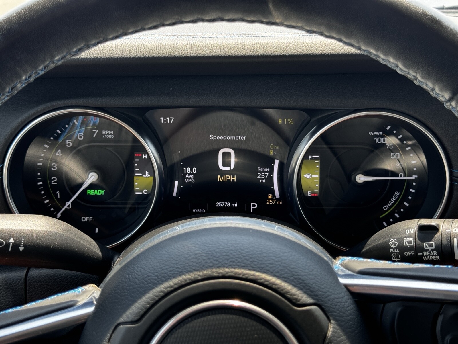 The 2023 Jeep Wrangler Rubicon 4xe is a 4WD hybrid SUV with a 2.0L turbocharged engine and electric motors that produce 375 horsepower and 470 pound-feet of torque. It has an 8-speed automatic transmission and three e-Selec driving modes, including Hybrid Mode, which combines the engine and electric motors for maximum acceleration.
