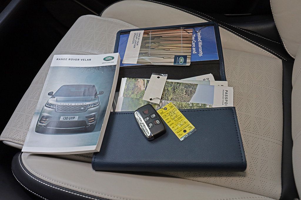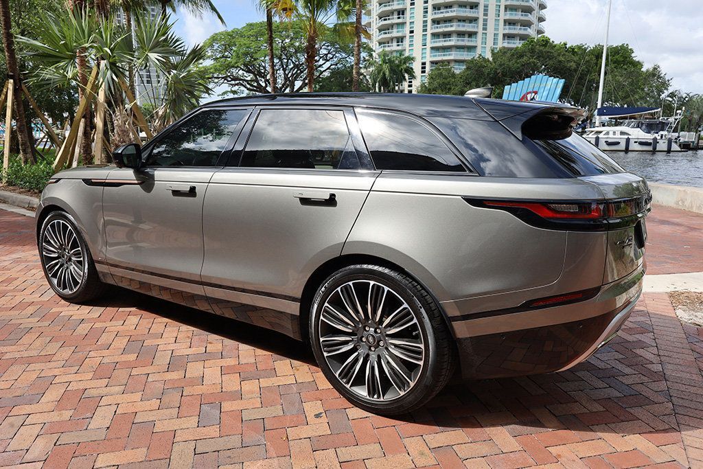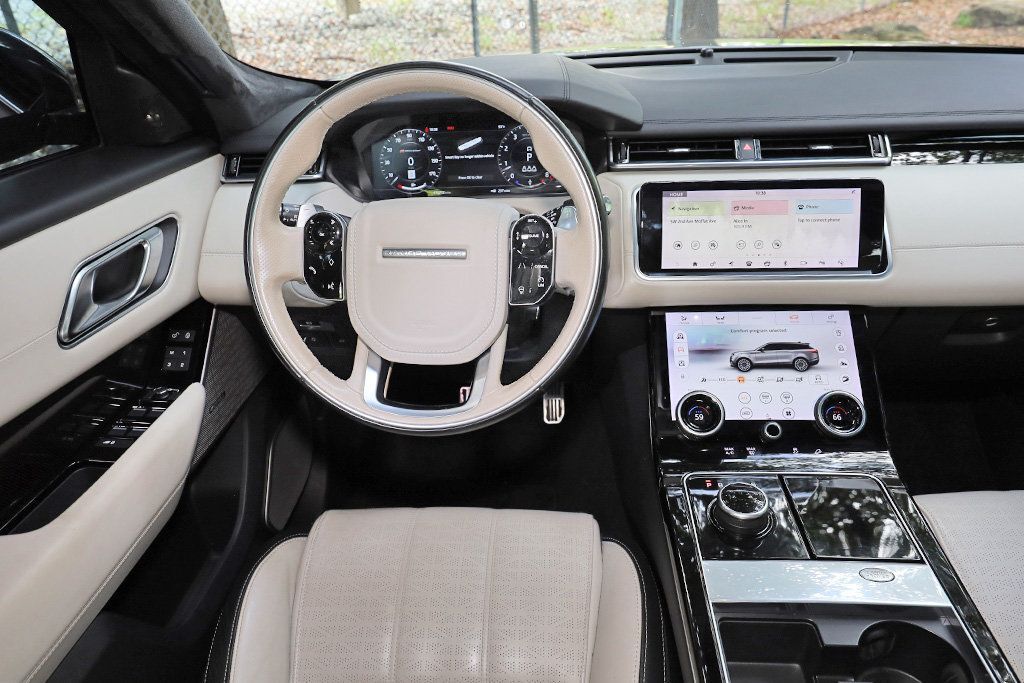 The First Edition comes fully loaded and with unique styling cues including a full extended leather interior, a copper weave carbon fiber trim finisher, perforated Windsor leather seats finished in two tone Light Oyster/Ebony, a 1,600W Meridian Signature Sound System, special 22-inch Split-Spoke wheels with diamond-turned finish, and a First Edition badge on the B-pillar. The only available options were color and wheel choices and the SXM/HD radio feature. This Velar does have the upgraded radio plus the optional Silicon Silver paint with a Black contrast roof.
