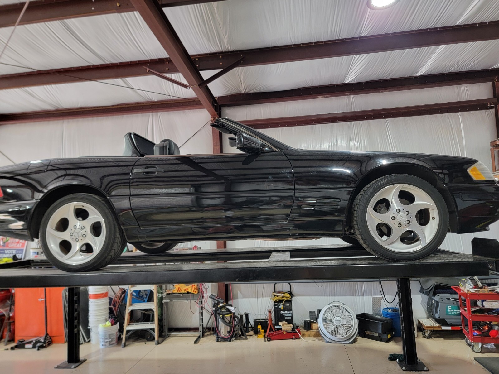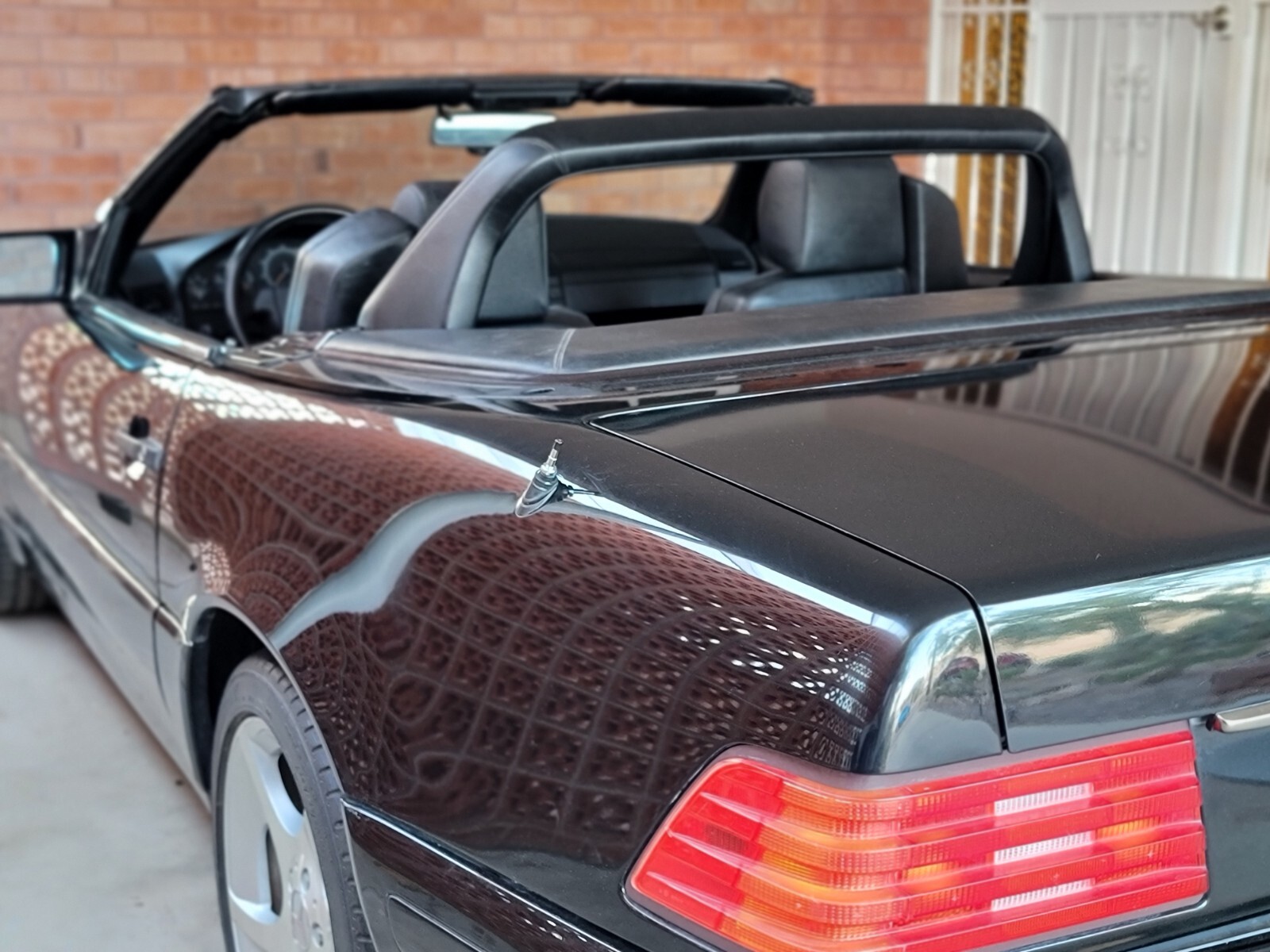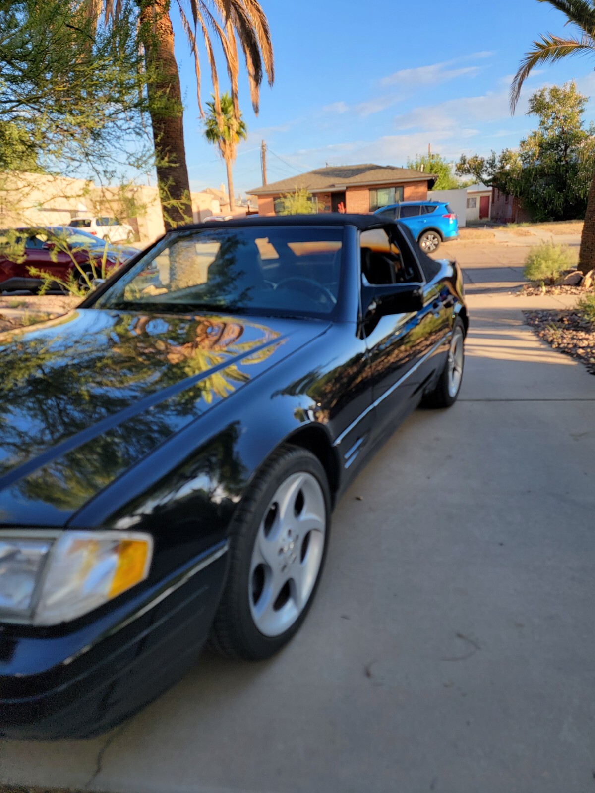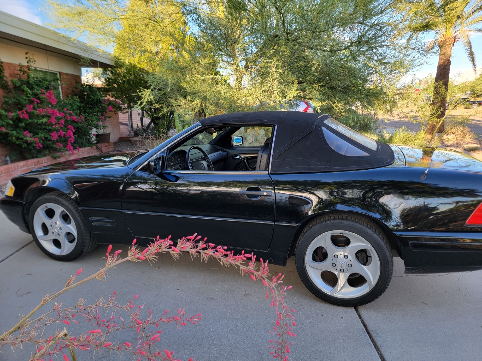 I'm selling my 1996 Mercedes-Benz 320 SL. triple black with Alphard turbine staggered Rims. Includes hard top. This car turns heads with hard top on or ragtop down. 6 way adjustable seats , Bose sound system w cassette and 6 cd changer. A/C blows ice cold. Leather clad roll bar. Convertible top hydraulics have had all seals replaced and works great! So- TOP WORKS Great. No trouble codes or dash lights, just passed AZ Emissions. Car has California Emissions. This Mercedes Roadster spent is 1st 17 years in SoCal and 10 years here with me in SoAZ - no rust. We have lost our climate controlled summer storage so we must sell this elegant German Roadster. This is a large heavy 2 seater ! Extras include rare Mercedes SL manual top lift hoist , original Mercedes tool kit and Autobahn first aid kit , 2 ADAC Auto Rally grill badges and Vintage Alphard Turbine rims ( worth $ 2000 , if you can find them for sale). The usual age related cosmetic issues. Leather seat bottoms are Split, new seat bottom covers included. Leather roll bar cover has a small (repaired) split in leather, Cloth top is in good shape to but back plastic window is hazed and has a small crack. Front Shocks need replaced. Price reflects these defects. Detachable rollbar windscreen included. Runs great . Private seller , no sales tax .