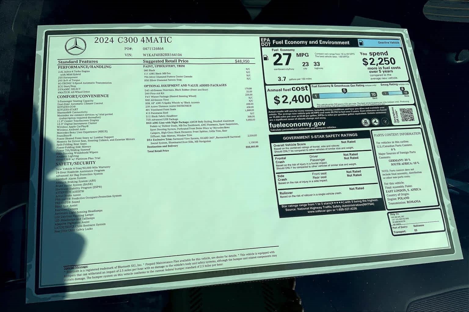 EXCLUSIVE TRIM PACKAGE: Illuminated Door Sills, Surround View System, GUARD 360, MB Navigation, Burmester® 3D Surround Sound System, 15 high-performance speakers, DSP amplifier w/a total output of 710 watts, FrontBass technology, sound optimization, 2 built-in sound presets of the 3D surround sound system, equalizer function and noise compensation, Music Streaming, Sound Personalization, PANORAMA SUNROOF, ACTIVE DISTANCE ASSIST DISTRONIC®, VENTILATED FRONT SEATS, ADVANCED USB PACKAGE 2 USB-C ports in the center console and 2 USB-C ports under the front center armrest w/fast-charging capability and suitable for data transfer, 2 USB-C ports for the rear on the center armrest, w/fast-charging capability and 2 12 V sockets, one in the front, one in the rear, With this package, all 6 USB ports are capable of USB Power Delivery (100W)