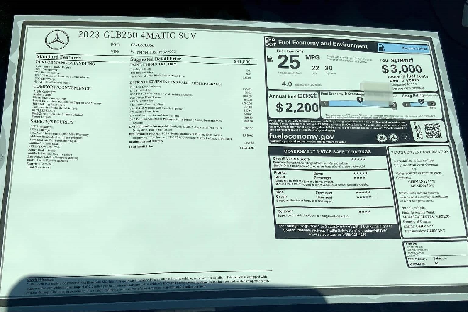 PREMIUM PACKAGE Hands-Free Access, Power-Folding Side Mirrors, 10.25 Digital Instrument Cluster, Auto-Dimming Rearview & Driver-Side Mirrors, Keyless GO®, 10.25 Media Display w/Touchscreen, 115V Outlet, PANORAMA ROOF, MULTIMEDIA PACKAGE MB Navigation, Augmented Video for Navigation, Traffic Sign Assist, PARKING ASSISTANCE PACKAGE Active Parking Assist, Surround View System, WHEELS: 7.5J X 19 10-SPOKE W/MATTE BLACK ACCENTS Tires: 235/50R19, HEATED FRONT SEATS, NATURAL GRAIN BLACK LINDEN WOOD TRIM, GARAGE DOOR OPENER, HEATED STEERING WHEEL Non-Flattened Steering Wheel.