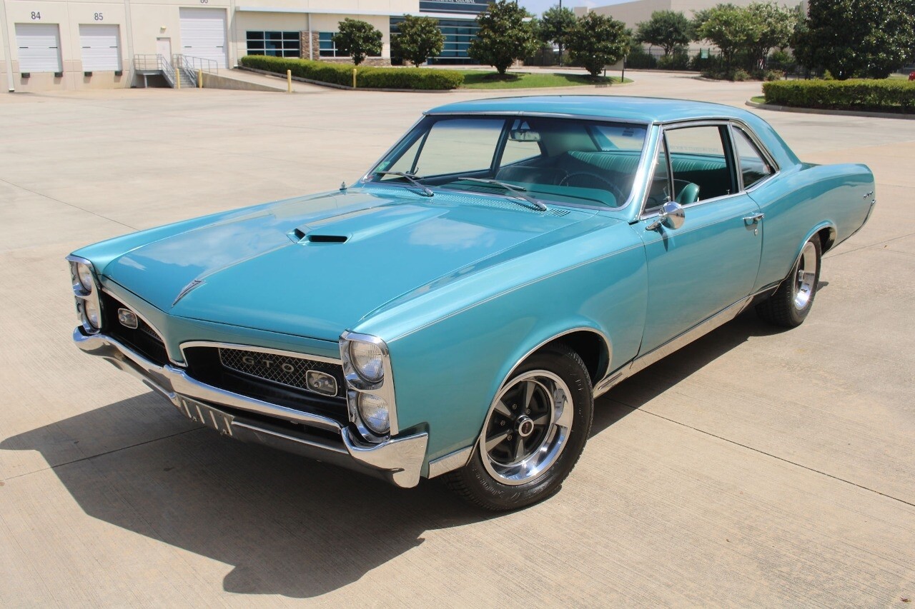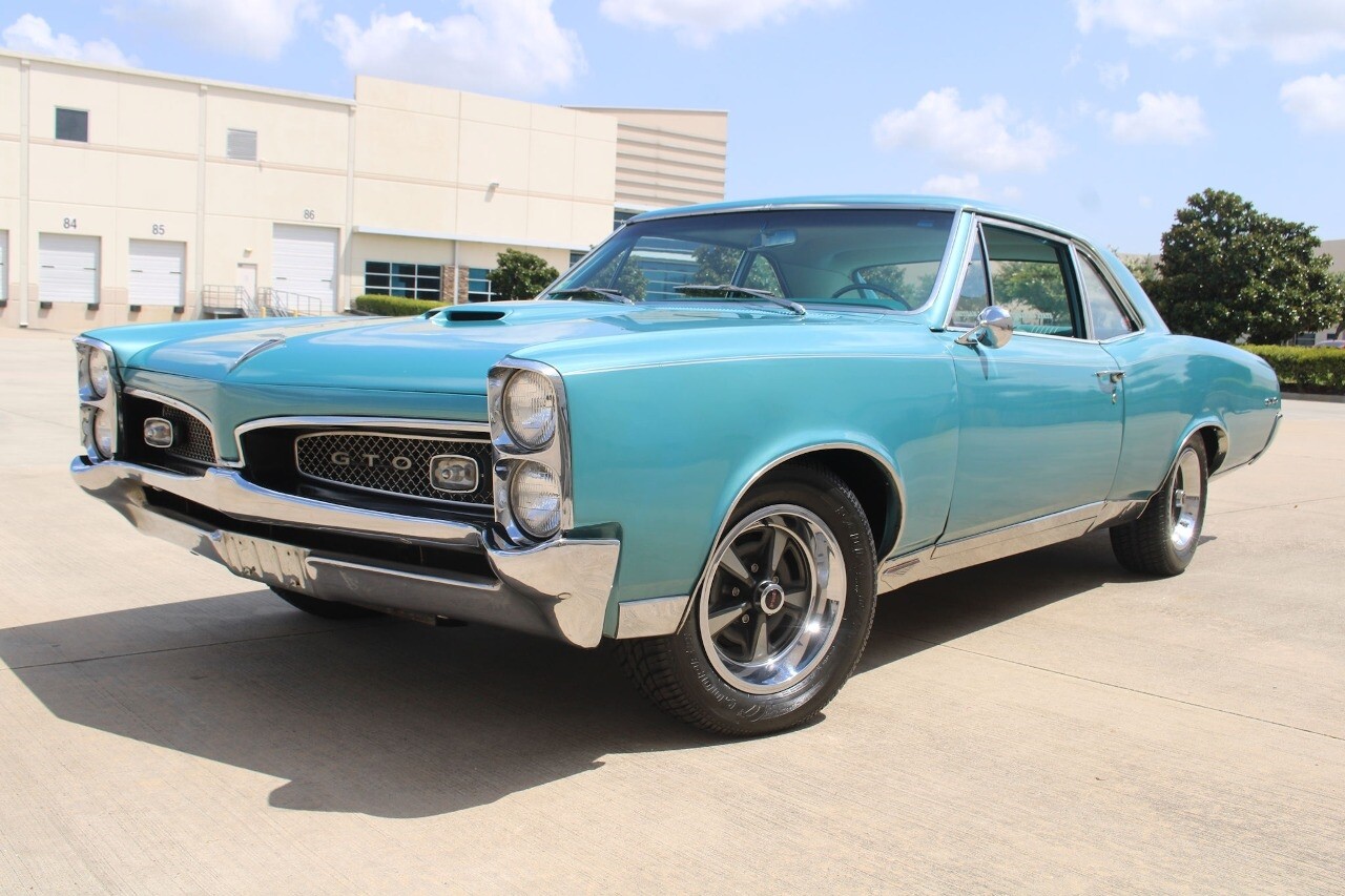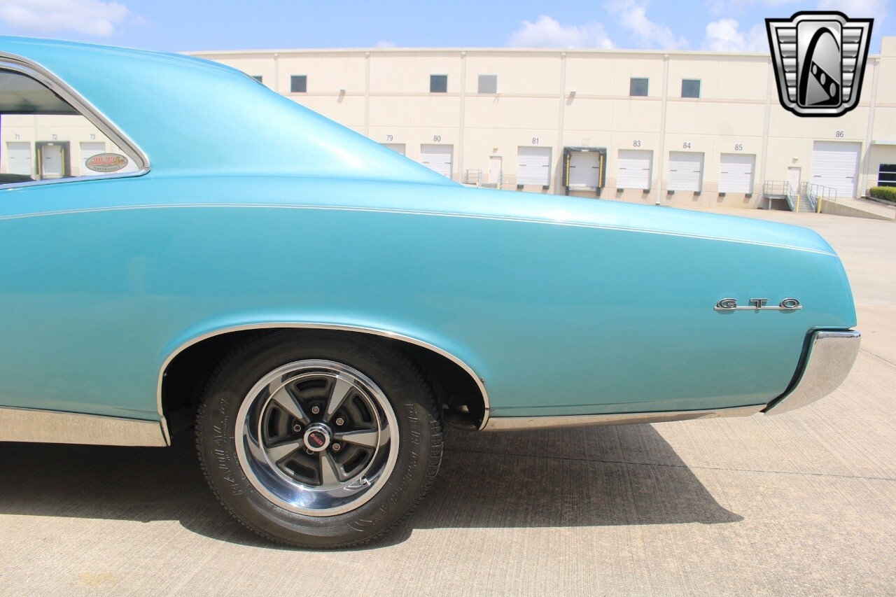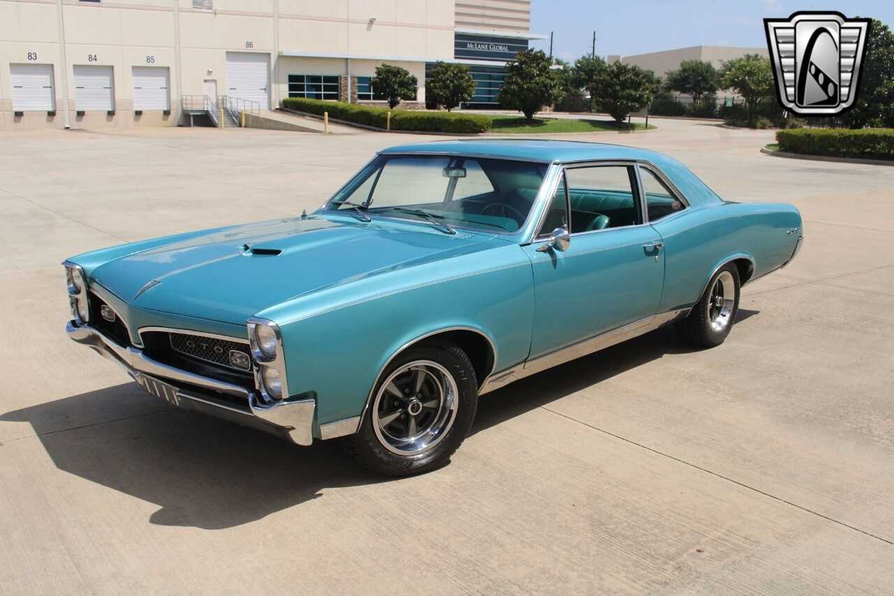 Gateway Classic Cars Houston Showroom is excited to present this stunning aqua 1967 Pontiac GTO for sale. Under the hood lies a powerful V8 engine backed by a 4-speed manual transmission. It has received some tasteful upgrades, including headers, a rebuilt QuadraJet from Ames Performance (featuring ethanol-resistant parts), a stainless steel fuel tank, high torque mini starter, a larger 4-core radiator, and the rear end has a limited slip differential and 3.55:1 gears. Step inside to find a unique green vinyl interior that not only offers a comfortable ride but also adds a touch of vintage charm to this iconic vehicle. While the car is equipped with air conditioning, it's in need of some work to get it back to its original cooling performance. Its AM/FM radio also is in need of some TLC to get it operating (or you can replace the original with a vintage-style unit from RetroSound). The inclusion of power steering and power brakes simplifies driving, providing you with full control and confidence behind the wheel. This GTO rides on durable radial tires, ensuring a smooth and stable drive, while seatbelts offer added safety for you and your passengers. This car will also come with the original Protecto-Plate and its owner's manual. Don't miss your chance to own a piece of automotive history with this 1967 Pontiac GTO. Its blend of performance, style, and comfort makes it a standout choice for any classic car enthusiast..