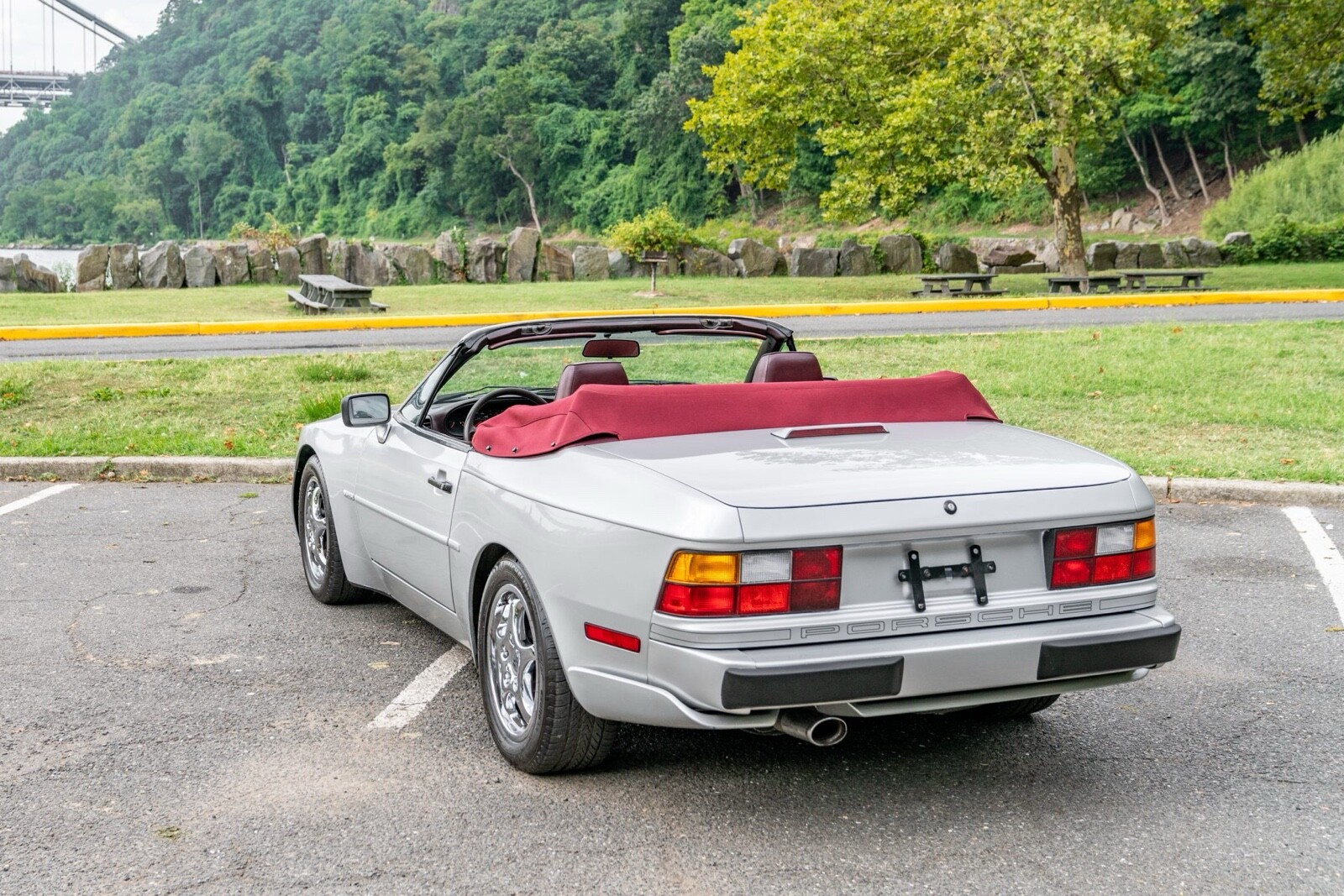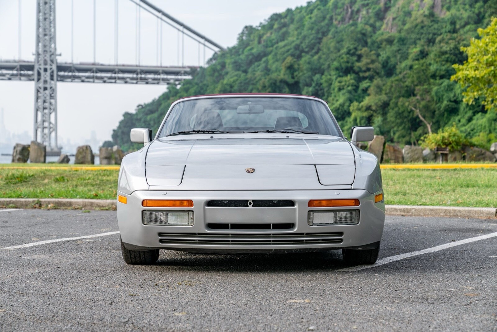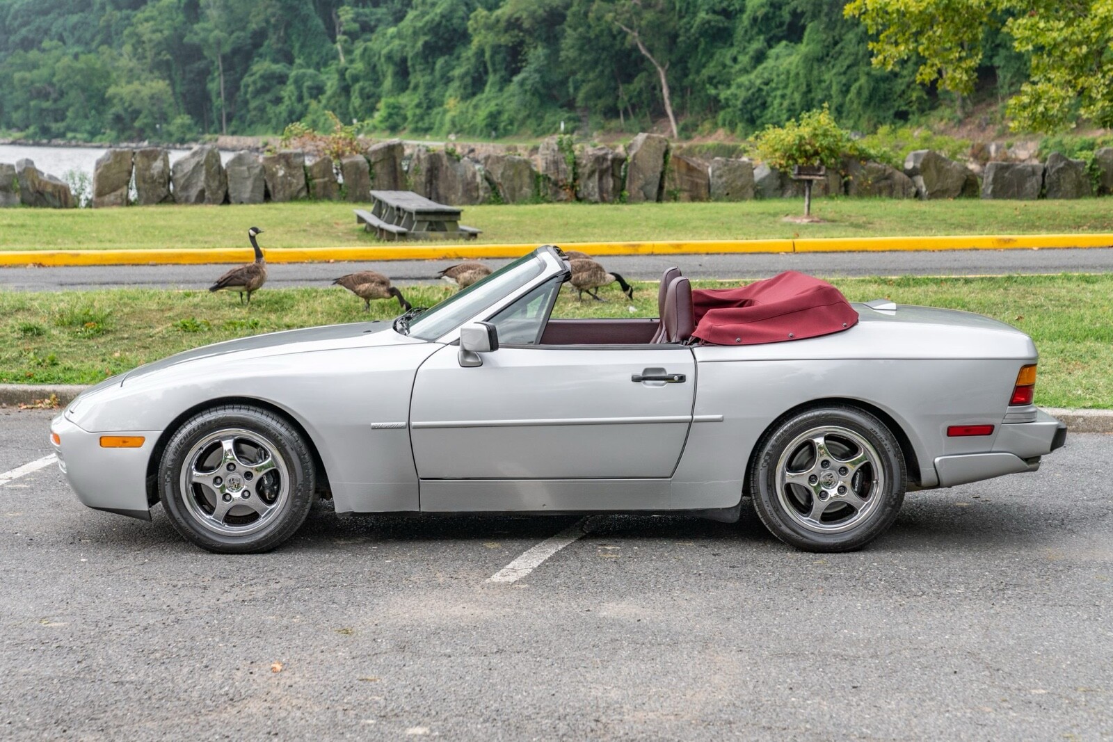 This 1990 Porsche 944 S2 cabriolet is powered by a 3.0-liter inline-four paired with a five-speed manual transaxle and is finished in silver over Burgundy leather. Equipment includes a Burgundy convertible soft top, 16? five-spoke wheels, anti-lock brakes, pop-up headlights, fog lights, a power-adjustable drivers seat, an Alpine in-dash CD changer, cruise control, dual front airbags, and automatic climate control.