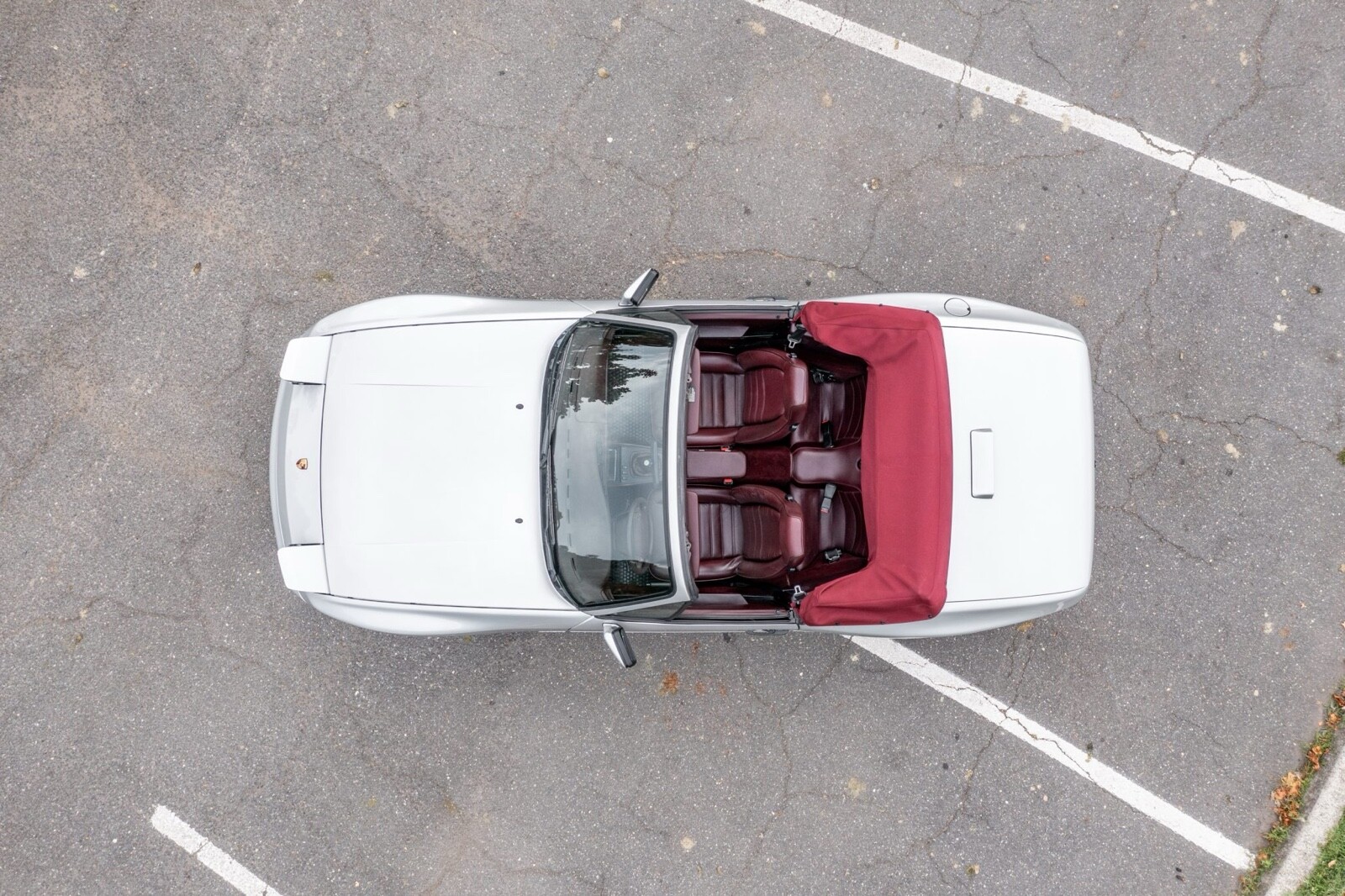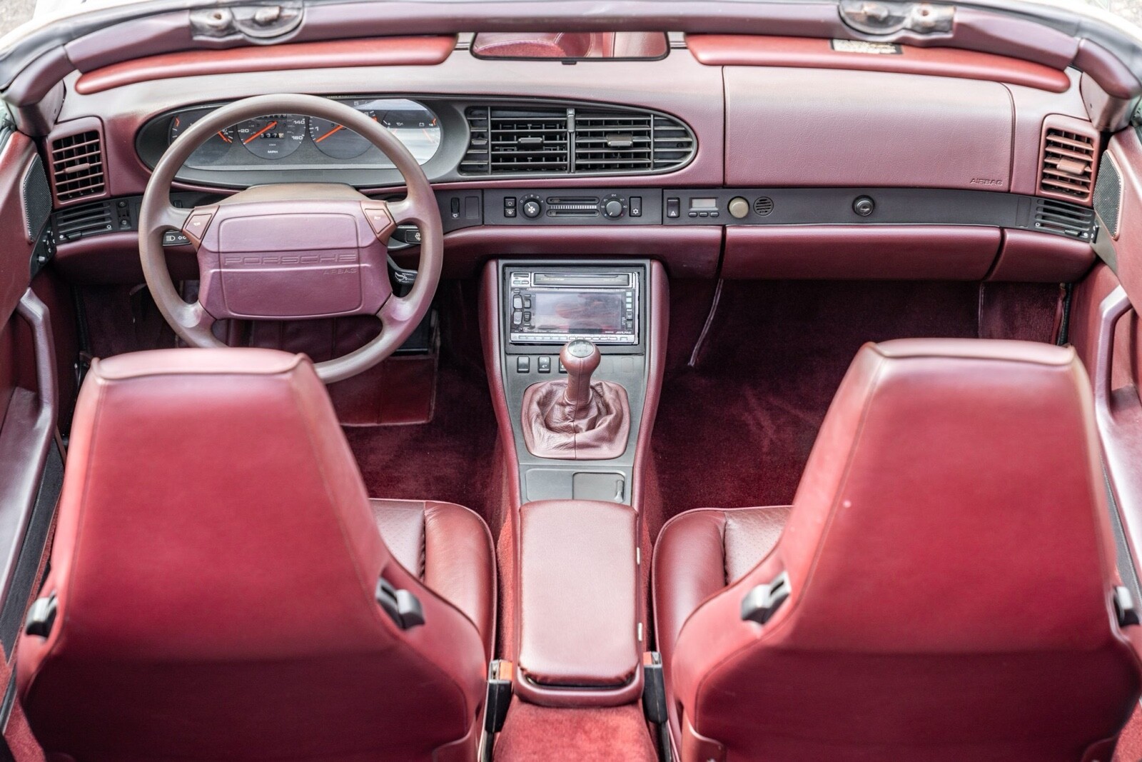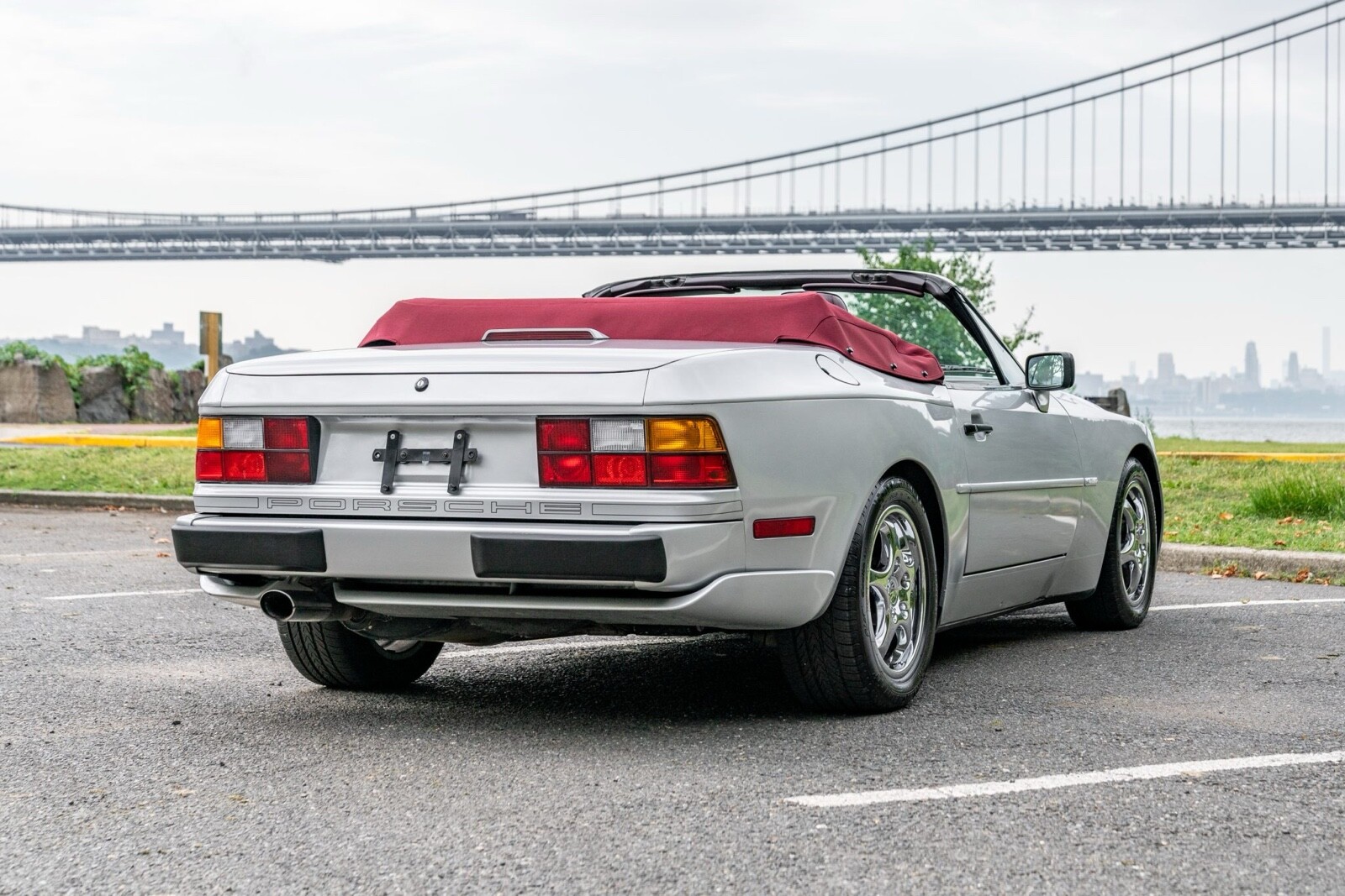 This 1990 Porsche 944 S2 cabriolet is powered by a 3.0-liter inline-four paired with a five-speed manual transaxle and is finished in silver over Burgundy leather. Equipment includes a Burgundy convertible soft top, 16? five-spoke wheels, anti-lock brakes, pop-up headlights, fog lights, a power-adjustable drivers seat, an Alpine in-dash CD changer, cruise control, dual front airbags, and automatic climate control.