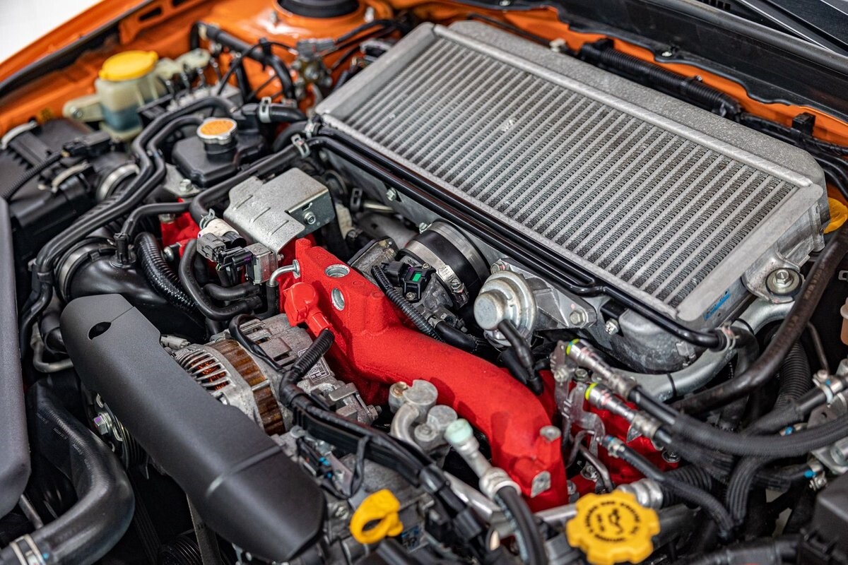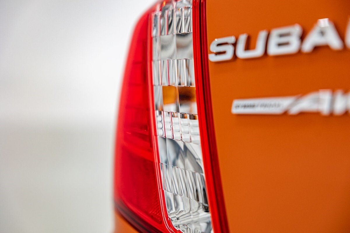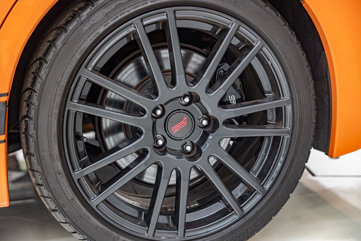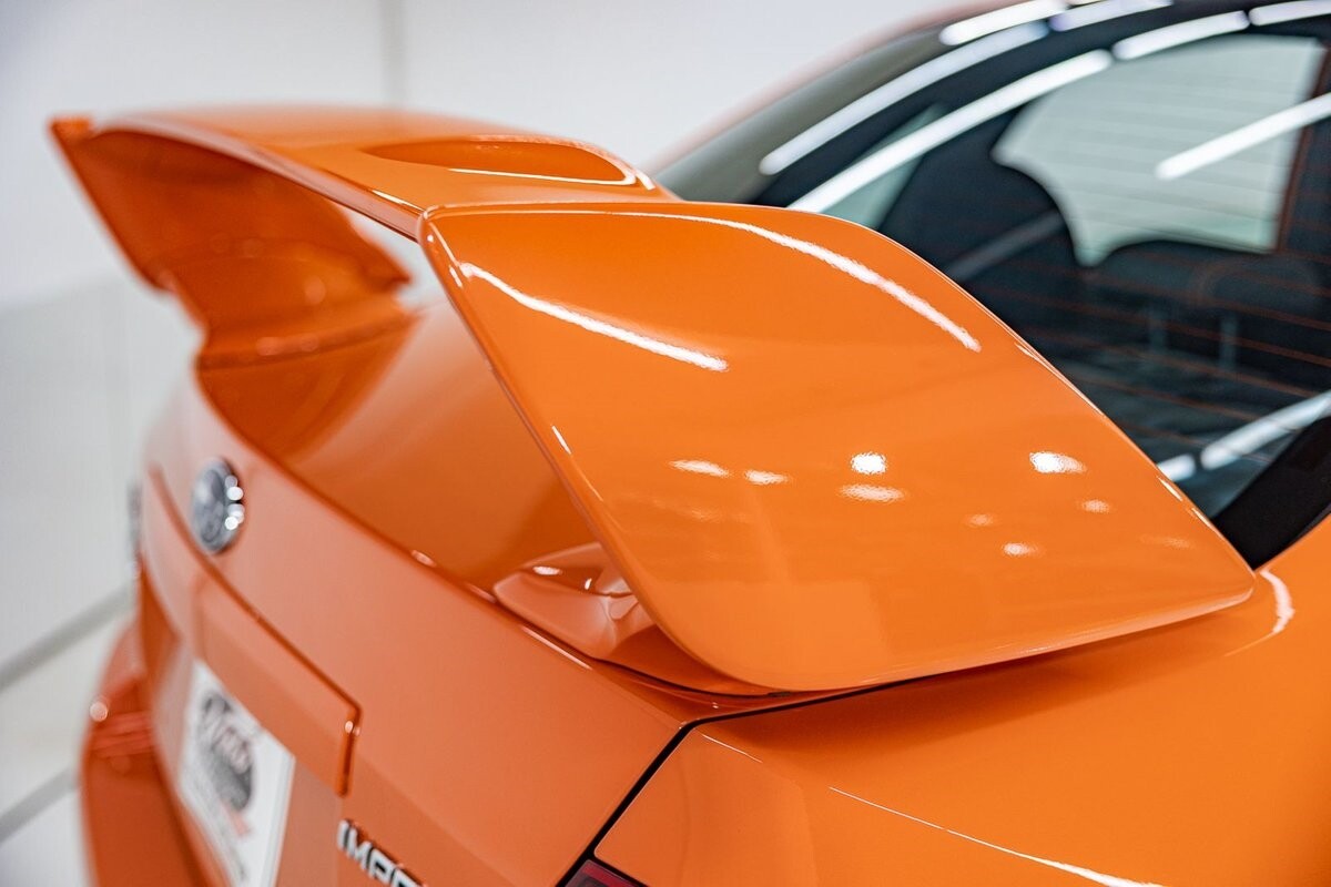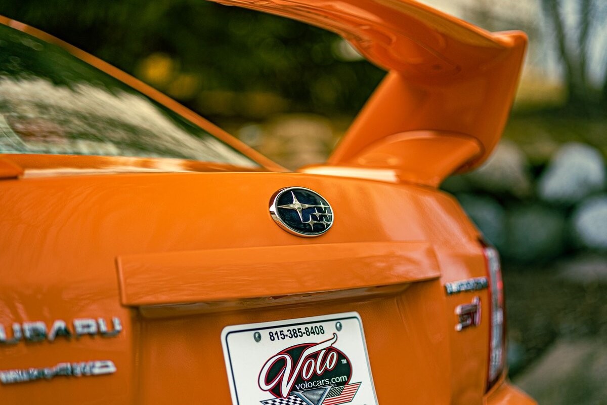 EXTERIOR: Finished in tangerine orange pearl, this Subaru certainly stands out to those Halloween lovers. The trim is accented in black as well as the black vinyl decals along the lower portion of the car. It's finished in STI appearance trim giving it the larger hood scoop, lower front lip, STI side skirts, and massive STI rear wing. The wheels are a gloss black 18" forged BBS wheel with a very grippy all season tire wrapped around them with plenty of tread, The exhaust out the rear bumper is quad tipped dual giving off that nice rumble Subarus are known for. Overall, with 7,000 original miles this car is in showroom condition.