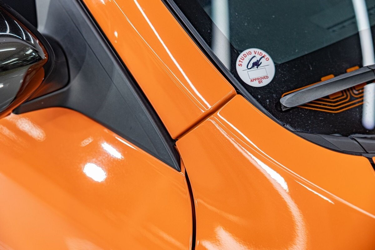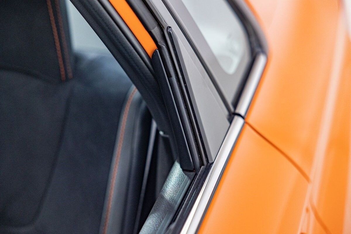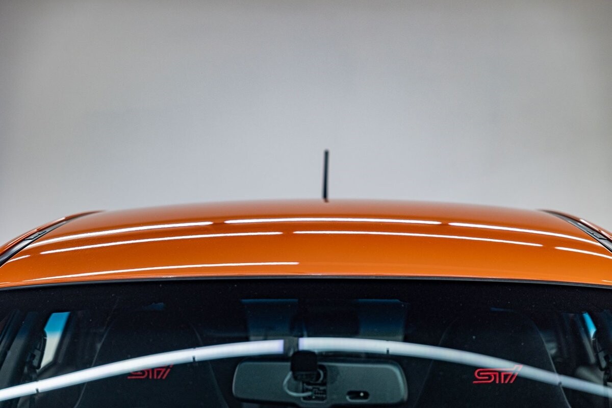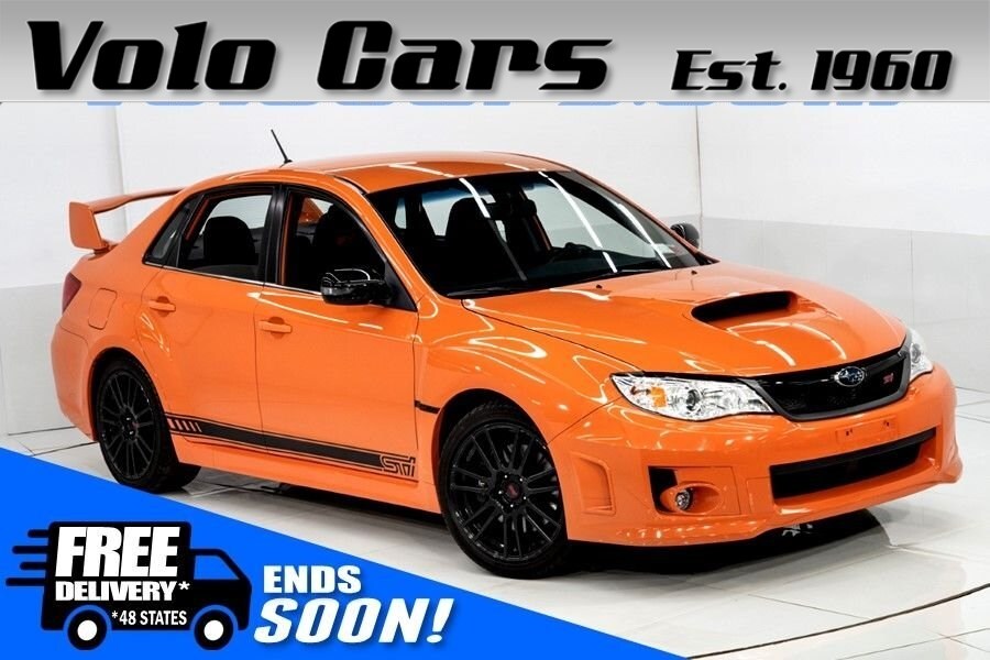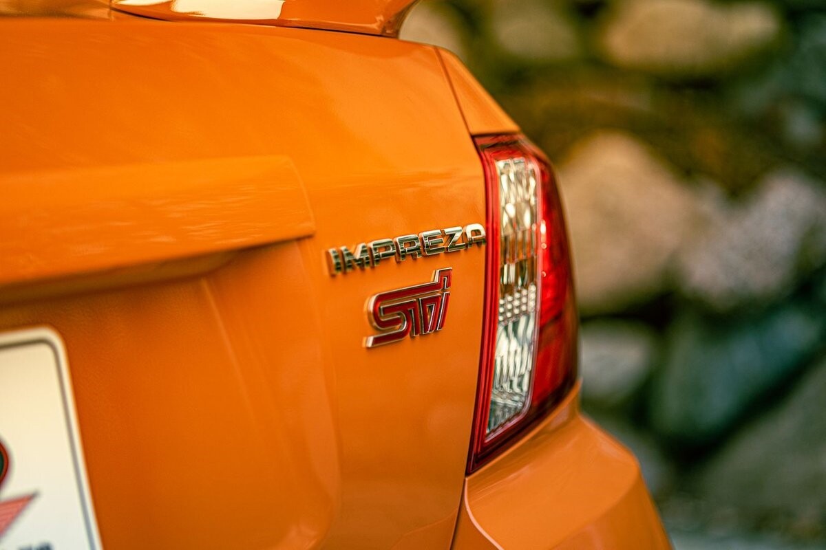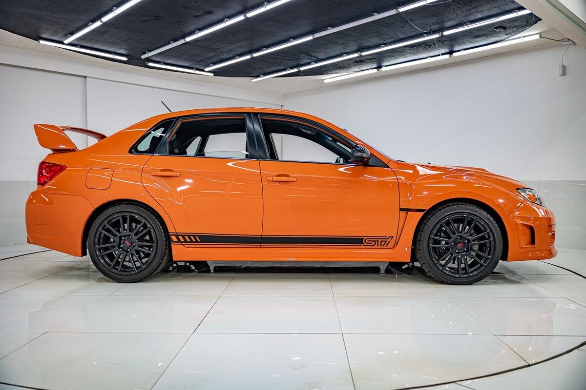 EXTERIOR: Finished in tangerine orange pearl, this Subaru certainly stands out to those Halloween lovers. The trim is accented in black as well as the black vinyl decals along the lower portion of the car. It's finished in STI appearance trim giving it the larger hood scoop, lower front lip, STI side skirts, and massive STI rear wing. The wheels are a gloss black 18" forged BBS wheel with a very grippy all season tire wrapped around them with plenty of tread, The exhaust out the rear bumper is quad tipped dual giving off that nice rumble Subarus are known for. Overall, with 7,000 original miles this car is in showroom condition.