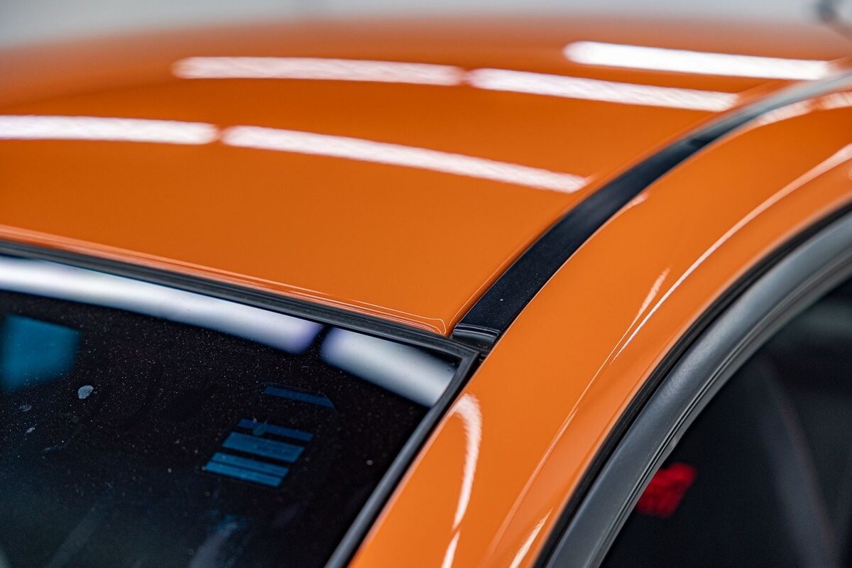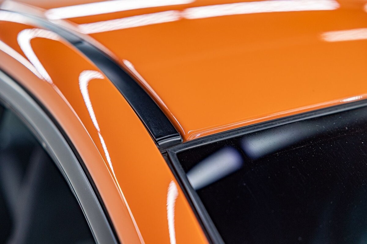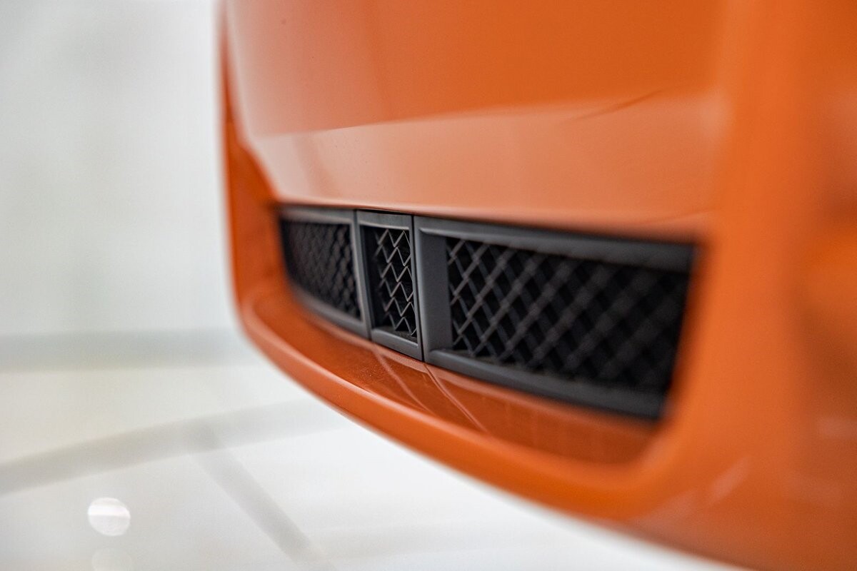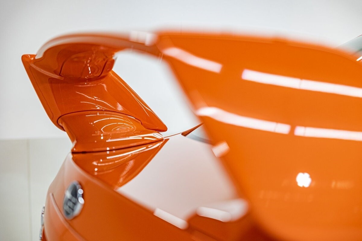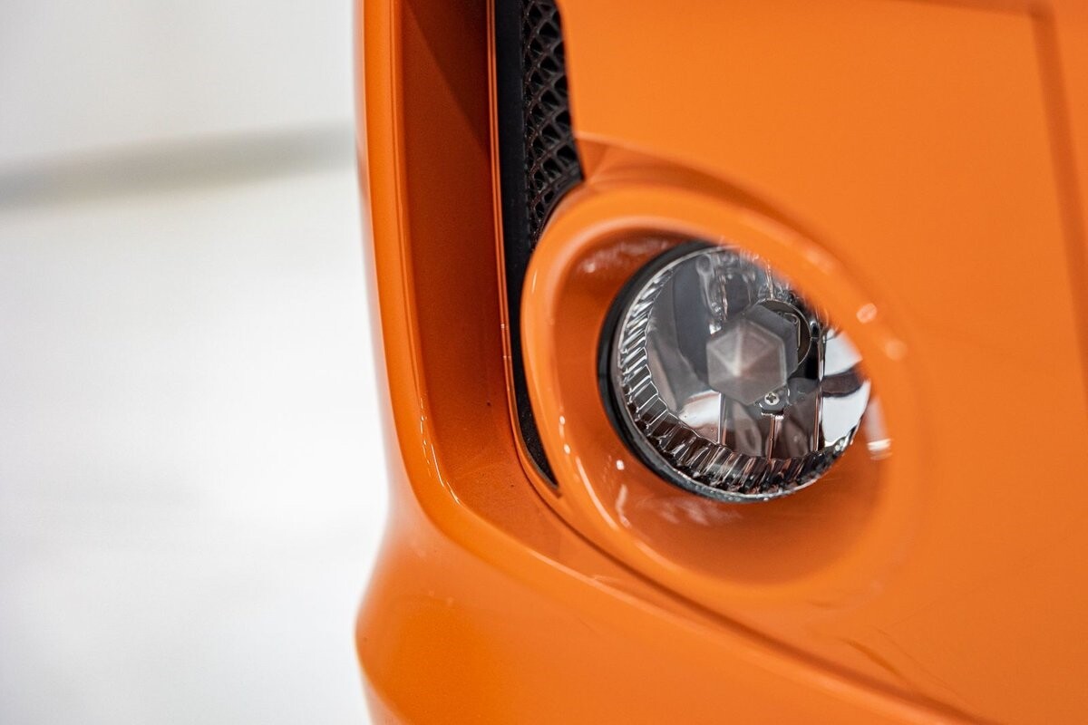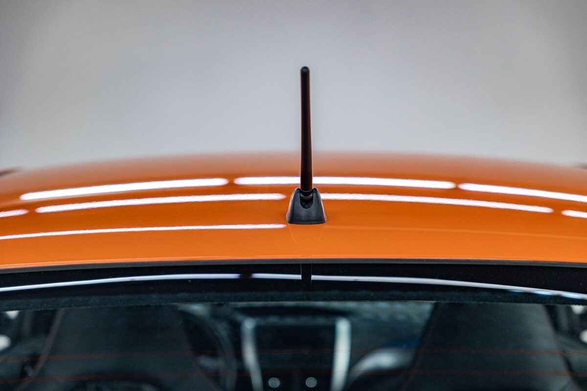 EXTERIOR: Finished in tangerine orange pearl, this Subaru certainly stands out to those Halloween lovers. The trim is accented in black as well as the black vinyl decals along the lower portion of the car. It's finished in STI appearance trim giving it the larger hood scoop, lower front lip, STI side skirts, and massive STI rear wing. The wheels are a gloss black 18" forged BBS wheel with a very grippy all season tire wrapped around them with plenty of tread, The exhaust out the rear bumper is quad tipped dual giving off that nice rumble Subarus are known for. Overall, with 7,000 original miles this car is in showroom condition.