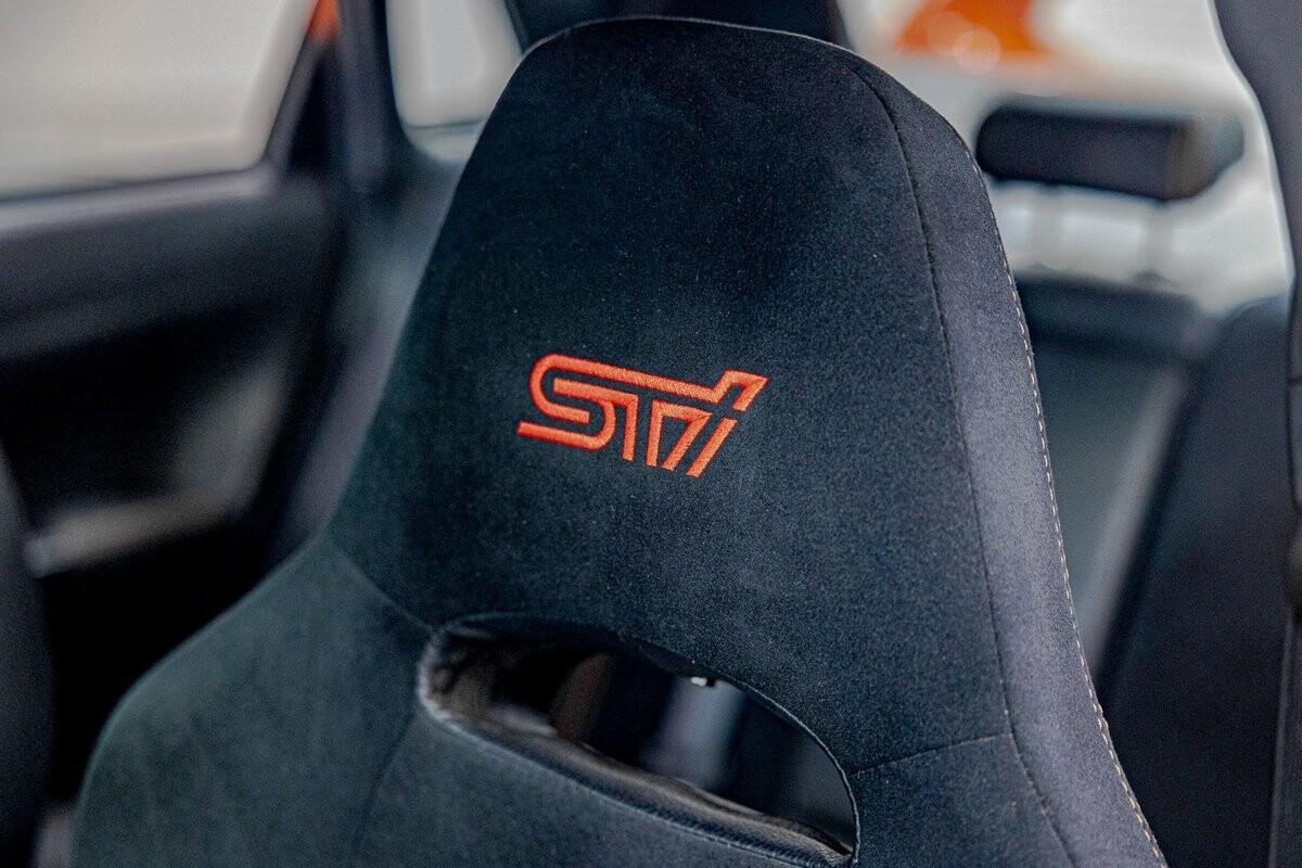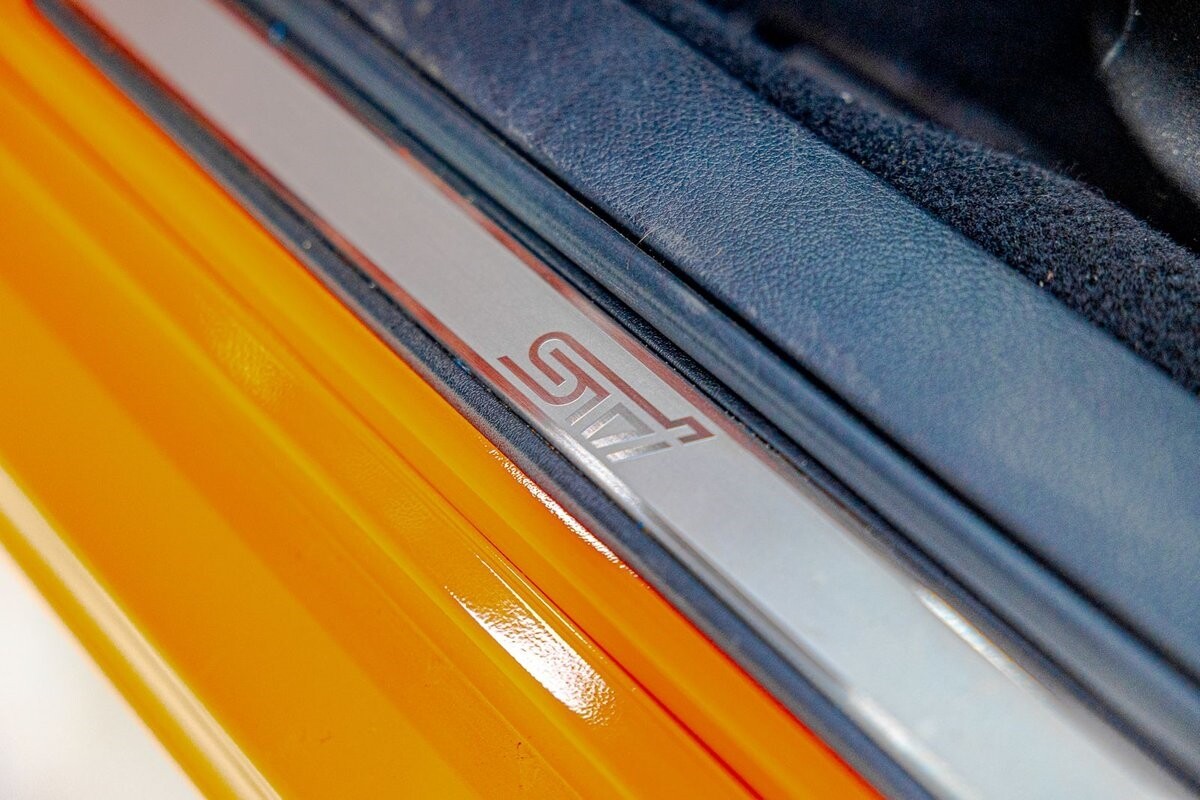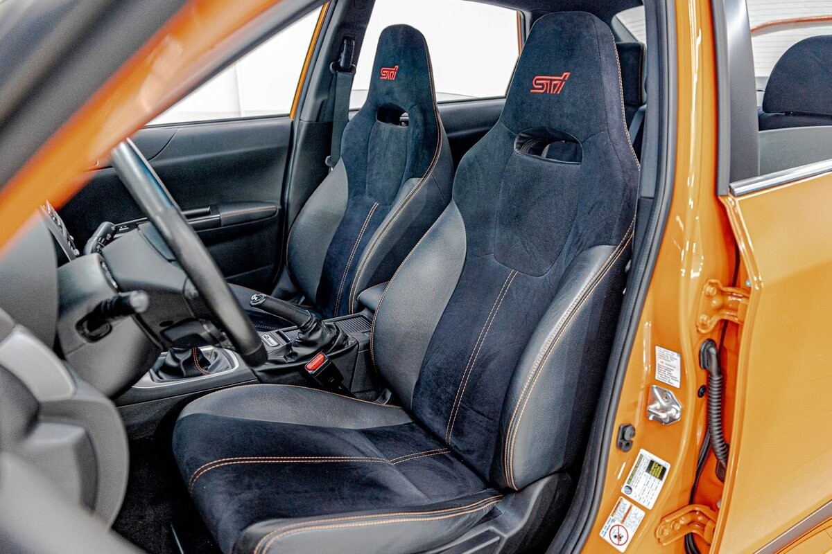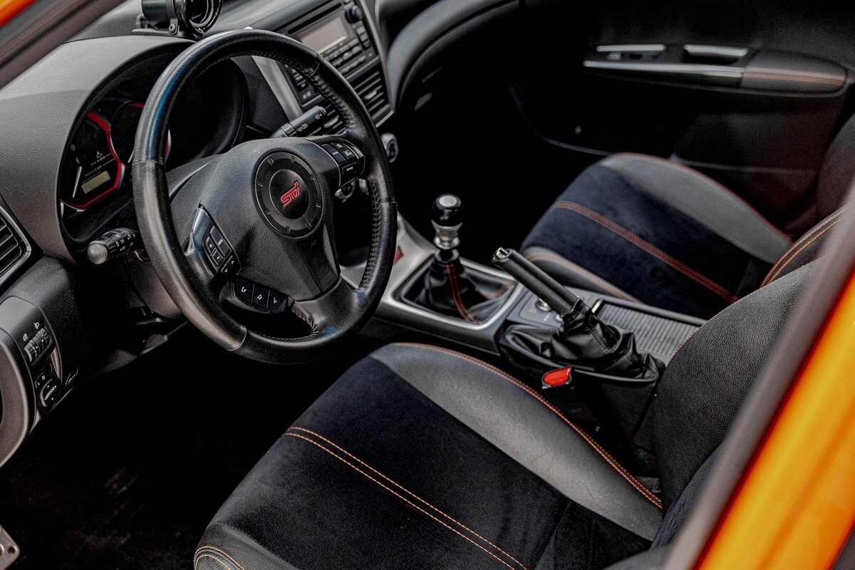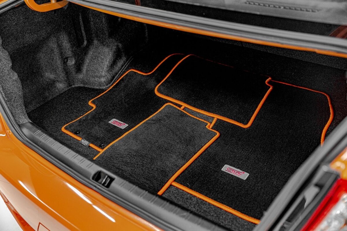INTERIOR: The interior is finished in STI stitching. The black leather is tied together with that exclusive special edition orange stitch. The floor mats have the same matching orange stitching and are stored in the trunk, having never been installed! The front seats are heated sport buckets with STI logos on the headrest area. The center console has a light up STI logo. The shift knob, steering wheel, and e Brake handle are all leather wrapped with stitching. The shift boot matches the rest of the trim with orange stitching. Overall, its spotless in the interior, just like how it was new! This car has nice features like heated front seats, tilt steering wheel, cruise control, hands free radio, and air conditioning. All very usable while rallying this through the streets or track!