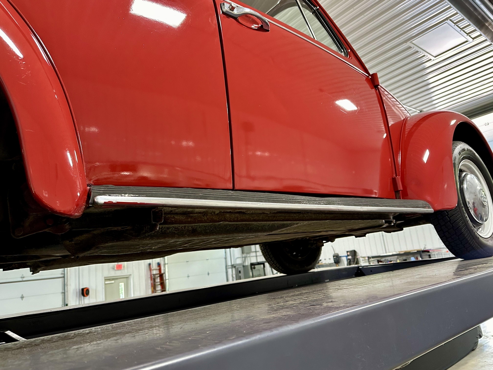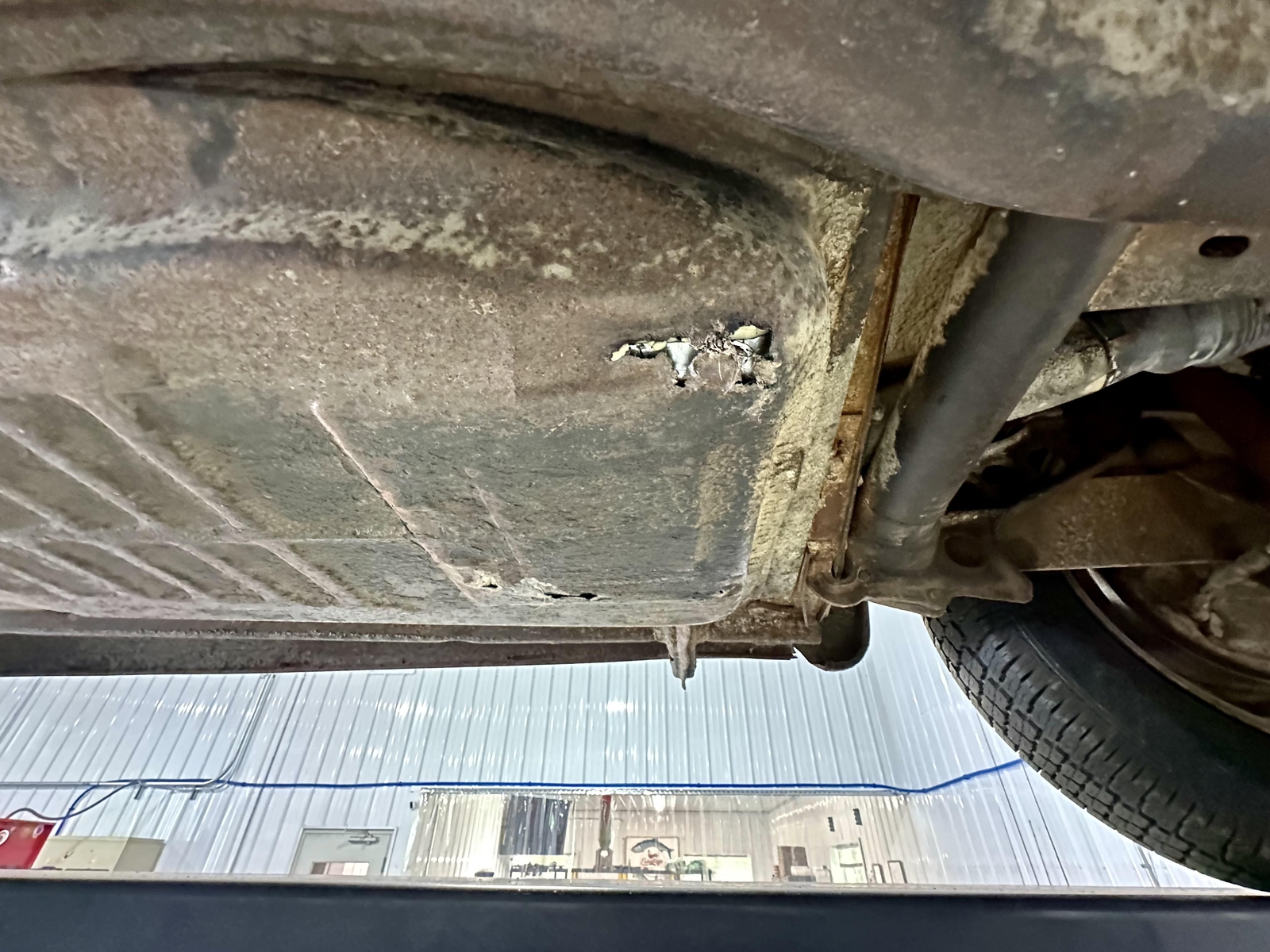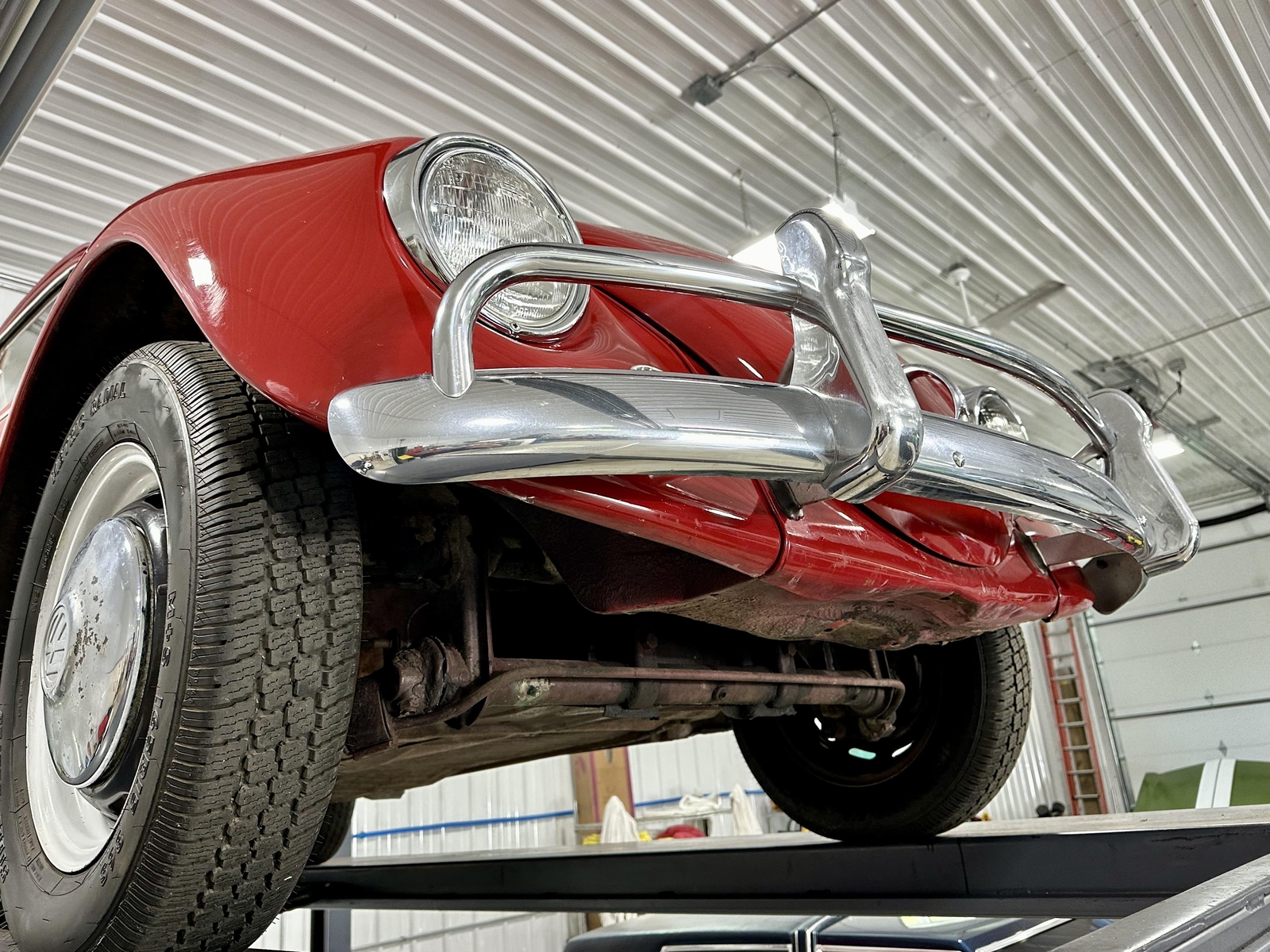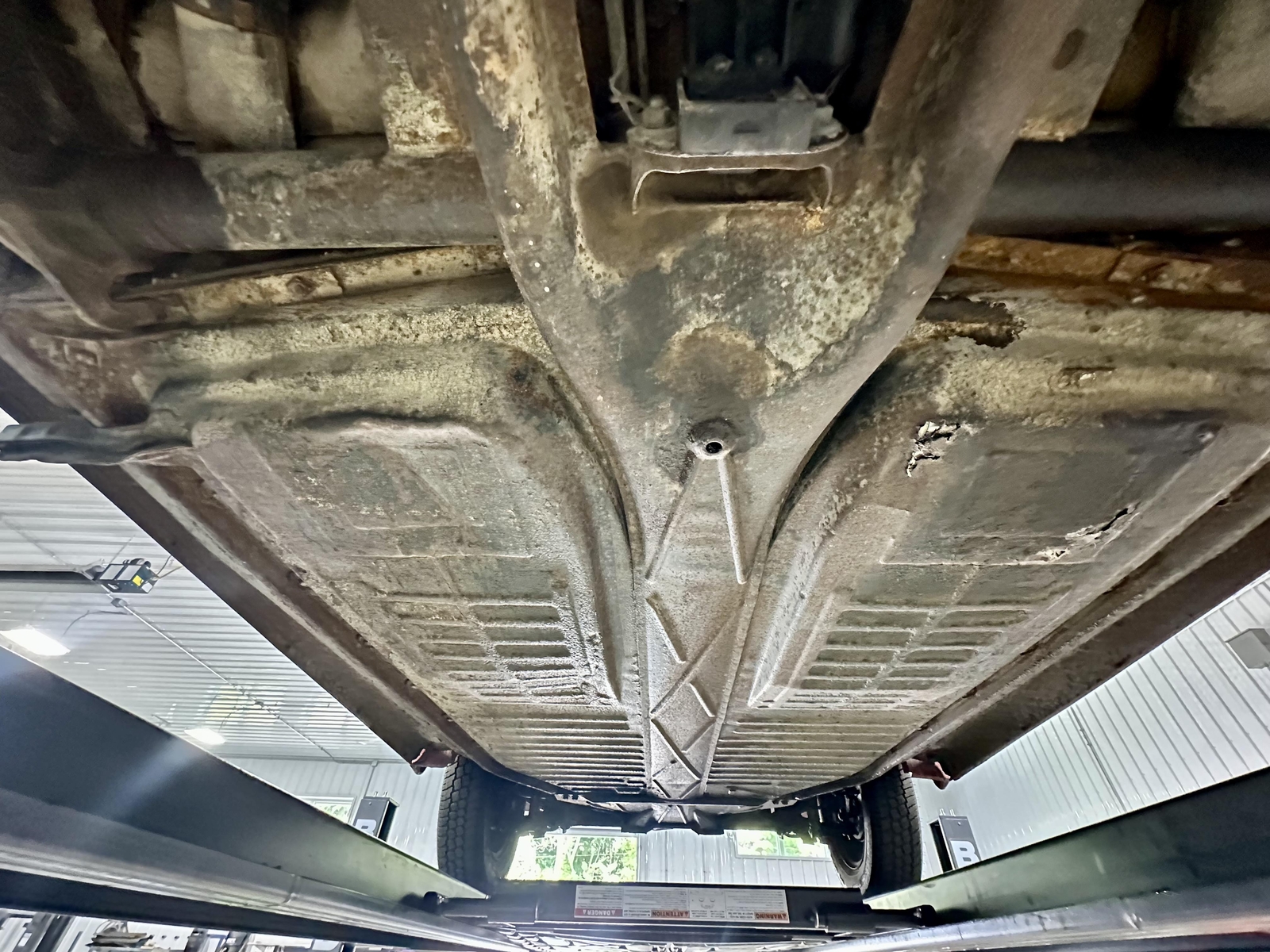 The underside is solid and dry, with a small repaired spot under the battery tray area, likely from an older unsealed acid battery leak. The unibody is structurally sound from front to back. The engine bay is clean and tidy, featuring a replacement 1600cc 126 Industrial Flat 4. While we don't know when the engine was swapped, it appears professionally done.