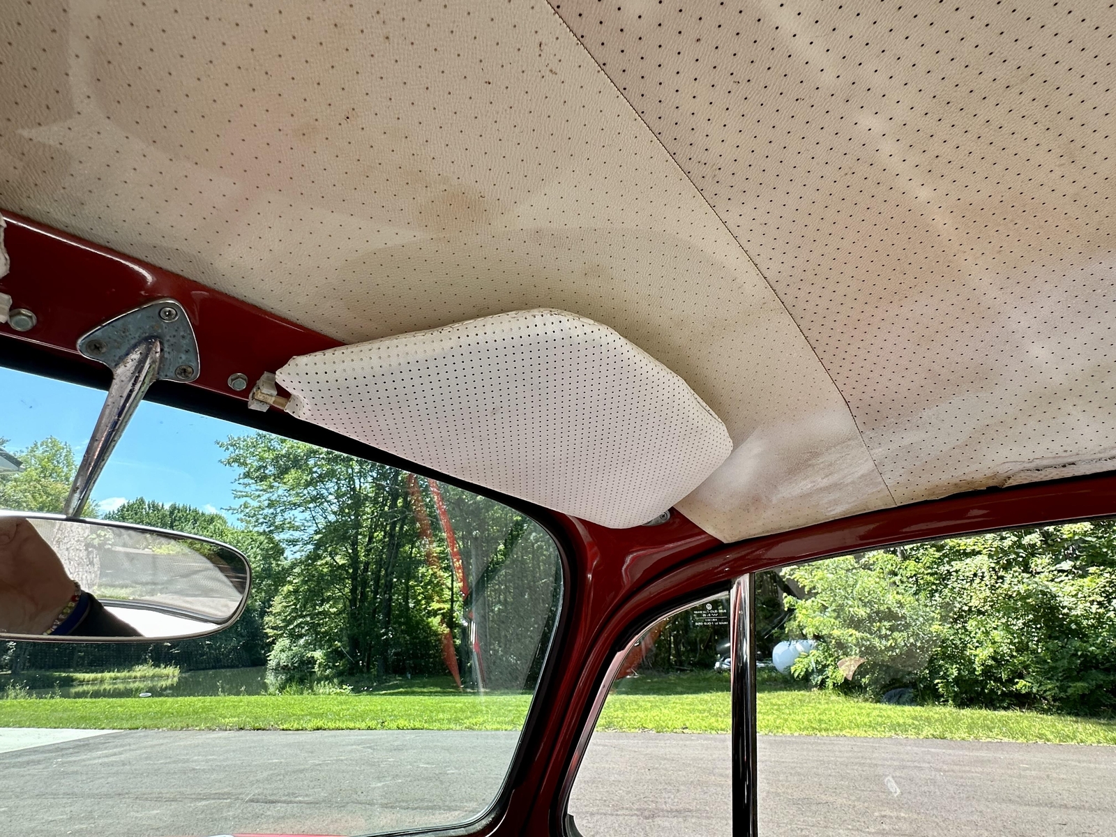The interior is in beautiful condition, with black vinyl seats looking fantastic both front and back. The carpets are in good condition, and the door panels and hardware look great. The dash is original, down to the non-functioning radio. The gauges work properly and look great. The headliner has some patched holes and could benefit from being redone at some point, though it is currently taut and acceptable. All switches work properly and are in good condition.