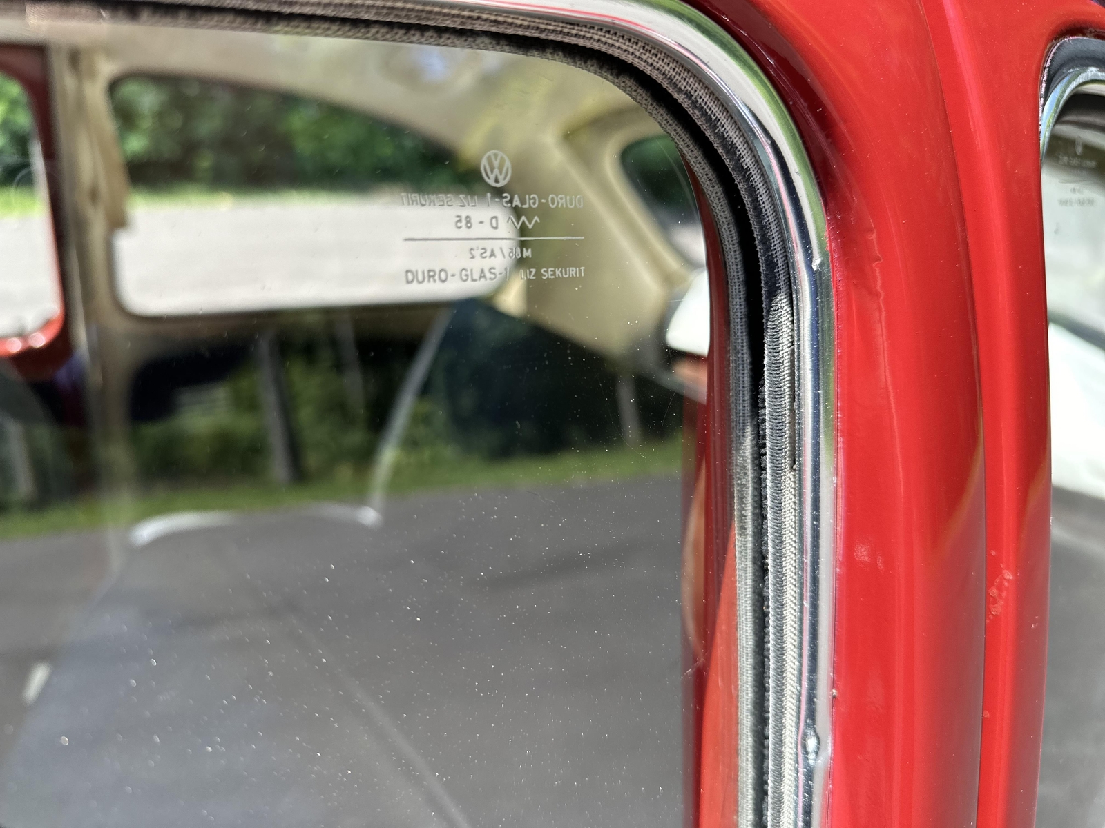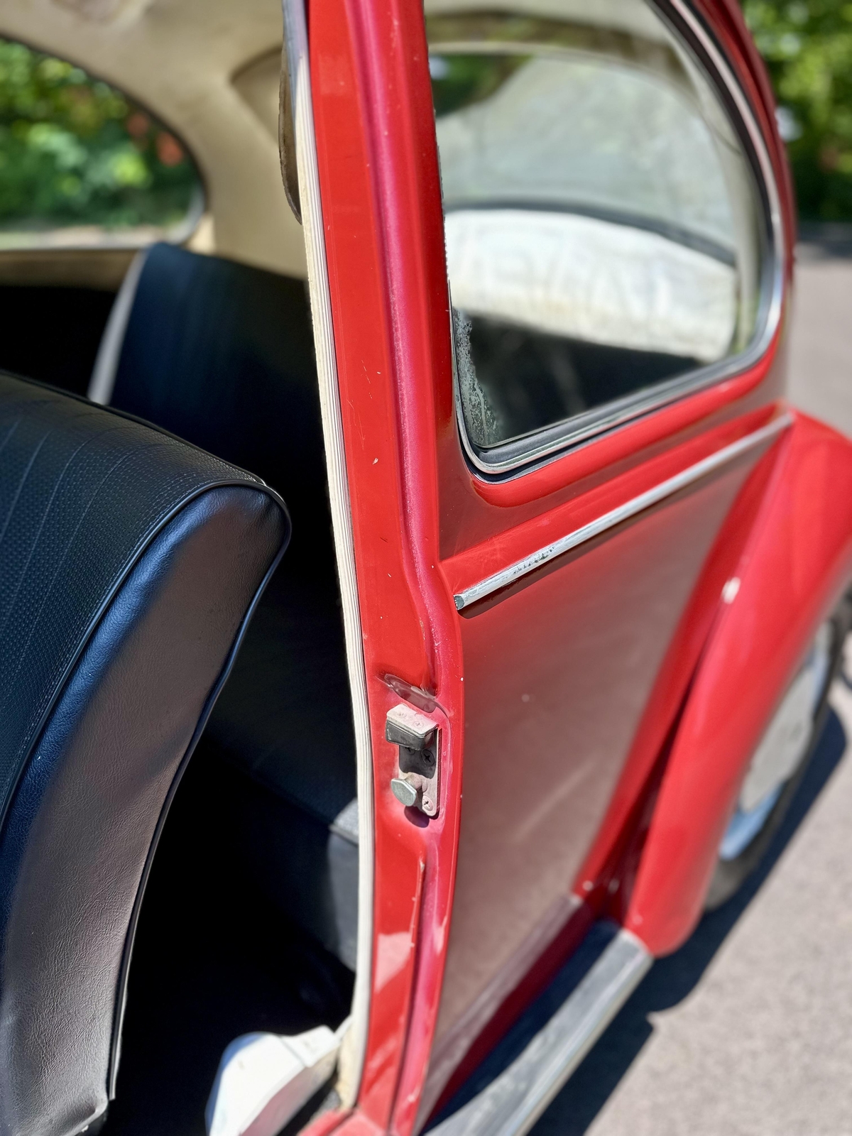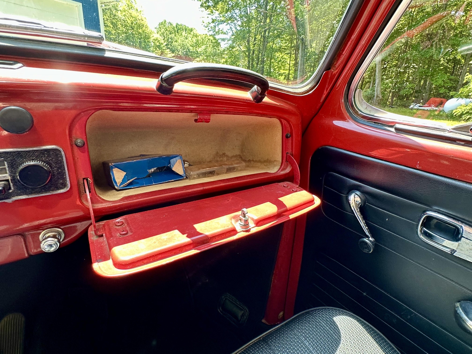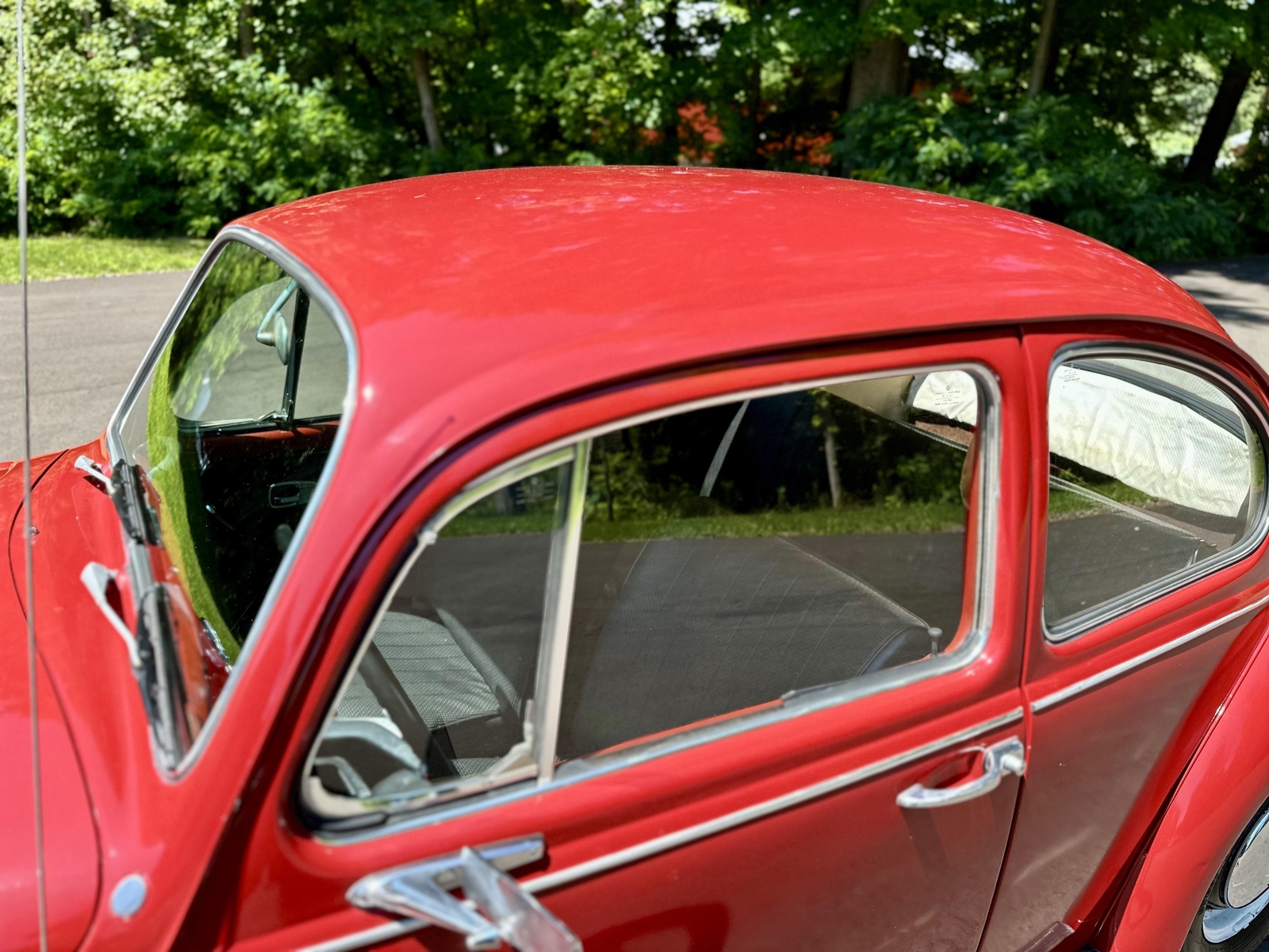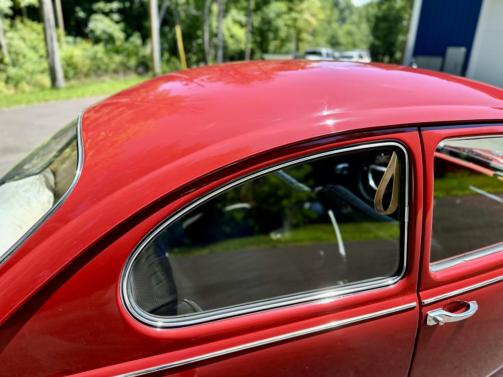 The exterior presents well, free from rust or unsightly bodywork. While there are some dents, scratches, and touchups as expected for its age, it still looks quite good. It appears to have been resprayed within the last 25 years, with some mild overspray on the rubber trim. The paintwork is satisfactory and consistent. OEM glass is present throughout, with a replacement windshield noted. The trim and hardware kit are intact and in good condition, as are the bumpers, though some dry trim pieces could be replaced. The panel fitment is nice and consistent. The car still sports its original dealer badge. The tires are in good shape and perform well on the road. The lights appear largely original and function properly. There are some door dings on the right-hand side, likely from garage storage. Overall, this Beetle presents nicely and is ready to be enjoyed on the road and at events.