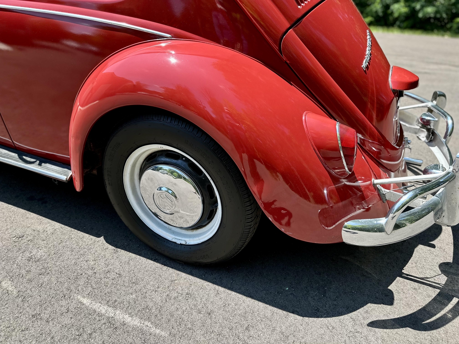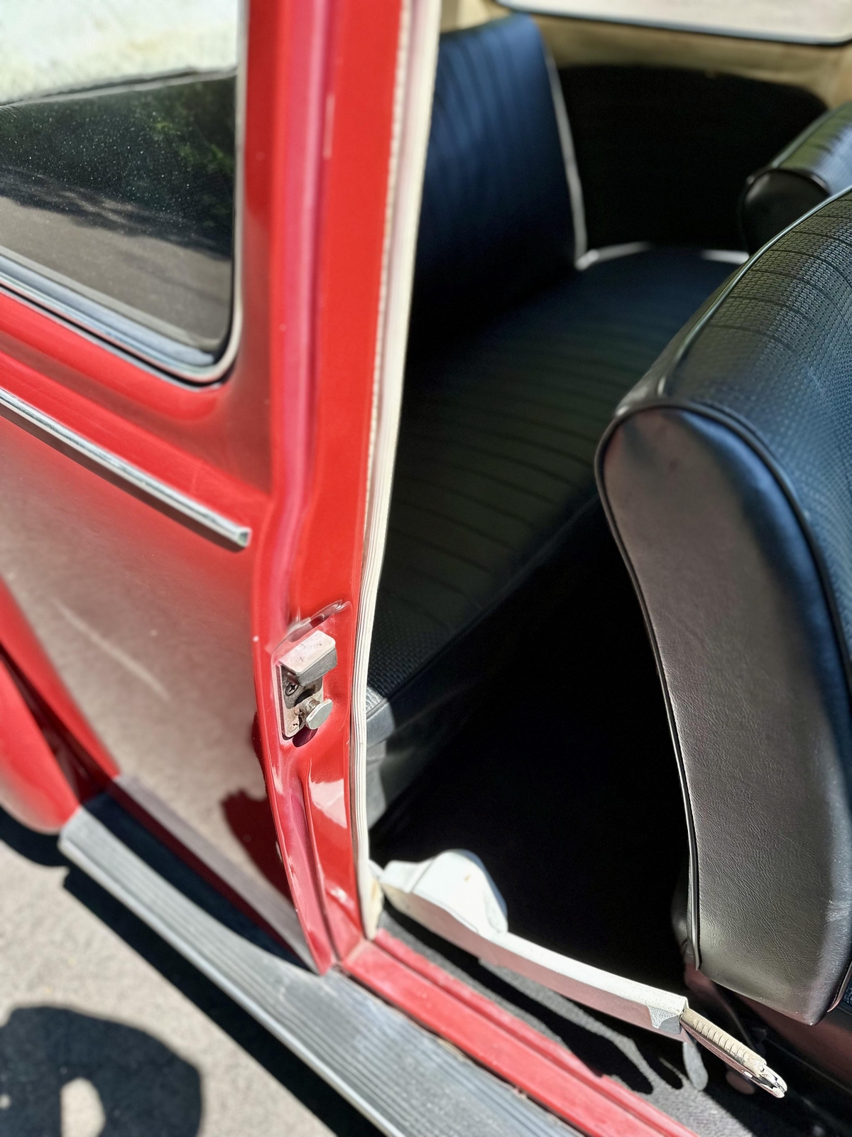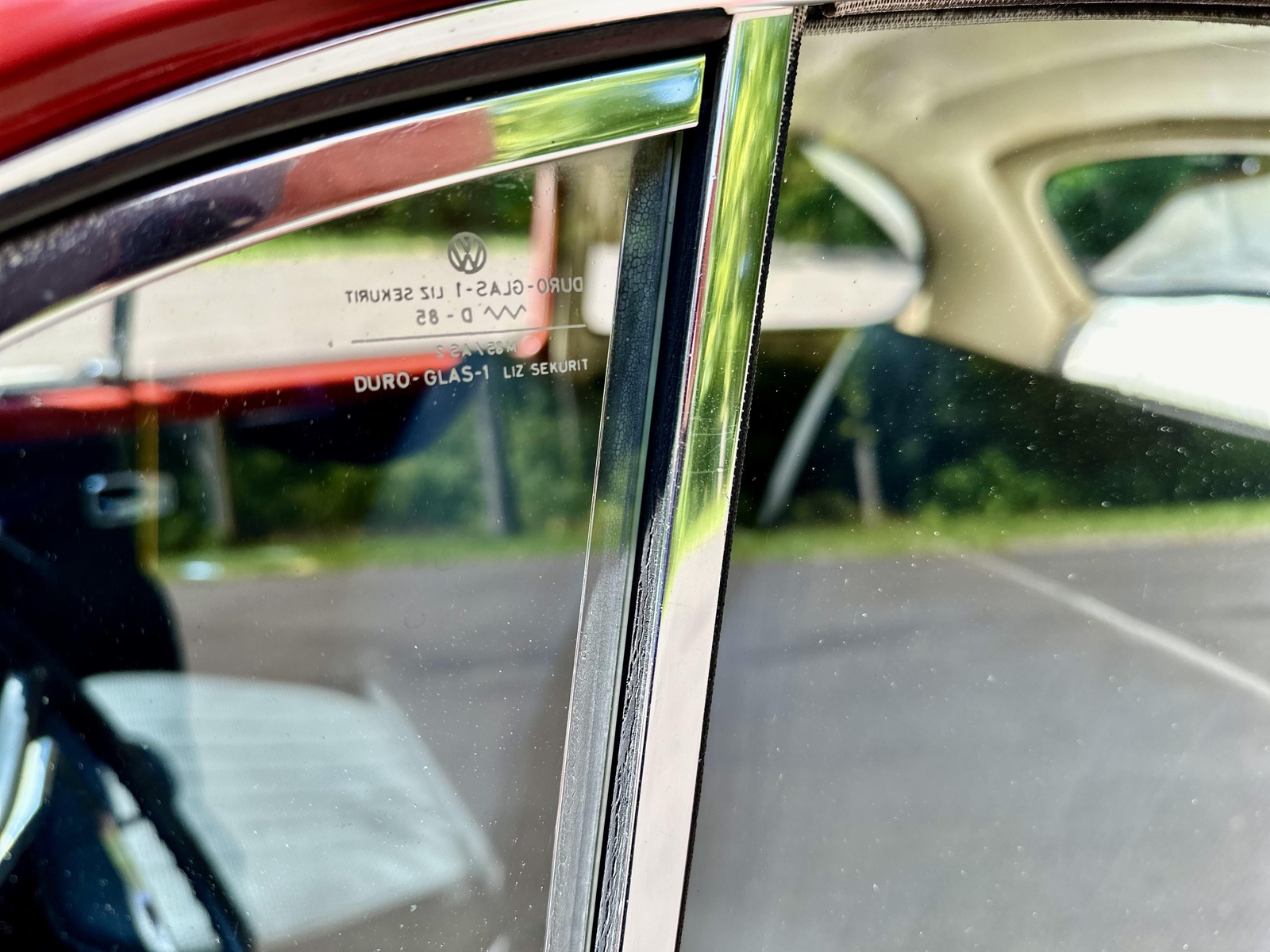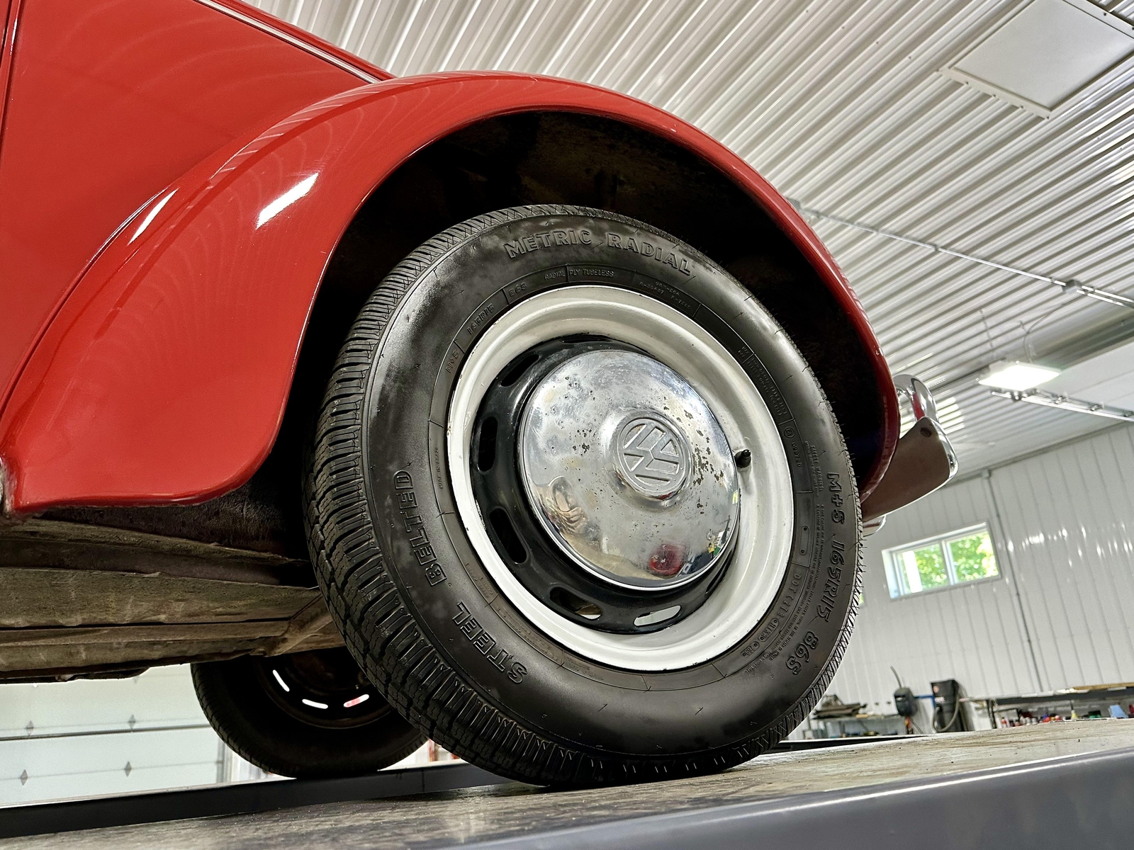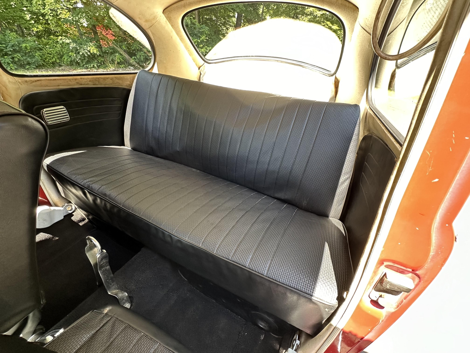 The exterior presents well, free from rust or unsightly bodywork. While there are some dents, scratches, and touchups as expected for its age, it still looks quite good. It appears to have been resprayed within the last 25 years, with some mild overspray on the rubber trim. The paintwork is satisfactory and consistent. OEM glass is present throughout, with a replacement windshield noted. The trim and hardware kit are intact and in good condition, as are the bumpers, though some dry trim pieces could be replaced. The panel fitment is nice and consistent. The car still sports its original dealer badge. The tires are in good shape and perform well on the road. The lights appear largely original and function properly. There are some door dings on the right-hand side, likely from garage storage. Overall, this Beetle presents nicely and is ready to be enjoyed on the road and at events.