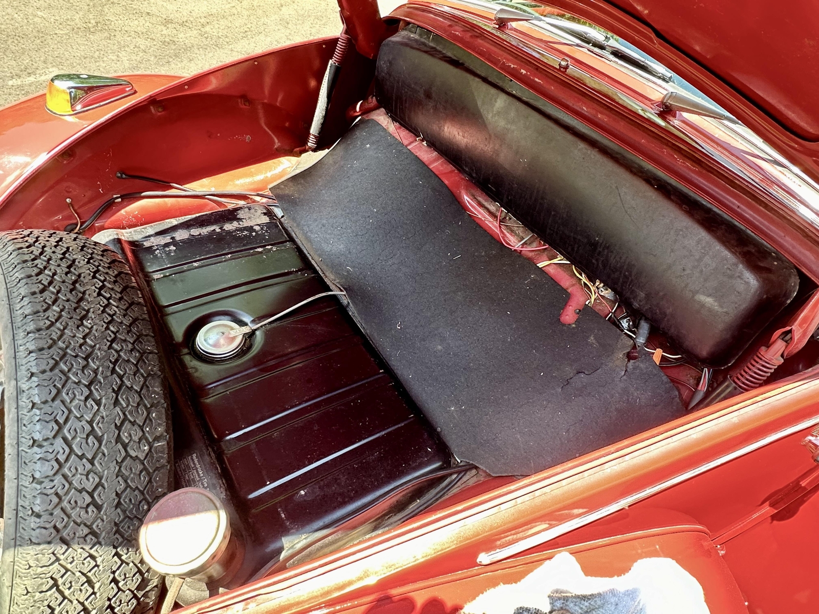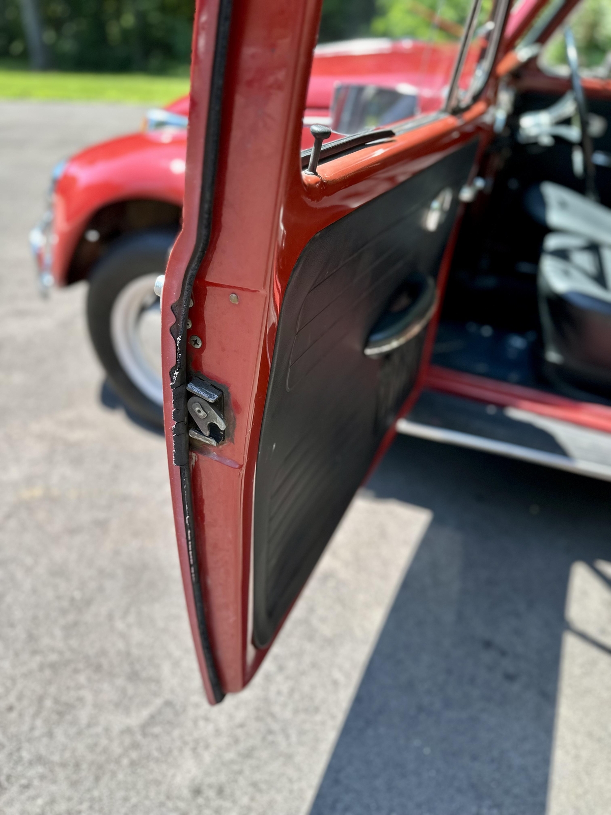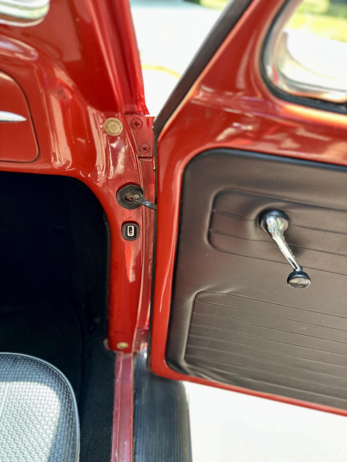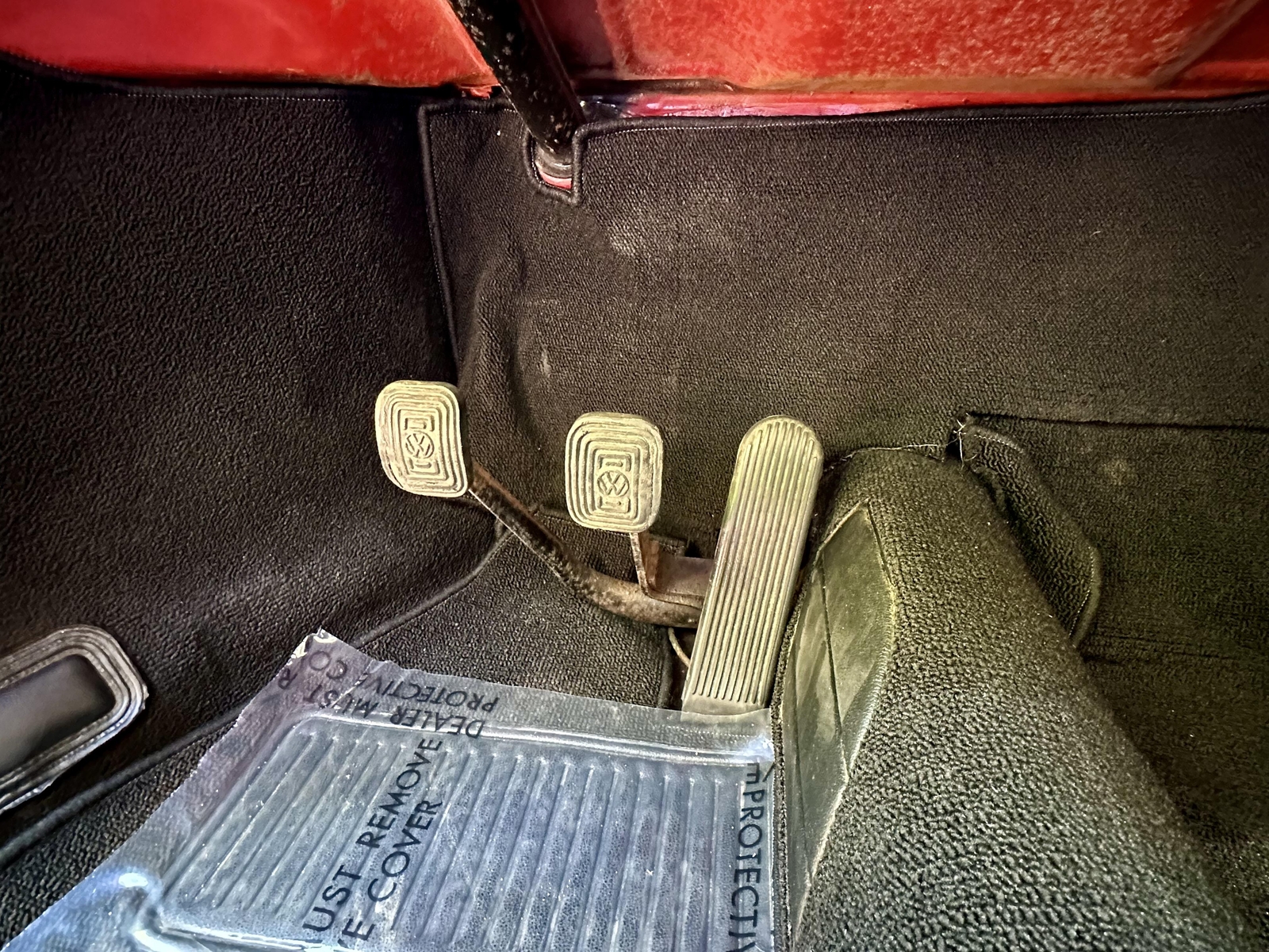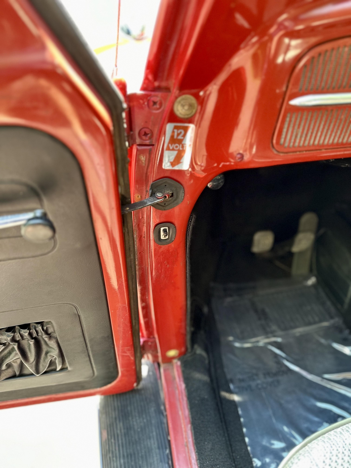 The exterior presents well, free from rust or unsightly bodywork. While there are some dents, scratches, and touchups as expected for its age, it still looks quite good. It appears to have been resprayed within the last 25 years, with some mild overspray on the rubber trim. The paintwork is satisfactory and consistent. OEM glass is present throughout, with a replacement windshield noted. The trim and hardware kit are intact and in good condition, as are the bumpers, though some dry trim pieces could be replaced. The panel fitment is nice and consistent. The car still sports its original dealer badge. The tires are in good shape and perform well on the road. The lights appear largely original and function properly. There are some door dings on the right-hand side, likely from garage storage. Overall, this Beetle presents nicely and is ready to be enjoyed on the road and at events.