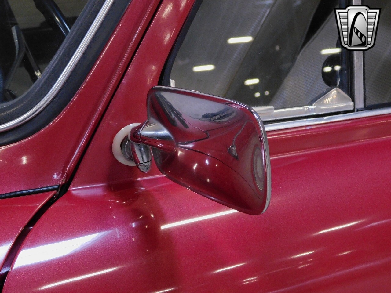 The car is equipped with classic hub caps, adding a touch of nostalgic flair to its overall appearance. The vinyl interior is both stylish and practical, providing a comfortable and easy-to-maintain cabin space. Moreover, the pristine white walls of the tires enhance the vehicle's vintage aesthetic, capturing the essence of 1960s automotive design.