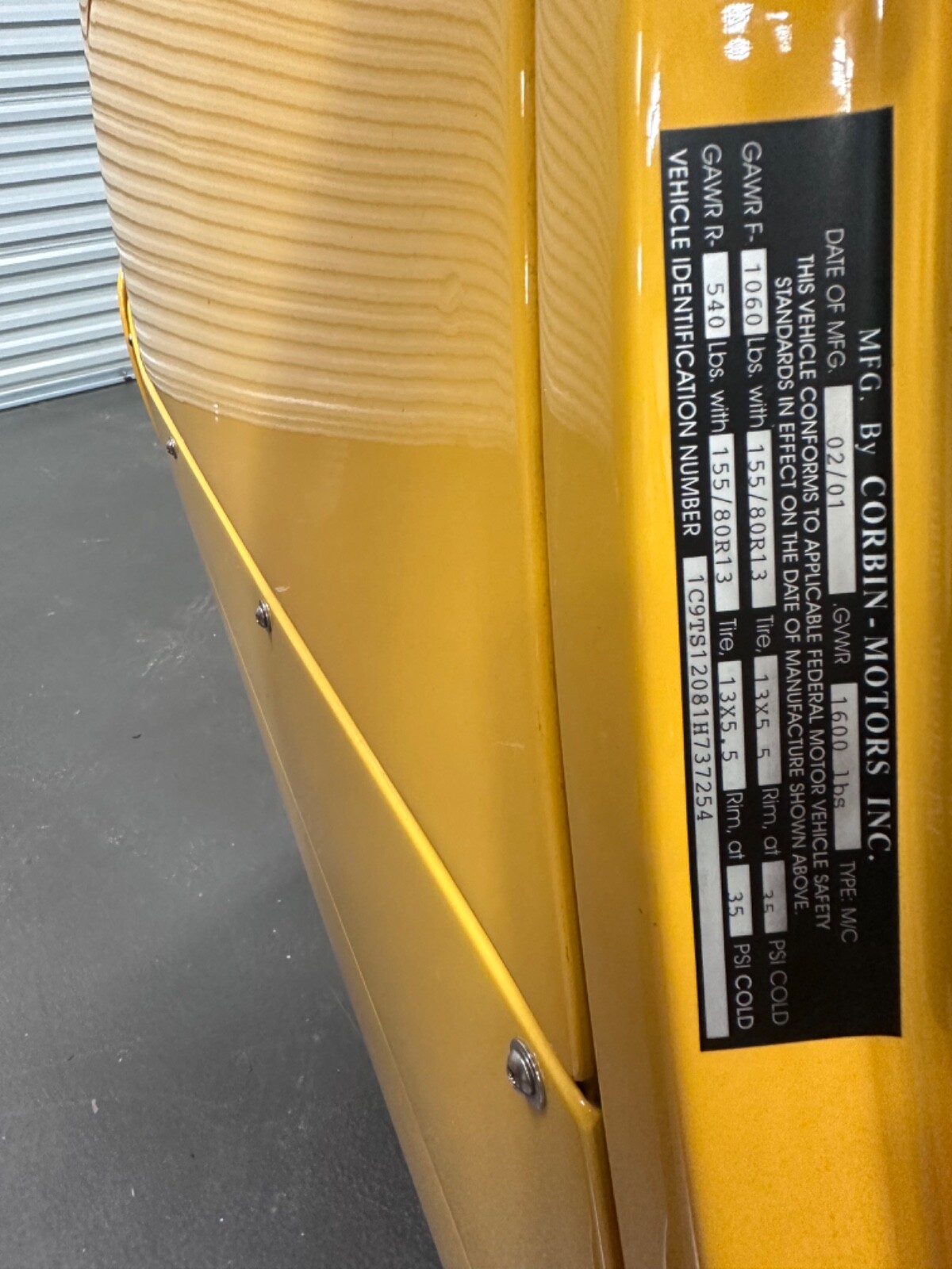 Perfectly running 2001 Corbin Sparrow with brand new battery pack installed this year. All batteries. have the same date code 12/23. They were installed approx. 3 months ago and have less than 100 miles of run time. This sparrow spent most of its life in the micro car museum in GA. It has a custom steering wheel. 256V and has a top speed of 70mph. Range is 30 miles if not riding it hard. Equipped with 13 blue top Optima batteries obtained from NAPA. It could be converted over to lithium which would increase the range dramatically. This is a rare chance to own a sparrow that is in top notch shape with low miles. Located in Louisiana. Happy Bidding!