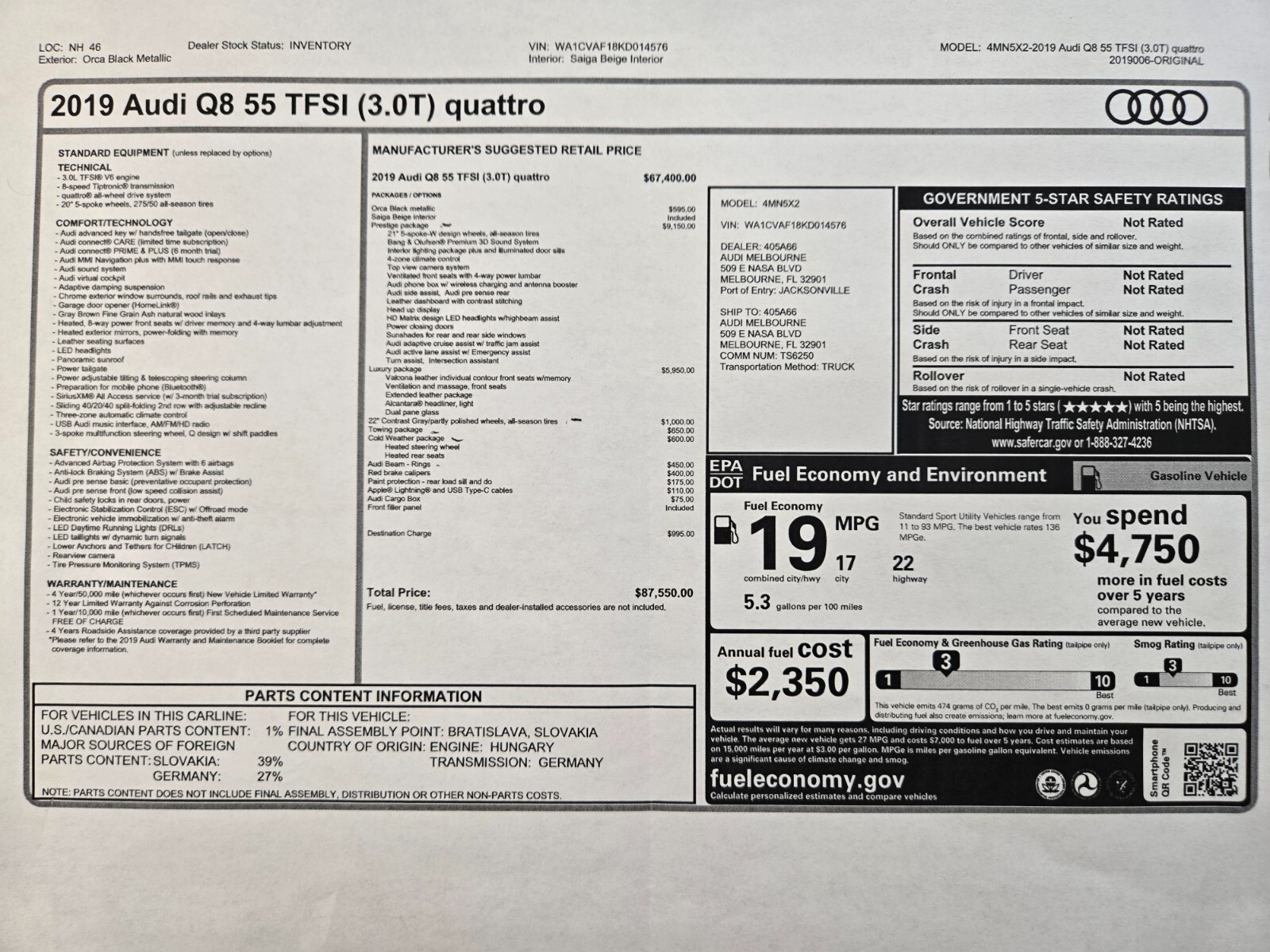 I'm selling my 2019 Audi Q8 Prestige. Exterior color is Orca Black Metallic, and interior color is Saiga Beige. Options include Prestige Package, Luxury Package, 22" wheels, Towing Package, Cold Weather Package, and Red Brake Calipers. Beautiful vehicle inside and out, and drives and rides like a dream. I am the original owner, and the vehicle was purchased new in January 2019. No accidents. Complete maintenance records available and up to date. Tires replaced new at 49,841 miles (Michelin Pilot Sport 4 SUV). Garage/carport kept. Immaculately maintained. I will entertain shipping/delivery options out of the immediate area. Please contact me with any questions.