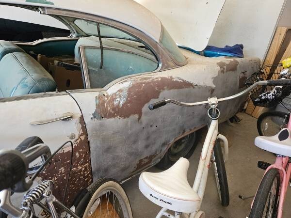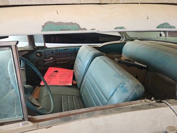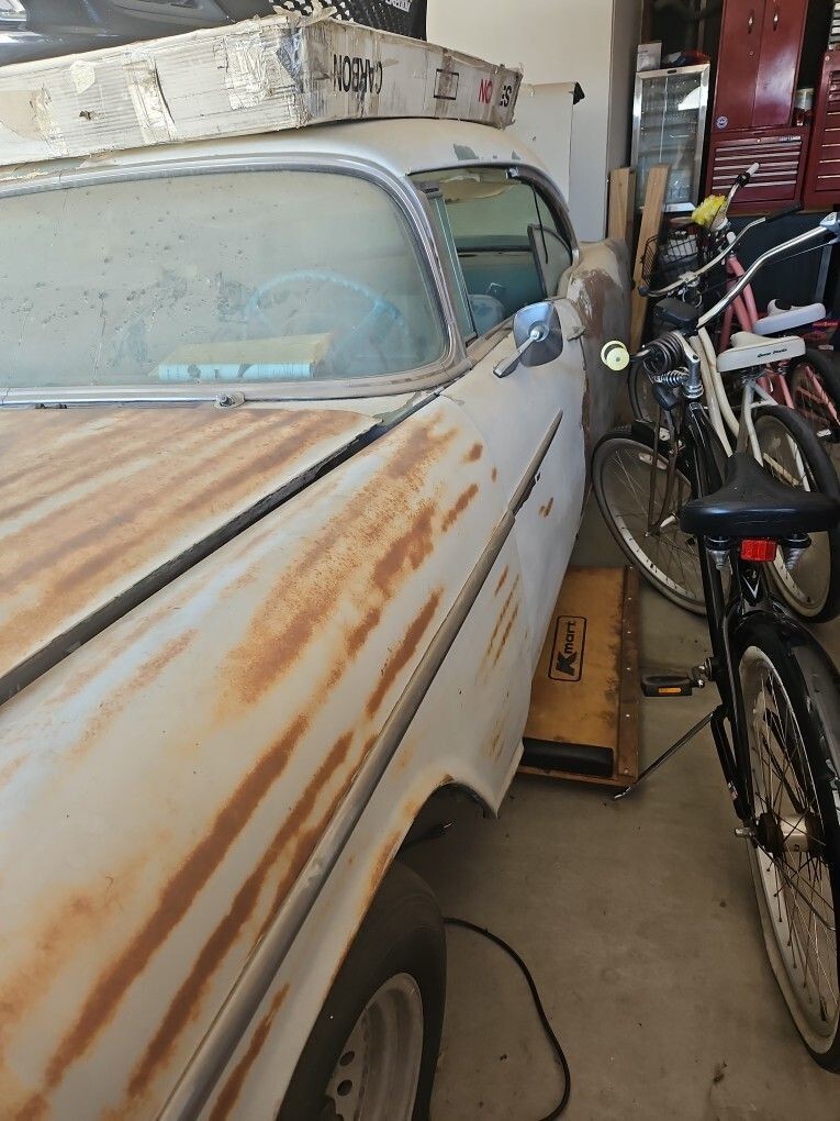 1955 Chevy Bel Air has been sitting in garage for 15 years. Have spare parts such as front and rear bench seats, 350 motor with a couple hundred miles, and a power glide transmission. Its a roller/ project car. Car has rust in rear corner panel.