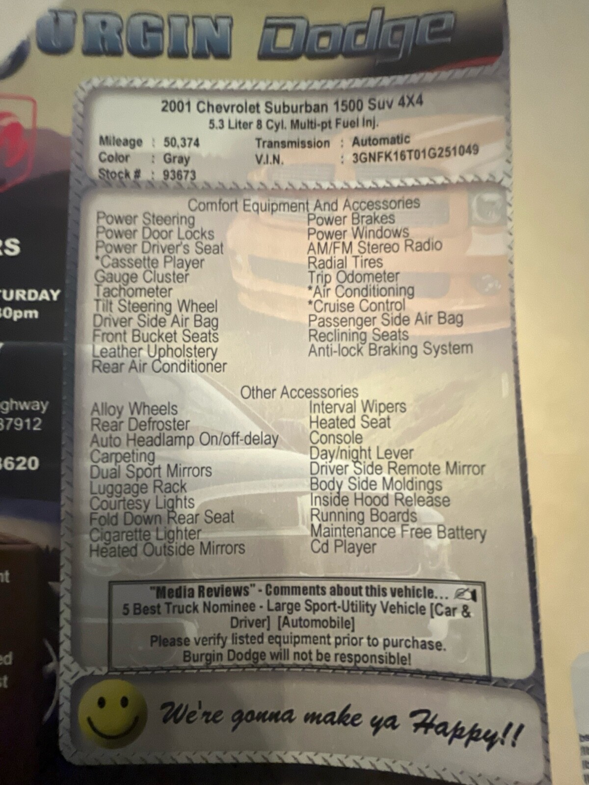 Highly modified lifted 12 inches 2001 Chevrolet Suburban 1500 4x4 5.3 liter. Ice cold a/c front and back. This is well taken care of suv with zero rust. This came fully loaded. I’ve added so many things too many to list.Vehicle Details