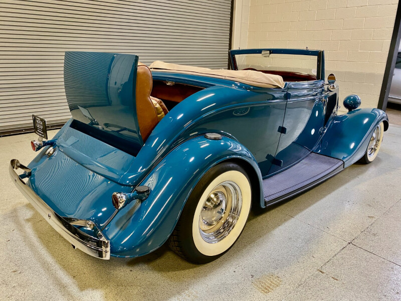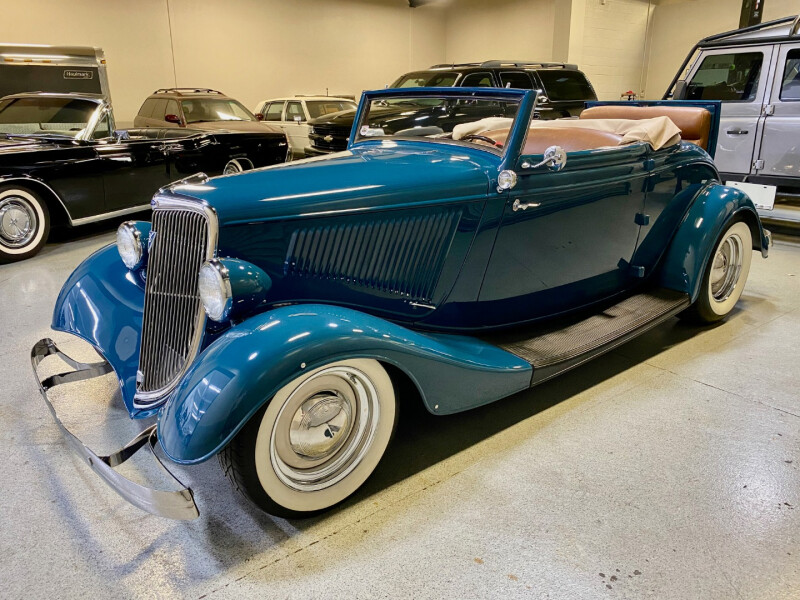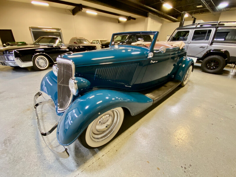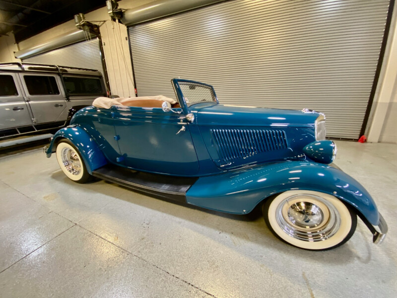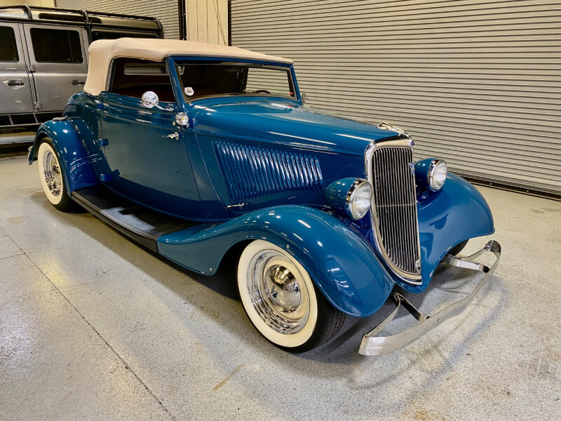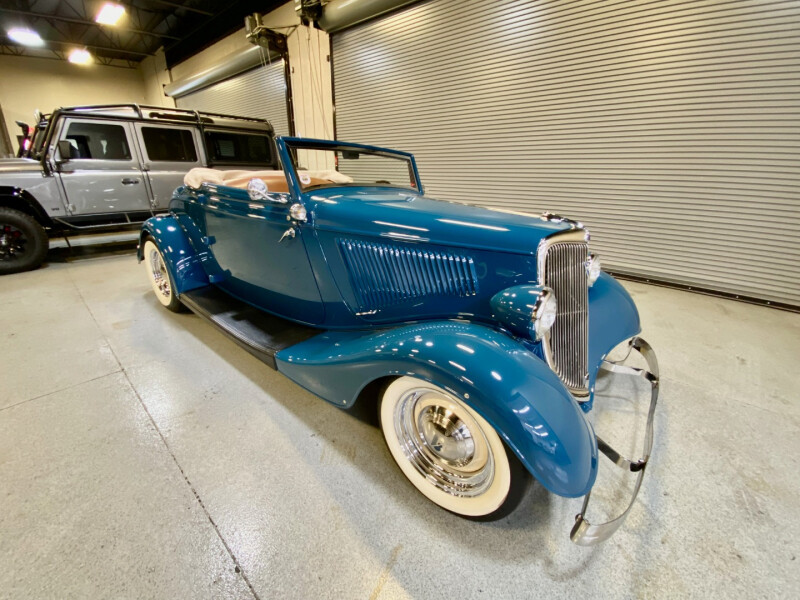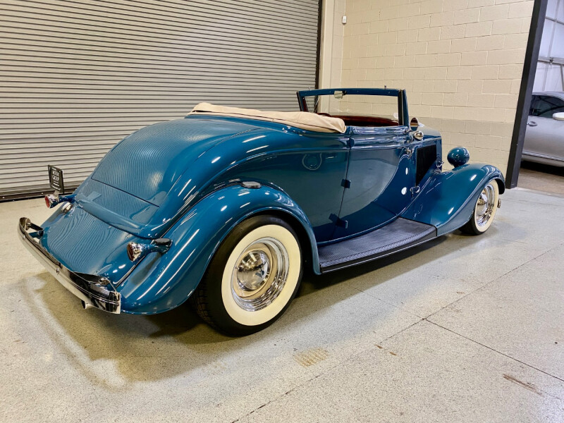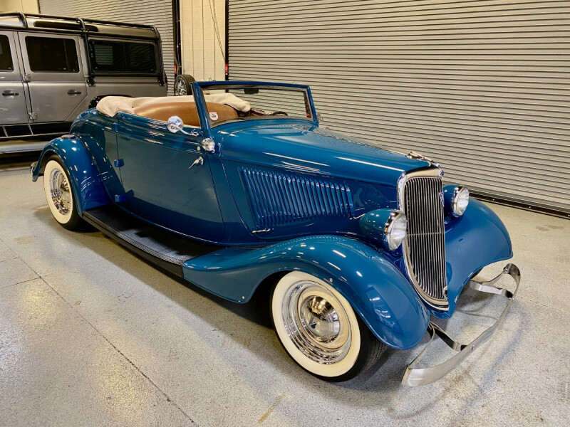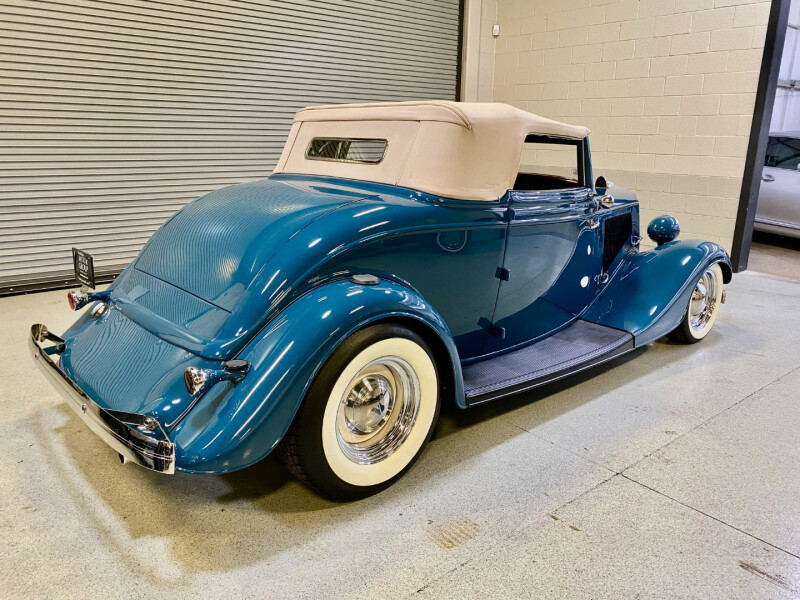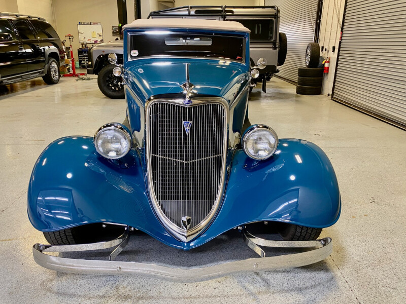 Beautiful 1934 Ford Deluxe Cabriolet, STUNNING Restoration, Show Quality. These were very limited production approximately 7852 were built in 1934, Iconic design: Its sleek, flowing style has become an icon of the era ! This car is Original frame and was an all original car purchased by the last owner from a 40 year owner in a small Minnesota town after being stored over 40 years, car was complete and still had it’s flathead V8 Engine, shipped to North Dakota and then shipped to Arizona Street Rods for it’s build. Car was completed in 2005, now showing 7,409 miles since completion. No expense spared, truly an expensive build nearly impossible to duplicate at todays prices. This car is very custom featuring Heidts independent front and rear suspension with all components chromed. Wildwood Brakes, Coker White Wall Tires mounted on Wheelsmith Smoothies, Chrome and Painted finish. Chevrolet 350 Ramjet Fuel Injected V8 engine with GM 700R Automatic Transmission. Vintage Air/ Air Conditioning. Original Steel “Henry” body, windshield chopped 2 inches and laid back 1 1/2 inches, PPG Avon Blue paint, Distressed Leather Interior and Convertible Top by Vic Kitchens (Boyd Coddington upholsterer) Classic Instrument Gauges, Original Dash, Ford Woodgrain throughout with matching 1939 Banjo Steering Wheel. Winner of several local awards including Street Rodder’s 2008 Top 100 Pick…If you see it in person, you will WANT this amazing Ford Cabriolet !