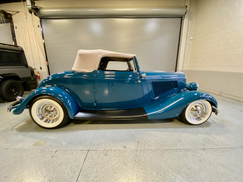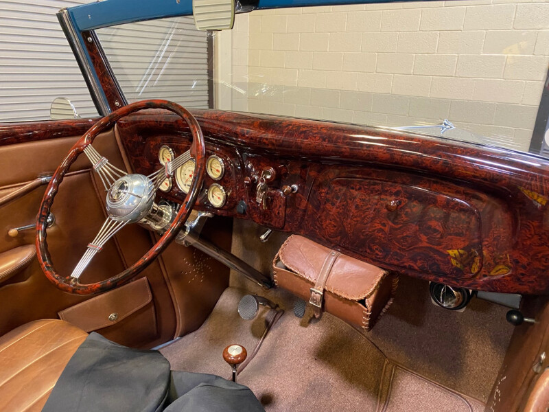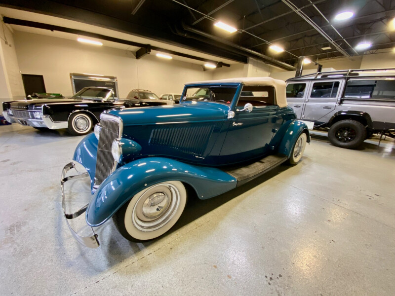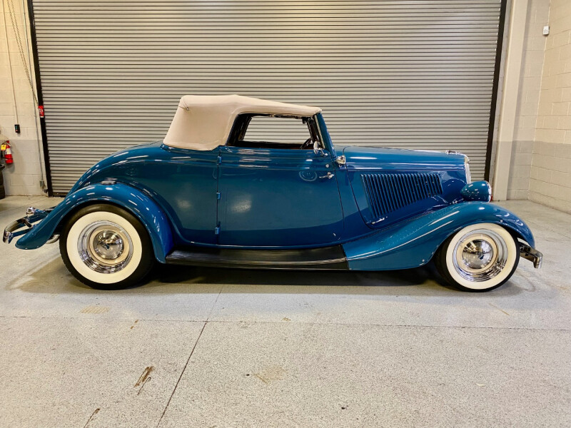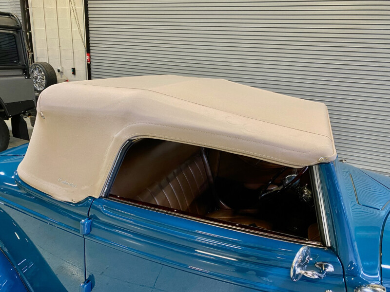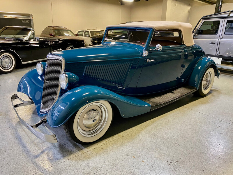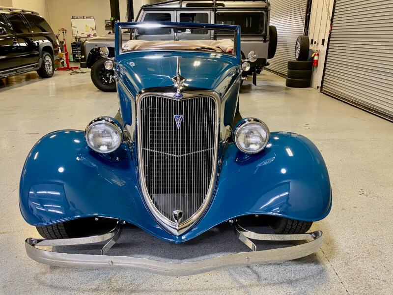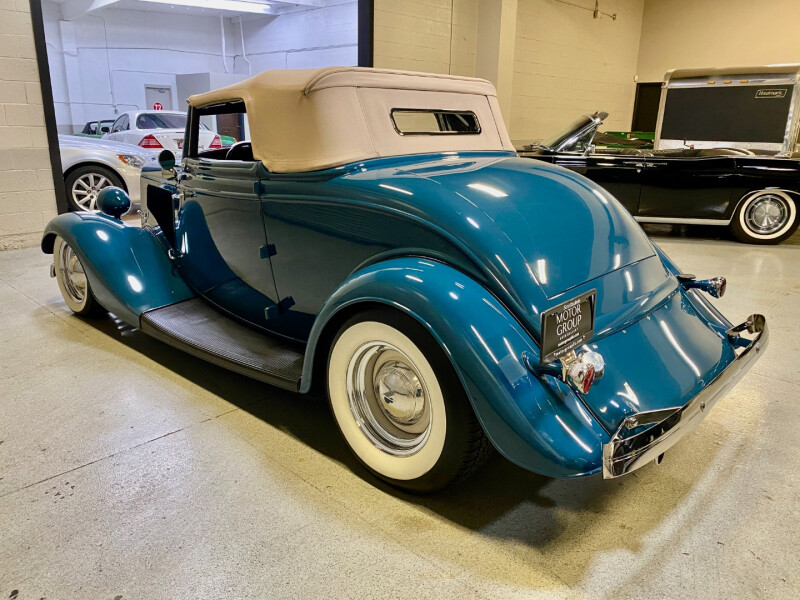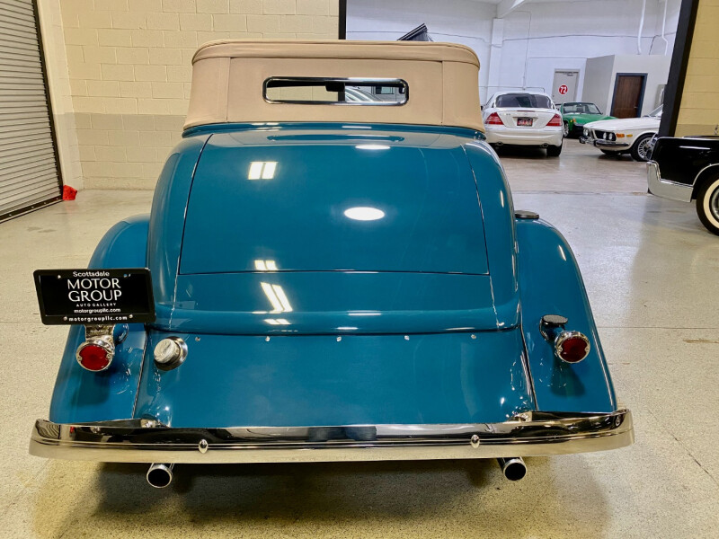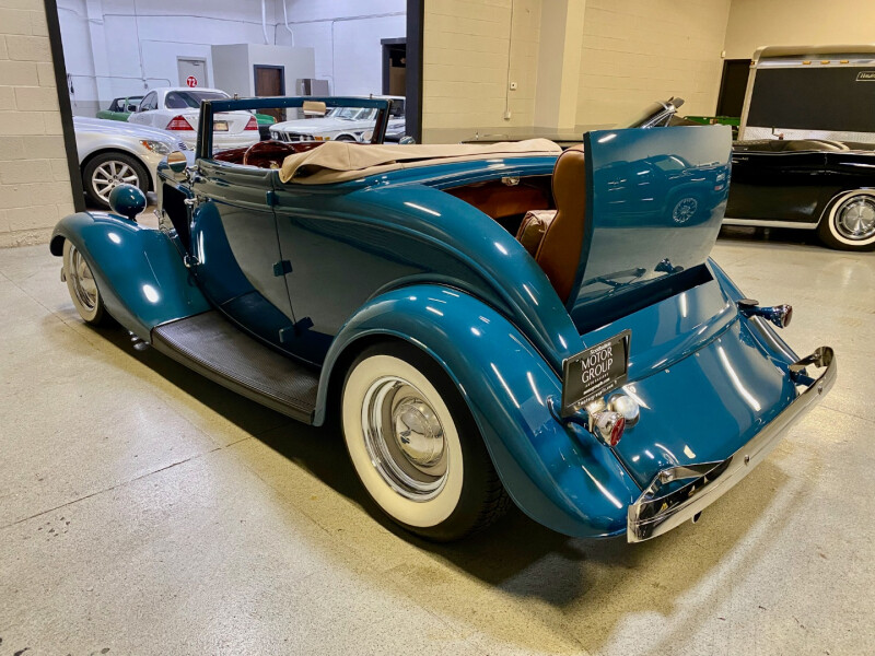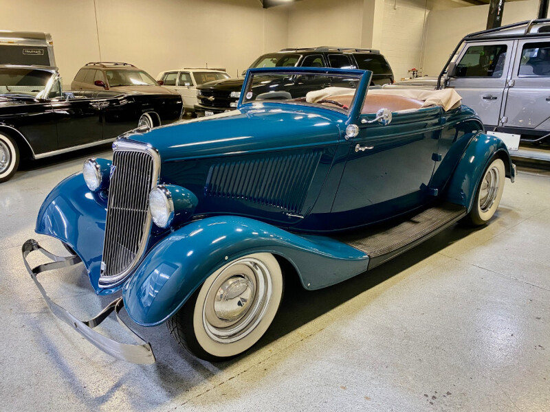 Beautiful 1934 Ford Deluxe Cabriolet, STUNNING Restoration, Show Quality. These were very limited production approximately 7852 were built in 1934, Iconic design: Its sleek, flowing style has become an icon of the era ! This car is Original frame and was an all original car purchased by the last owner from a 40 year owner in a small Minnesota town after being stored over 40 years, car was complete and still had it’s flathead V8 Engine, shipped to North Dakota and then shipped to Arizona Street Rods for it’s build. Car was completed in 2005, now showing 7,409 miles since completion. No expense spared, truly an expensive build nearly impossible to duplicate at todays prices. This car is very custom featuring Heidts independent front and rear suspension with all components chromed. Wildwood Brakes, Coker White Wall Tires mounted on Wheelsmith Smoothies, Chrome and Painted finish. Chevrolet 350 Ramjet Fuel Injected V8 engine with GM 700R Automatic Transmission. Vintage Air/ Air Conditioning. Original Steel “Henry” body, windshield chopped 2 inches and laid back 1 1/2 inches, PPG Avon Blue paint, Distressed Leather Interior and Convertible Top by Vic Kitchens (Boyd Coddington upholsterer) Classic Instrument Gauges, Original Dash, Ford Woodgrain throughout with matching 1939 Banjo Steering Wheel. Winner of several local awards including Street Rodder’s 2008 Top 100 Pick…If you see it in person, you will WANT this amazing Ford Cabriolet !