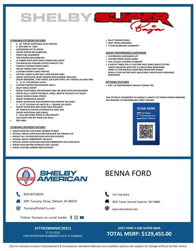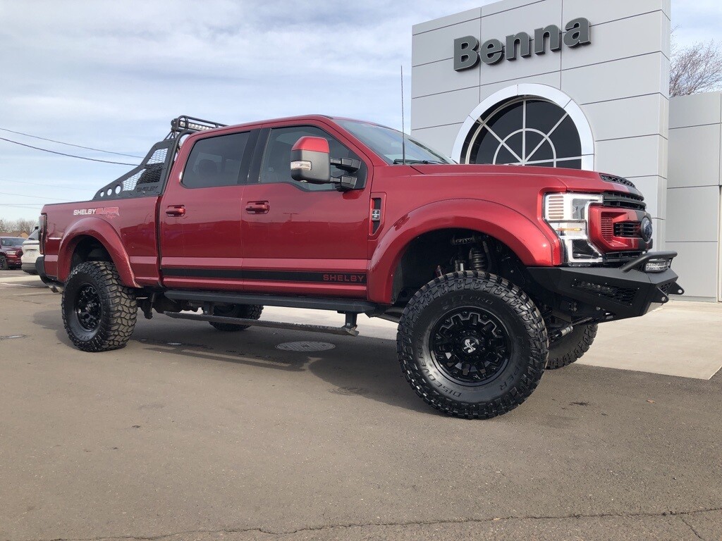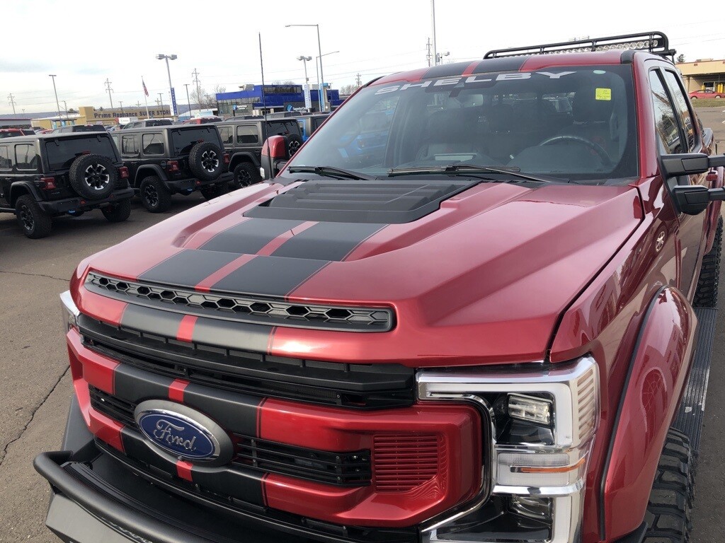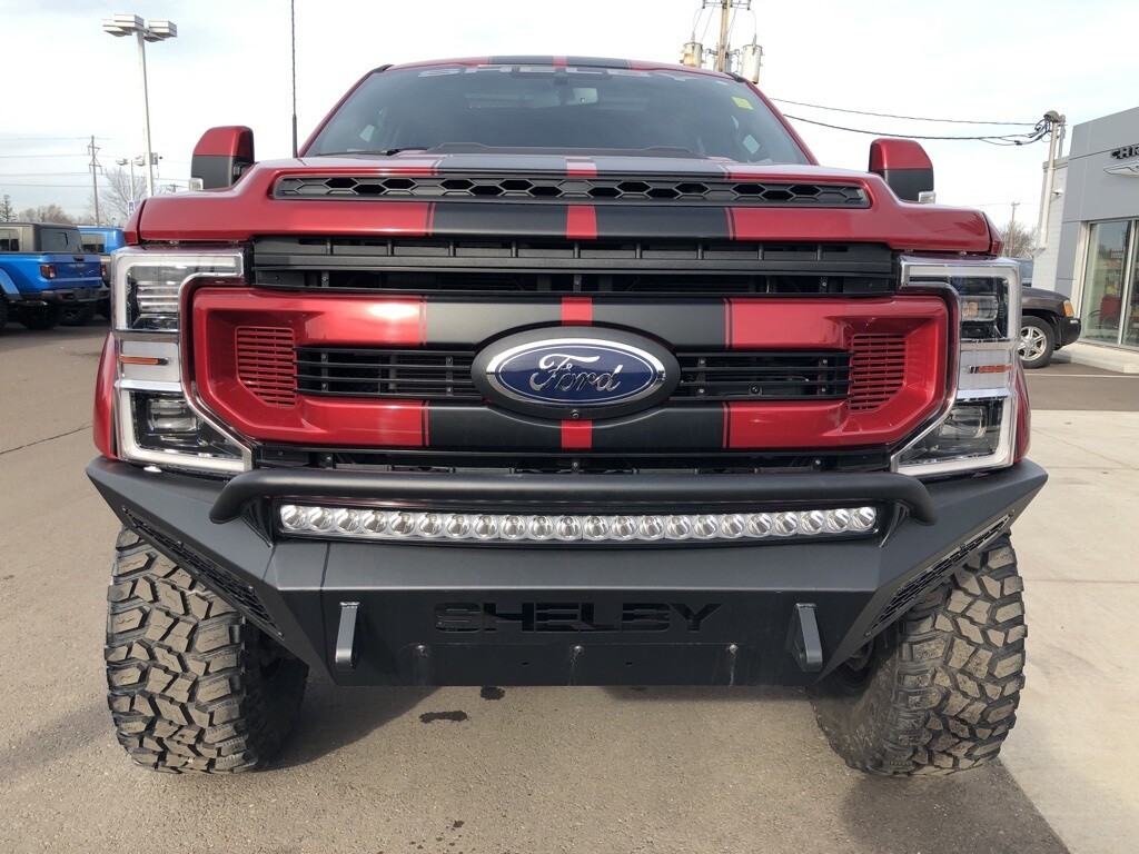 2022 Ford F-250SD Shelby Super Baja 7.3L V8 PFI SOHC 16V Federal 385hp 10-Speed Automatic 4WD 4D Crew Cab Red 4WD, 110V/400W Outlet, 3.73 Axle Ratio, 4-Wheel Disc Brakes, ABS brakes, Adaptive Cruise Control & Collision Warning, Adaptive Steering, Air Conditioning, BLIS Blind Spot Information System, BoxLink, Brake assist, Compass, Delay-off headlights, Dual front impact airbags, Dual front side impact airbags, Electronic Stability Control, Electronic-Locking w/3.55 Axle Ratio, Electronic-Locking w/3.55 Axle Ratio w/99T, Engine Block Heater, Exterior Parking Camera Rear, Fixed Rear-Window w/Defrost, Front anti-roll bar, Front reading lights, Fully automatic headlights, FX4 Off-Road Package, GVWR: 10,000 lb Payload Package, Heated Rear Seats, Lariat Ultimate Package, LED Box Lighting, Low tire pressure warning, Order Code 608A, Outside temperature display, Overhead airbag, Overhead console, Passenger vanity mirror, Power steering, Power-Sliding Rear-Window w/Defrost, PowerScope Trailer Tow Mirrors w/Heat, Privacy Glass, Pro Trailer Backup Assist, Quad Beam LED Headlamps & LED Taillamps, Rain-Sensing Windshield Wipers, Rear reading lights, Rear step bumper, Rear Wheel Well Liners (Pre-Installed), Remote Start System, Reverse Sensing System, Split folding rear seat, Steering wheel mounted audio controls, Tachometer, Telescoping steering wheel, Tilt steering wheel, Tough Bed Spray-In Bedliner, Traction control, Trailer Brake Controller, Trip computer, Twin Panel Power Moonroof, Universal Garage Door Opener (UGDO), Upfitter Switches (6), Variably intermittent wipers, Wheels: 18 Bright Machined Cast Aluminum, 4WD.