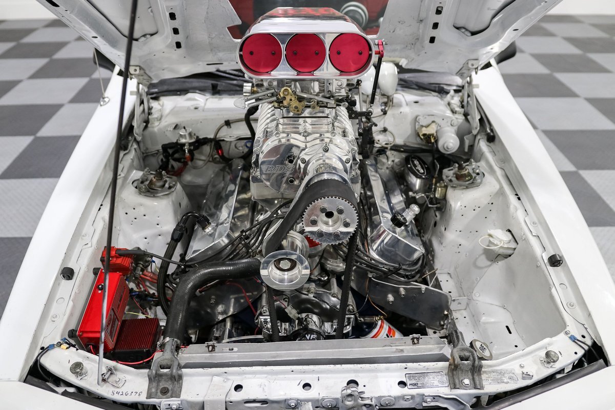 Inside, the transformation continues with a digital dash, AutoMeter tach with shift light, and a B&M Pro Ratchet shifter. The AFR gauge and full MSD ignition system keep you informed and in control. The removable steering wheel, manual rack and pinion steering, and hydraulic roller camshaft add to the driver-focused experience. The Thunderbird also features an aluminum radiator with dual electric fans and an aluminum fuel cell in the trunk, ensuring it stays cool and fueled during intense runs.