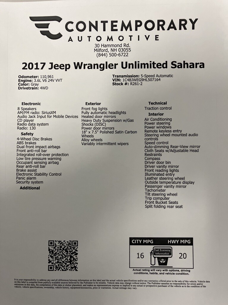 Recent Arrival! CONTEMPORARY CHRYSLER DODGE JEEP RAM is proud to present you with another True Market Priced Pre-Owned Vehicle. This 2017 Jeep Wrangler Unlimited Sahara is loaded with the following Factory Options: Connectivity Group (Remote USB Port, Tire Pressure Monitoring Display, Uconnect Voice Command w/Bluetooth, and Vehicle Information Center), Quick Order Package 24G (Body Color Appliques Front Bumper, Body Color Appliques Rear Bumper, and Body Color/Accent Color Grille), Trailer Tow Group (Class II Receiver Hitch and Trailer Tow w/4-Pin Connector Wiring), 40GB Hard Drive w/28GB Available, 5-Year SiriusXM Travel Link Service, 6.5 Touchscreen Display, Alpine 9-Speaker w/All Weather Subwoofer, Audio Jack Input for Mobile Devices, Black 3-Piece Hard Top (DISC), Delete Sunrider Soft Top, Freedom Panel Storage Bag, GPS Navigation, Radio: 430N (DISC), Rear Window Defroster, Rear Window Wiper/Washer, Remote Start System, and SiriusXM Travel Link Connectivity Group (Remote USB Port, Tire Pressure Monitoring Display, Uconnect Voice Command w/Bluetooth, and Vehicle Information Center), Quick Order Package 24G (Body Color Appliques Front Bumper, Body Color Appliques Rear Bumper, and Body Color/Accent Color Grille), Trailer Tow Group (Class II Receiver Hitch and Trailer Tow w/4-Pin Connector Wiring), 40GB Hard Drive w/28GB Available, 5-Year SiriusXM Travel Link Service, 6.5 Touchscreen Display, Alpine 9-Speaker w/All Weather Subwoofer, Audio Jack Input for Mobile Devices, Black 3-Piece Hard Top (DISC), Delete Sunrider Soft Top, Freedom Panel Storage Bag, GPS Navigation, Radio: 430N (DISC), Rear Window Defroster, Rear Window Wiper/Washer, Remote Start System, SiriusXM Travel Link, 18 x 7.5 Polished Satin Carbon Wheels, 3.21 Rear Axle Ratio, 4-Wheel Disc Brakes, 8 Speakers, ABS brakes, Air Conditioning, Alloy wheels, AM/FM radio: SiriusXM, Auto-dimming Rear-View mirror, Brake assist, CD player, Cloth Seats w/Adjustable Head Restraints, Compass, Driver door bin, Driver vanity mirror, Dual front impact airbags, Electronic Stability Control, Front anti-roll bar, Front Bucket Seats, Front Center Armrest w/Storage, Front fog lights, Front reading lights, Fully automatic headlights, Heated door mirrors, Heavy Duty Suspension w/Gas Shocks (DISC), Illuminated entry, Integrated roll-over protection, Leather steering wheel, Low tire pressure warning, Occupant sensing airbag, Outside temperature display, Panic alarm, Passenger door bin, Passenger vanity mirror, Power door mirrors, Power steering, Power windows, Radio data system, Radio: 130, Rear anti-roll bar, Remote keyless entry, Security system, Speed control, Split folding rear seat, Steering wheel mounted audio controls, Tachometer, Tilt steering wheel, Traction control, Trip computer, and Variably intermittent wipers!!