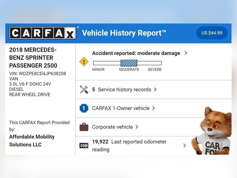 To view a video that features a walk around, interior view, and short test drive please copy and paste the following link: Why choose this Sprinter from Affordable Mobility Solutions? - We have a detailed video so you know exactly what you are getting. - All our vehicles are inspected by an ASE certified mechanic. - We don't have any hidden/bogus fees. - We offer FREE shipping anywhere in the lower 48 states. - We provide a free Carfax report with each one of our vans. - We take trade-ins even from across the country. - Do not risk buying as is. This 1 owner van meets the specs to be covered under the manufacturers' powertrain warranty until 1/31/24 or 60k miles and the brand new conversion comes with the industry best 3yr/unlimited mile warrant. 2018 Mercedes-Benz Sprinter 2500 VIN: WDZPE8CD4JP638208 Miles: 19,936 Title: Clean title in hand. See Carfax report for more details. FREE SHIPPING!! Please view the following video link for information on how our free shipping works: Conversion: This van has a brand new ATS side-entry power ramp & manual door conversion. Specifications: - 33.75 wide ramp - 69 doorway height - 71 interior height - 800lbs weight capacity - Non-skid powder coated ramp - Set of 4 Q'Straint tie-downs Financing: We can send you a credit application to your email, send you a link to apply online, or mail you one. - No down payment required with approved credit. - Always simple interest loans with no prepayment penalties. - Terms up to 10 years (120 months) to keep your payments low. - Credit scores as low as 520. Please be sure to make an appointment with Jeremiah at 866-721-1712 to view any of our vehicles. Please note that we can only accept the following forms of payment: - Cash - ACH Bank Transfer (Free to you and me.) - Wire Transfer **$20 fee added to send a wire, use an ACH :) - Certified Bank Check - Credit or debit card (processing fees will apply) **We do not guarantee extra keys, books, floor mats, spare tires/tools, or navigation discs with every van. We take very detailed videos and pictures that show exactly what the vehicle comes with, and if we have them, they will be in the vehicle upon delivery. All buyers registering vehicles out of state will be responsible for their local taxes and any fees charged by their state or county. Mobility Van Ramp Van Mobility SUV Handicap Accessible vehicles Handicap SUV Handicap Handicapped Disability Wheelchair Van Medical Ramp