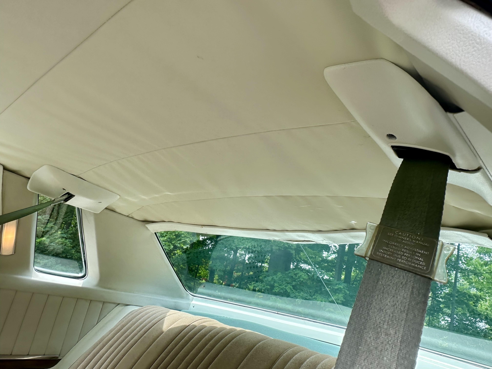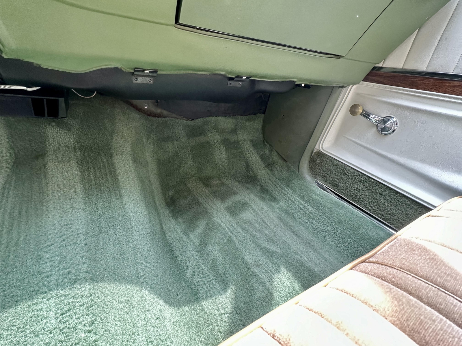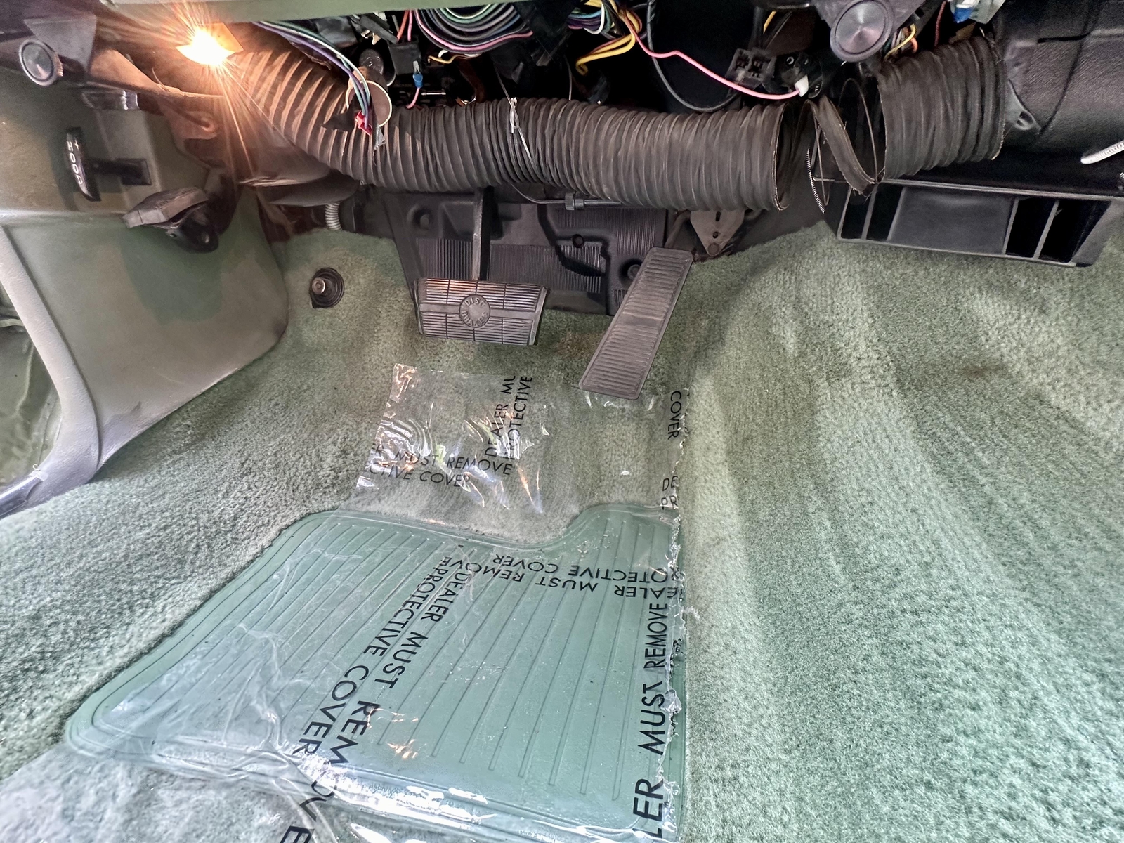 The interior is mix matched at the moment with nice seat coverings but in a clashing color compared to the rest of the interior. The carpets looks new and the dash and gauges show nicely. The headliner and visors are in pretty good shape as you can see.