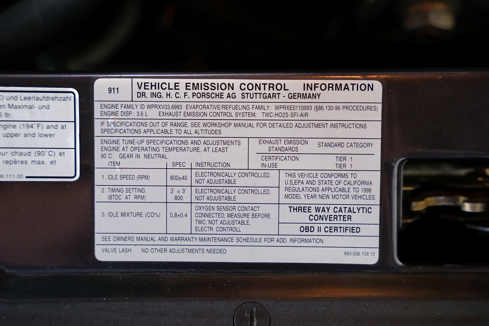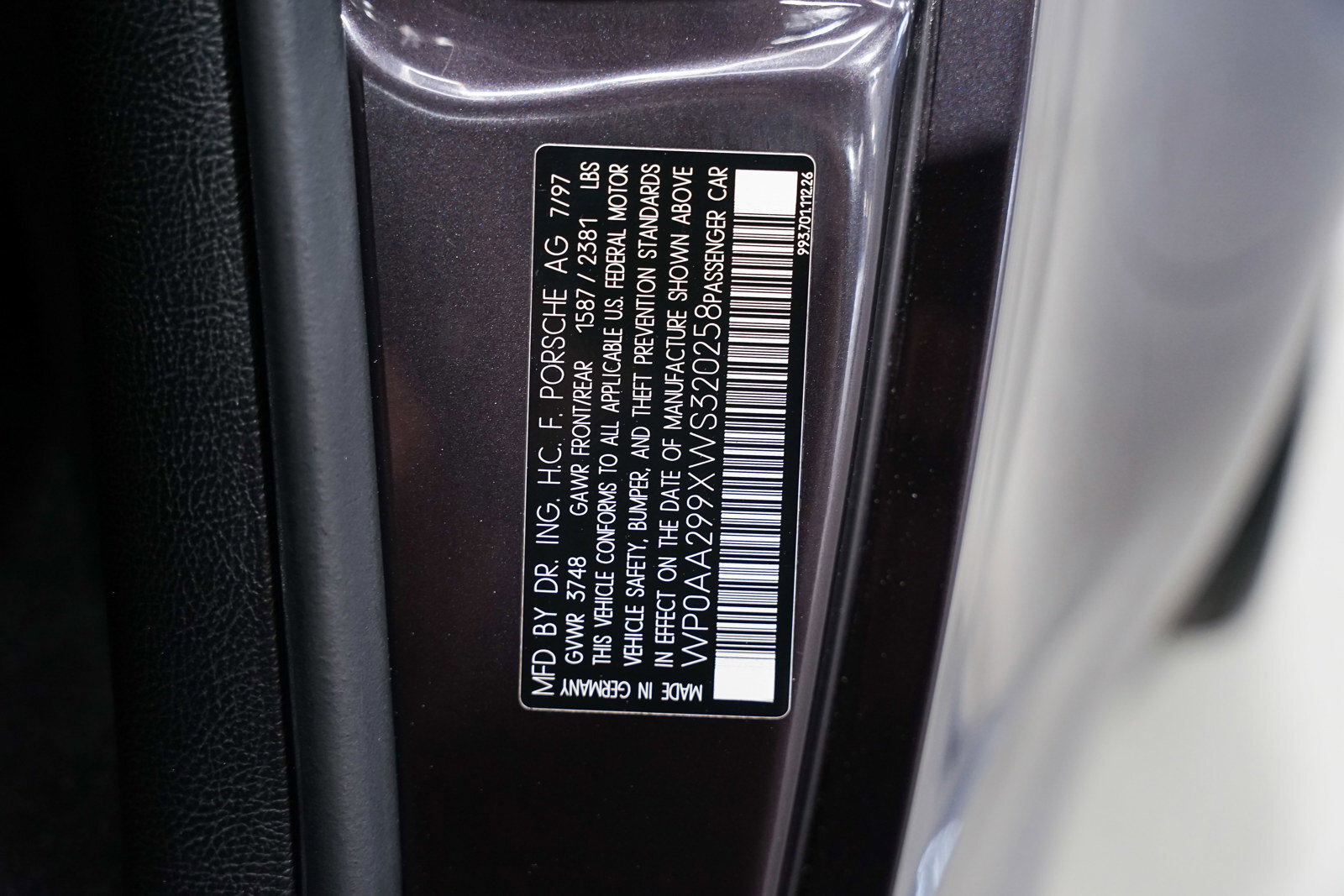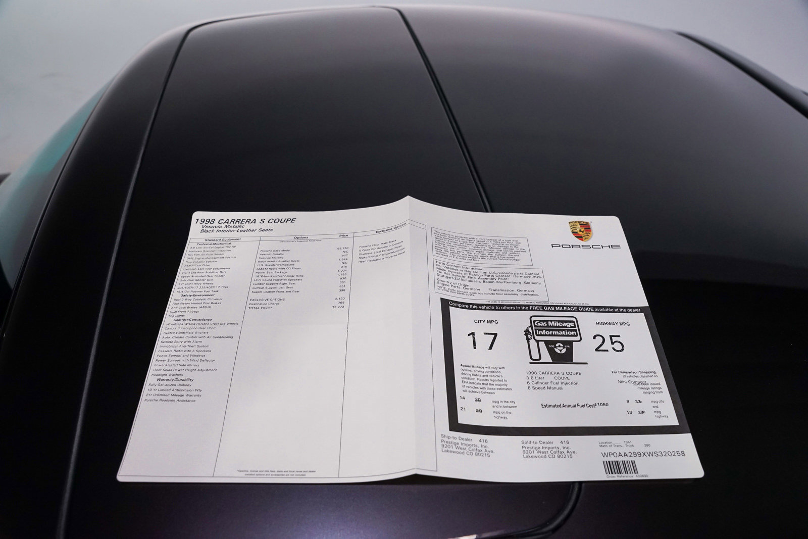 *Porsche 911 Carrera S Vesuvio Edition (1998)* * *1 of 60* * *Vesuvio Metallic* * *Black Interior* * *Leather Seats* * *Manual* * *Power Seat PKG* * *Lumbar Support Left/Right Seats* * *Supple Leather Front and Rear* * *Stainless Steel Exhaust Pipes* * *Brake/Shifter Carbon/Aluminum* * *Head Restrain w/Porsche Crest* * *5 Open CD Holders in Console* * *Original Window Sticker*Generation 993 in the Porsche 911 lineup plays a crucial role in the brand's history due to its uniqueness. It's the last 911 with air-cooled engines and the first with a new suspension architecture. Our Carrera S from this generation is part of the special Vesuvio Edition --- a limited version dedicated to the eruption of Mount Vesuvius.The 911 Vesuvio Edition stands out with its unique color scheme, reminiscent of the power of the volcano. Exclusive design accents highlight the model's uniqueness.Under the hood, it features a 3.6-liter six-cylinder engine producing 282 horsepower, which is still impressive today. The car can accelerate to 60 miles per hour in less than 5 seconds.With only 60 units produced worldwide, the Porsche 911 Carrera S Vesuvio Edition is not just a sports car but also a collectible piece that would enhance any car collection, especially with a range of exclusive options, like our car!
