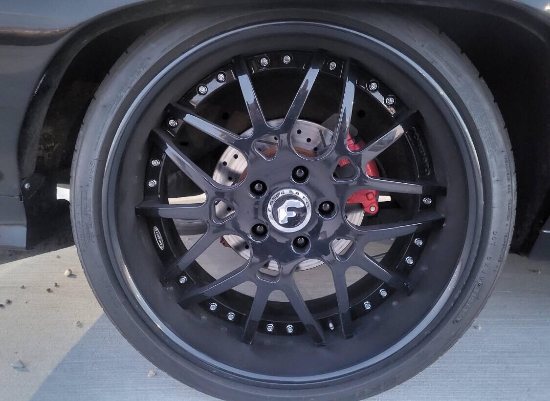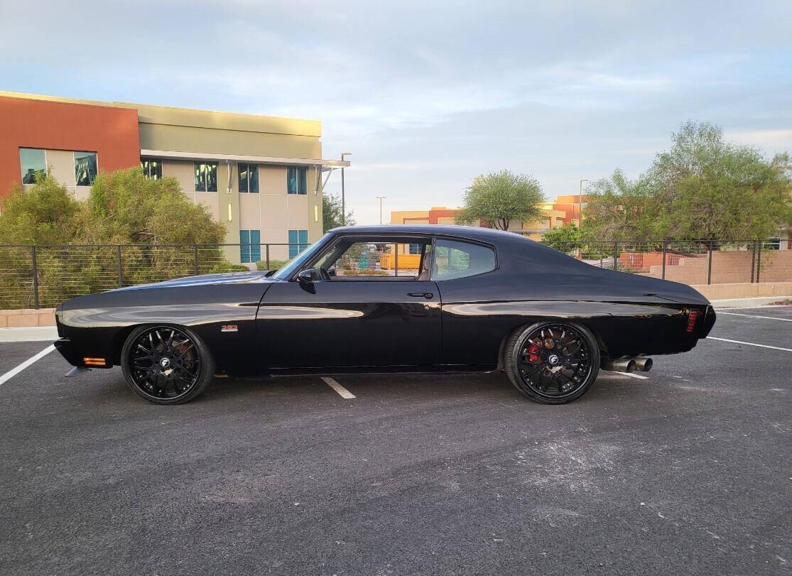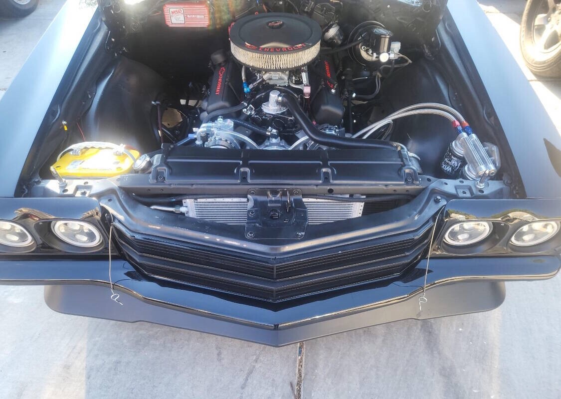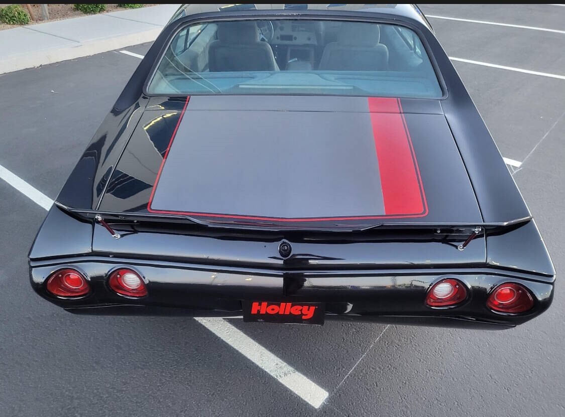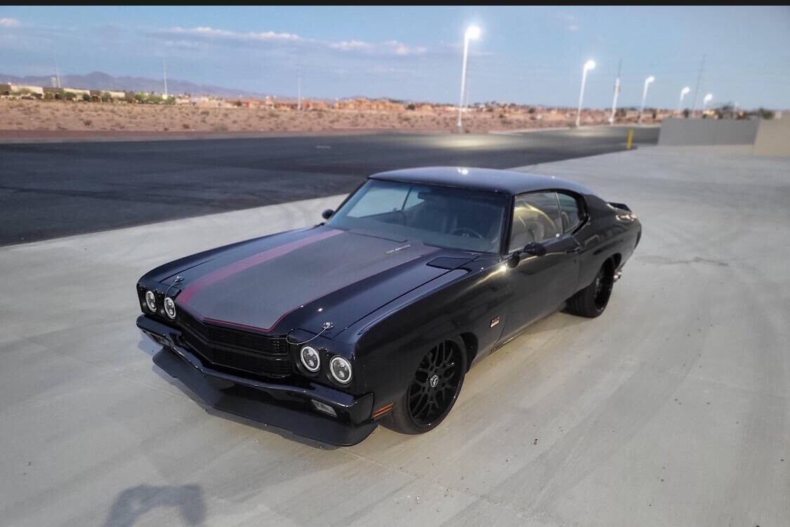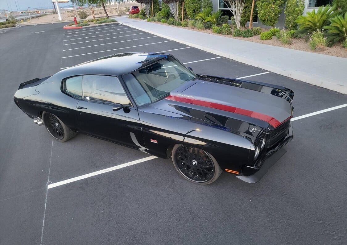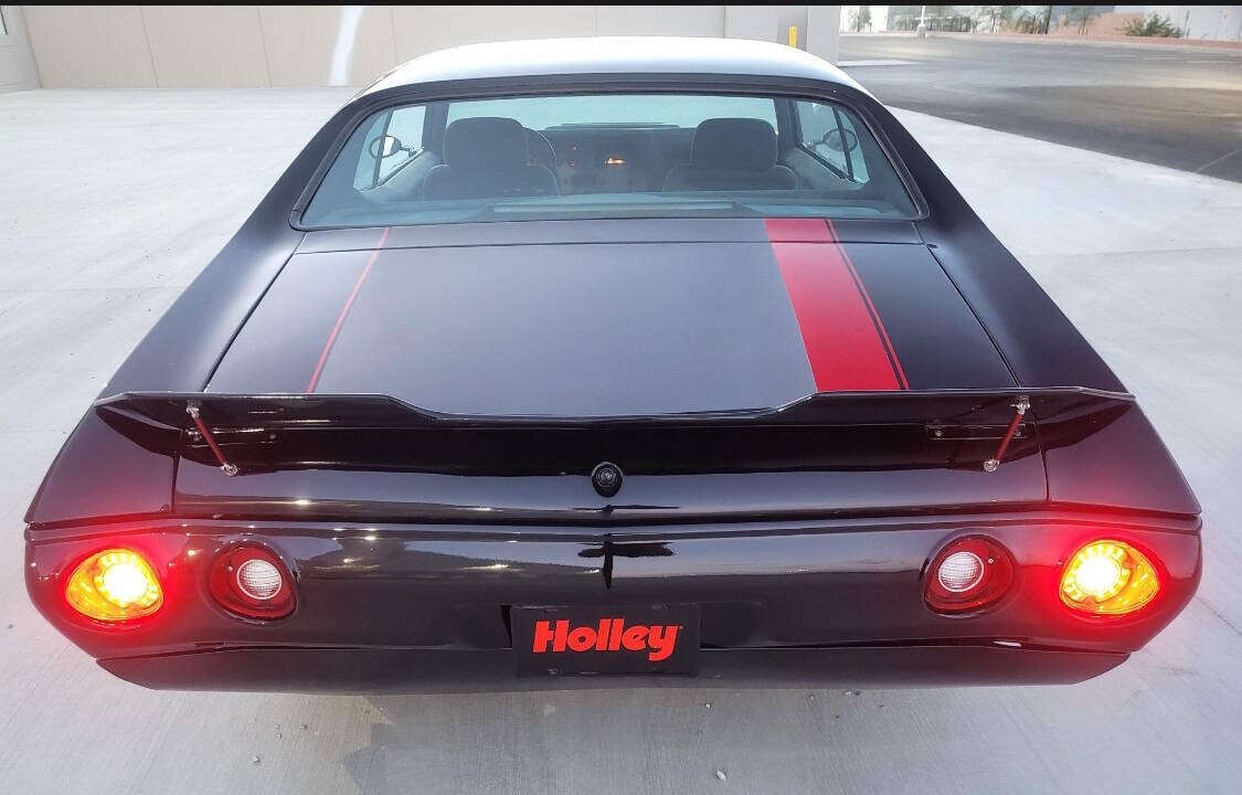 This 1972 Chevrolet Chevelle sport coupe from Nevada was refurbished in 2024 and fitted with a 383ci stroker V8 linked with a Tremec six-speed manual transmission and a Detroit TrueTrac limited-slip differential. Additional equipment includes a COMP camshaft, Dart heads, long-tube headers, and a billet serpentine drive system. The car is finished in black with a red and gray stripe, and an earlier-model Chevelle front clip was installed along with an adjustable rear spoiler, a modified rear valance and quarter panels, a cowl-induction hood, and LED lighting. The car rides on a lowered suspension and 20" Forgiato wheels over four-wheel disc brakes. The cabin was reupholstered in gray vinyl and microsuede, and appointments include air conditioning, a full-length center console, Dakota Digital gauges, and a Bluetooth head unit linked to high-performance speakers. A 1970 Chevelle-style front clip was installed and features a split black grille, LED headlights, and a front air dam, while an adjustable rear spoiler, a cowl-induction hood, and black window trim were fitted during the build. The car was refinished in black with a dark gray and red stripe on the hood and trunk. A custom lower valance is fitted and the rear quarter panels were modified to accommodate the quad exhaust outlets. Black-finished Forgiato 20" wheels are shod with Toyo Extensa HP tires. The car rides on a lowered suspension with an aftermarket front sway bar and coilovers. Braking is provided by four-wheel discs with a Wilwood master cylinder and brake booster. The emergency brake is not functional. The cabin was re-trimmed in gray vinyl and microsuede over the bucket seats, full-length center console, dash pad, and door panels. Red ambient lighting and an Old Air climate control system were installed during the build, and further details include push-button start, a B&M shifter, cupholders, and a JVC Bluetooth touchscreen head unit linked with an aftermarket subwoofer and speakers. The Grant Challenger steering wheel sits on a tilting column and frames Dakota Digital instrumentation including a 160-mph speedometer and supplementary readouts. The five-digit odometer shows 1,300 miles. The 383ci stroker V8 was installed in 2024, and the seller states it was assembled with Dart cylinder heads, ARP fasteners, Scorpion rockers, and a COMP Xtreme roller camshaft, valve springs, and lifters. Additional equipment includes a CVR serpentine drive setup, a Holley carburetor, an Optima battery, an MSD Pro billet distributor and ignition, and dual electric fans. Power is routed to the rear wheels through a Tremec T56 six-speed manual transmission and a Detroit TrueTrac limited-slip differential with 4.11:1 gears. Long-tube headers flow to an H-pipe midsection. Bullet Points 1,300 Miles, TMU 383ci Stroker V8 COMP Xtreme Camshaft Six-Speed Manual Transmission Limited-Slip Differential Black Paint w/Gray & Red Stripe Gray Vinyl & Microsuede Upholstery Black-Finished 20 Forgiato Wheels Four-Wheel Disc Brakes Cowl-Induction Hood Old Air Climate Control JVC Bluetooth Head Unit Financing/Insured Delivery available Call/text anytime 847-848-1850