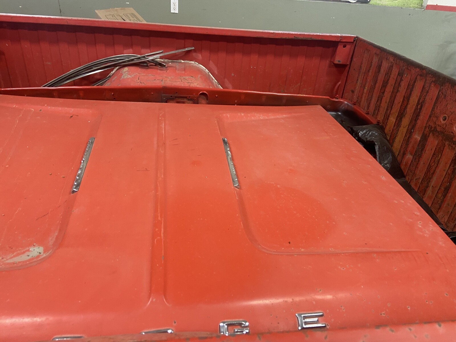 Original red and white paint, no rust at all. One dent on the back of the cab above the rear window, from a falling limb. Did NOT distort the window opening or break the glass. Front sheet metal is off, it comes with the truck, including the birdbath hood. Excellent grill. Original seat with brand-new upholstery. NO ENGINE OR TRANSMISSION; non-operating project truck.