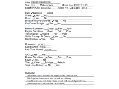 No Payment: If the deposit is not received within 24 hours of the close of the auction, or if the balance is not paid in full within 3 days following the close of the auction, we reserve the right to re-list the vehicle to the next highest bidder or another qualified buyer.