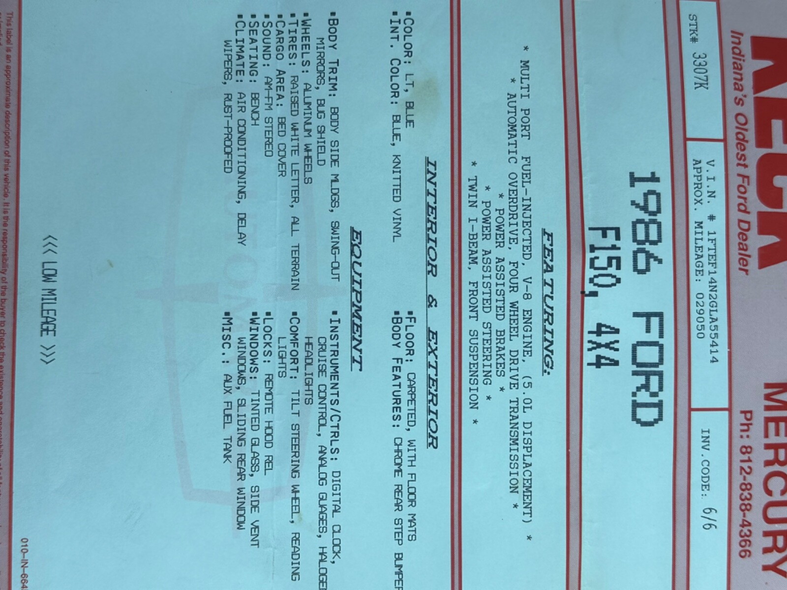 2 owner 86 ford. Fuel injected 302. Factory AC and cruise control. 4x4 auto. Been setting in storage since 2004 until last year. Runs and drives but does need brake work.