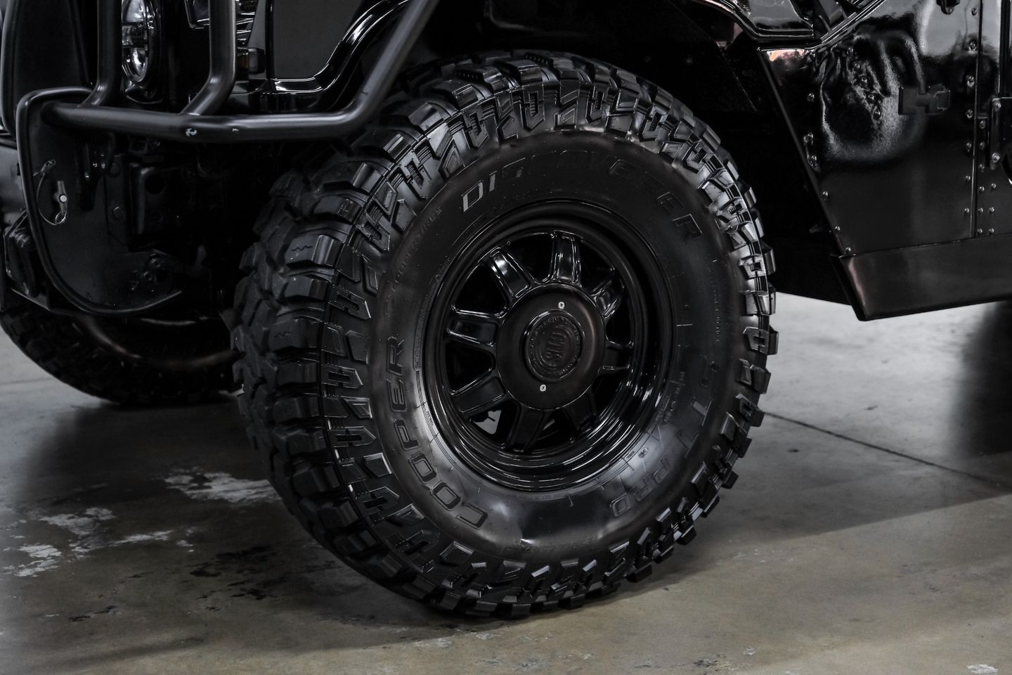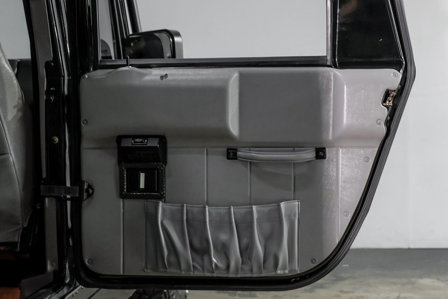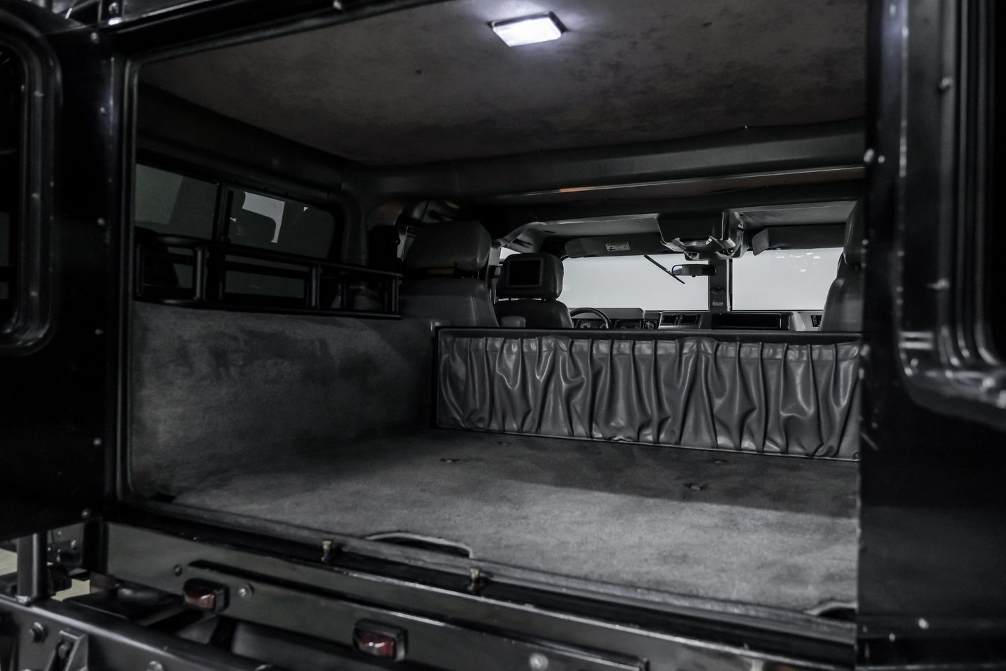 Dressed in a sleek and commanding black exterior, this HUMMER H1 Wagon is a head-turner from every angle. The robust and iconic design is complemented by a GOBI roof rack, perfect for hauling extra gear, and access ladders that make reaching your cargo a breeze. The addition of LED lighting not only enhances visibility during night-time excursions but also adds a modern touch to this classic off-road titan.
