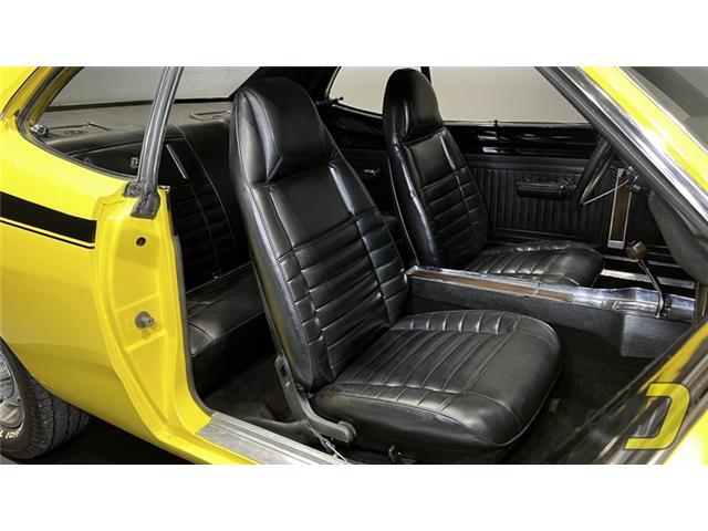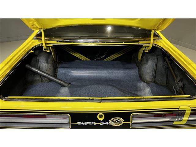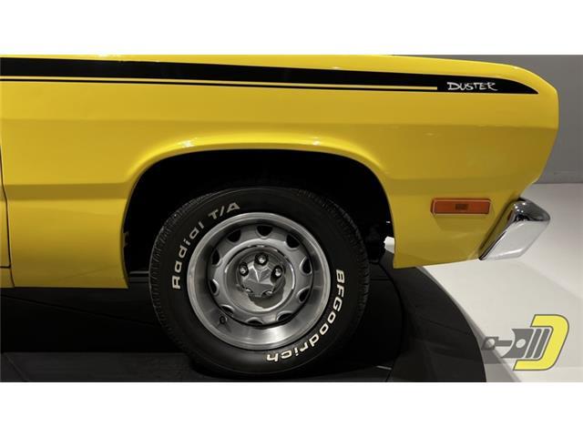 Built in January 1972, this Duster is a solid car and does not suffer from any rust problems. It has seen a repaint in its original color of FY1 Lemon Twist. It also received new black graphics that really stand out against the body color. Additional features include a dual snorkel hood scoop and a “Go Wing” rear spoiler. The bumpers, moldings, and grille are all in good shape. So are the Rallye wheels and BF Goodrich tires (215 front, 245 rear). Note the factory fender tag remains in place too.