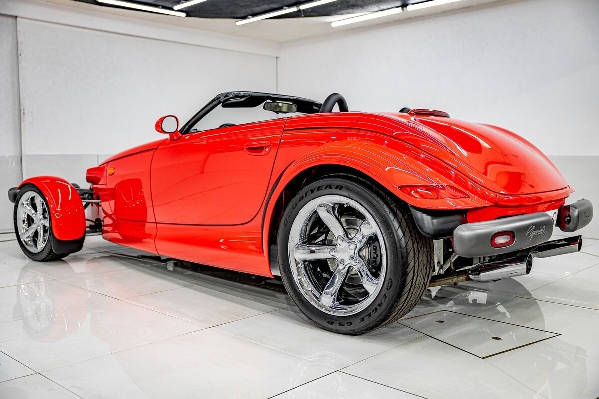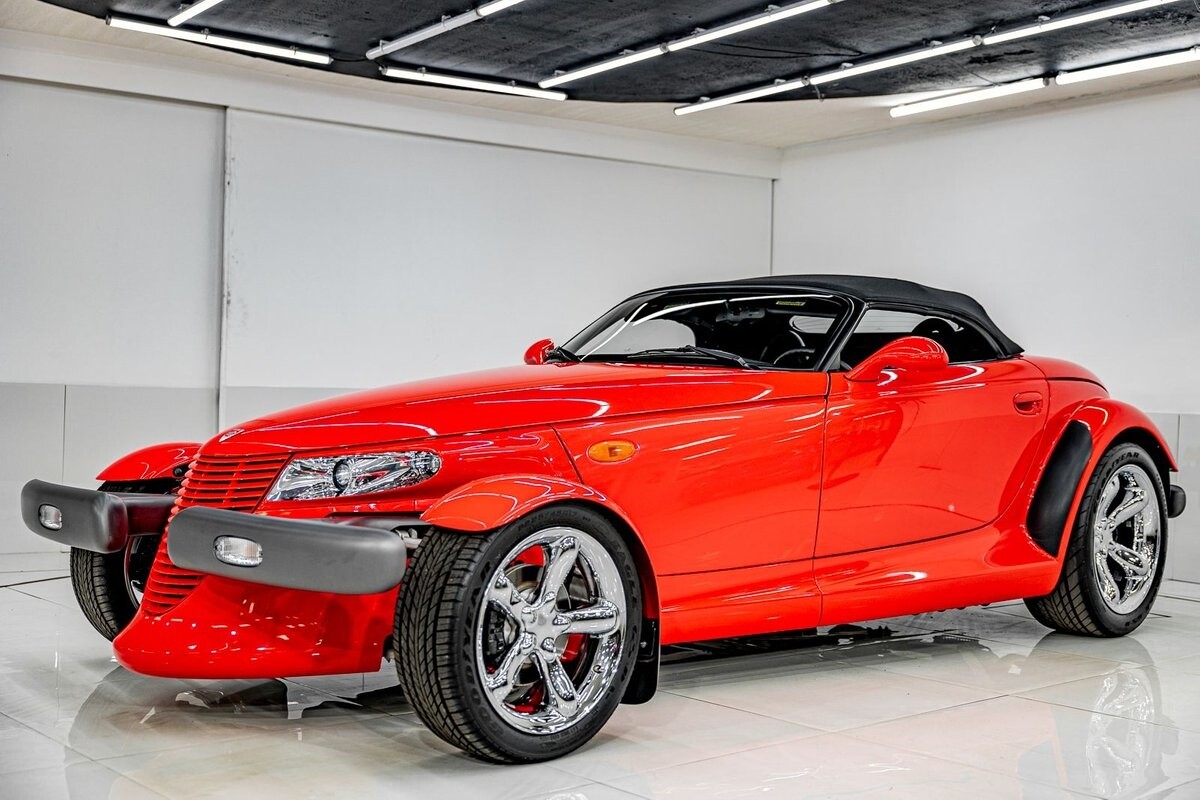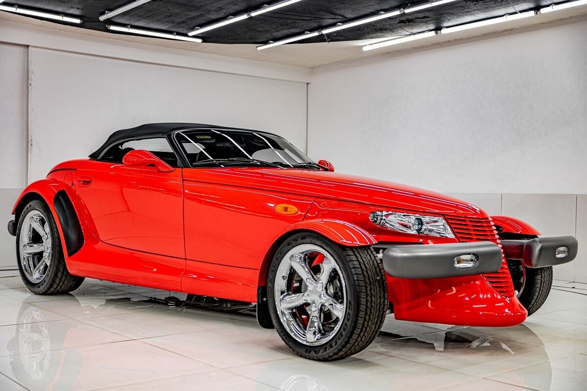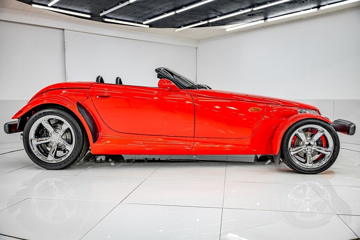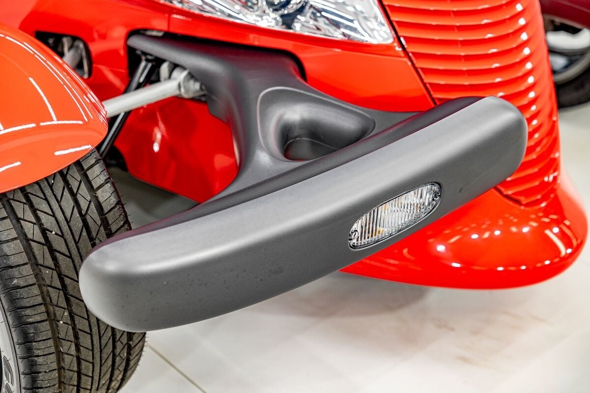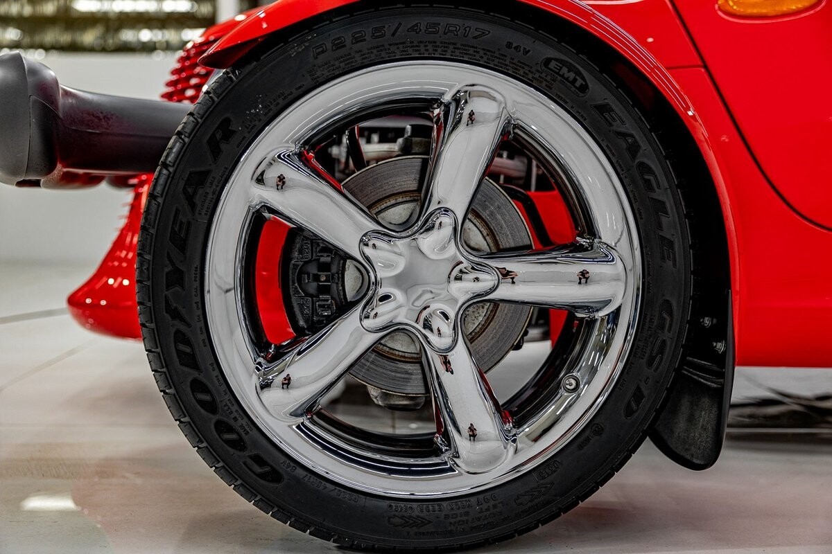 EXTERIOR: The prowler red is a very sharp color. The body is excellent, no damage anywhere that I can find. The original paint is excellent. The wheels are staggered size with 17s in front and 20s in back. The tires like new. The black cloth convertible top looks great and is very functional. It is still equipped with the factory front and rear bumpers. It literally looks like it just rolled off the assembly floor. All the exposed front suspension is immaculate.