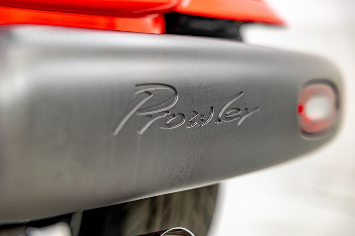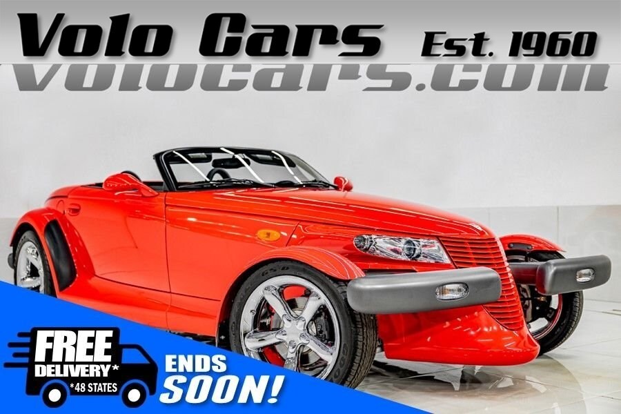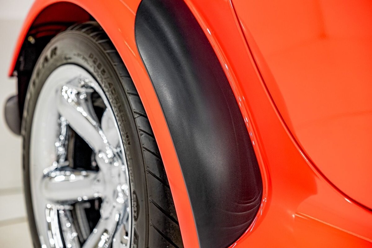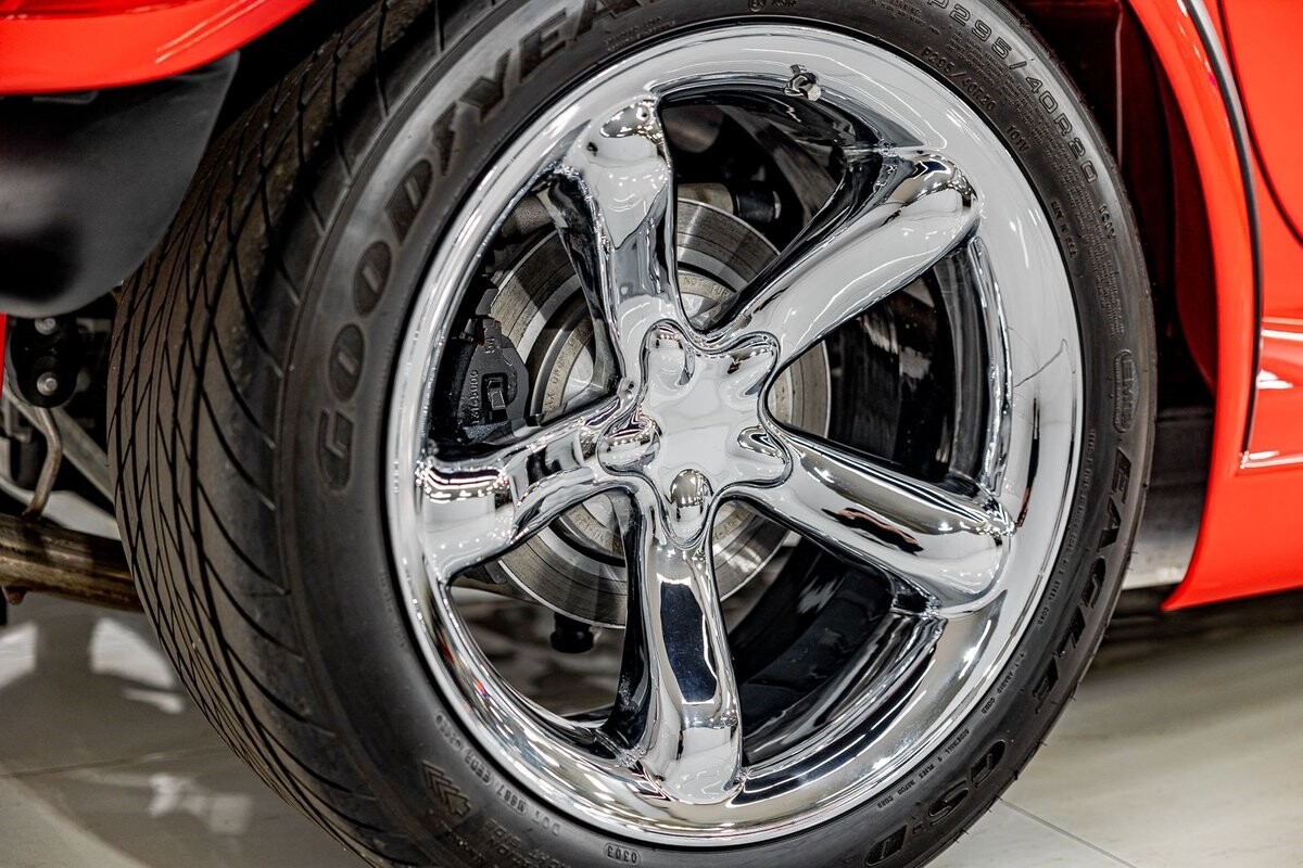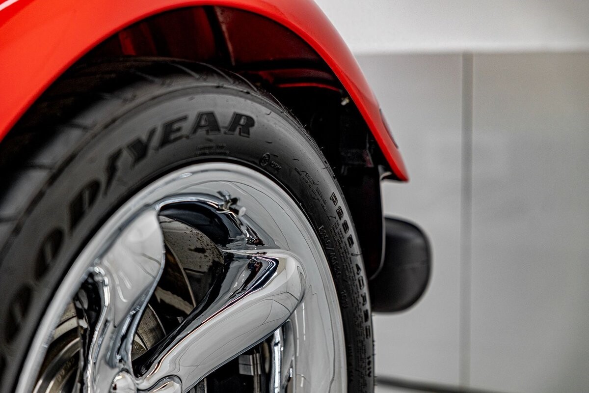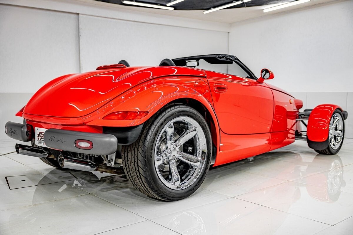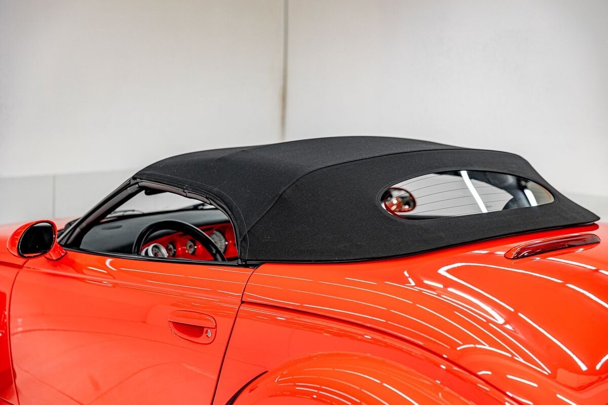EXTERIOR: The prowler red is a very sharp color. The body is excellent, no damage anywhere that I can find. The original paint is excellent. The wheels are staggered size with 17s in front and 20s in back. The tires like new. The black cloth convertible top looks great and is very functional. It is still equipped with the factory front and rear bumpers. It literally looks like it just rolled off the assembly floor. All the exposed front suspension is immaculate.