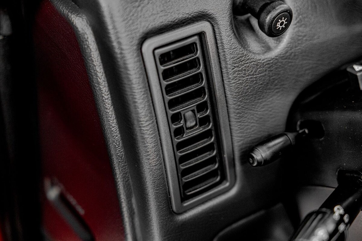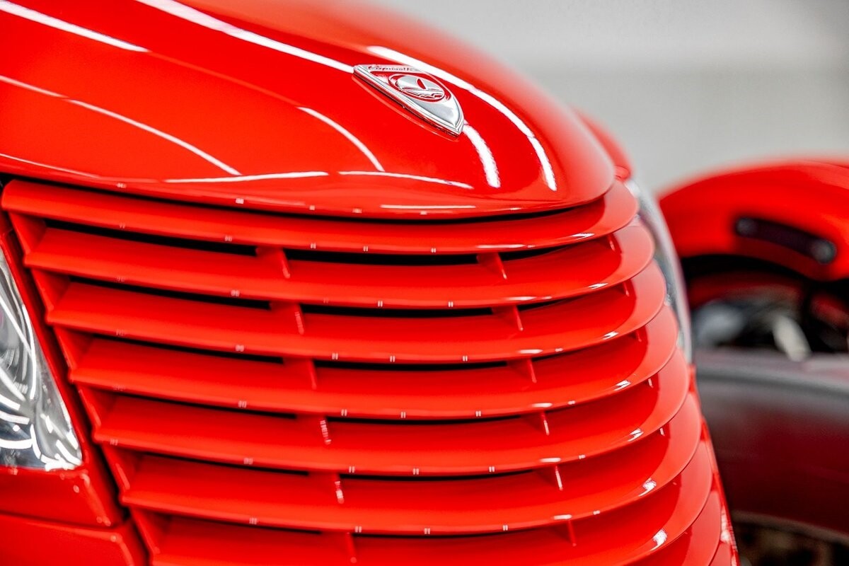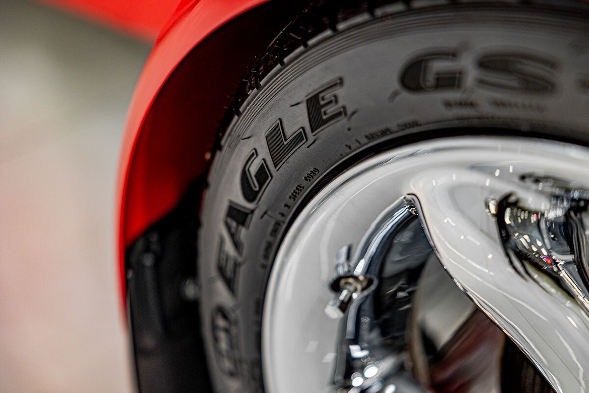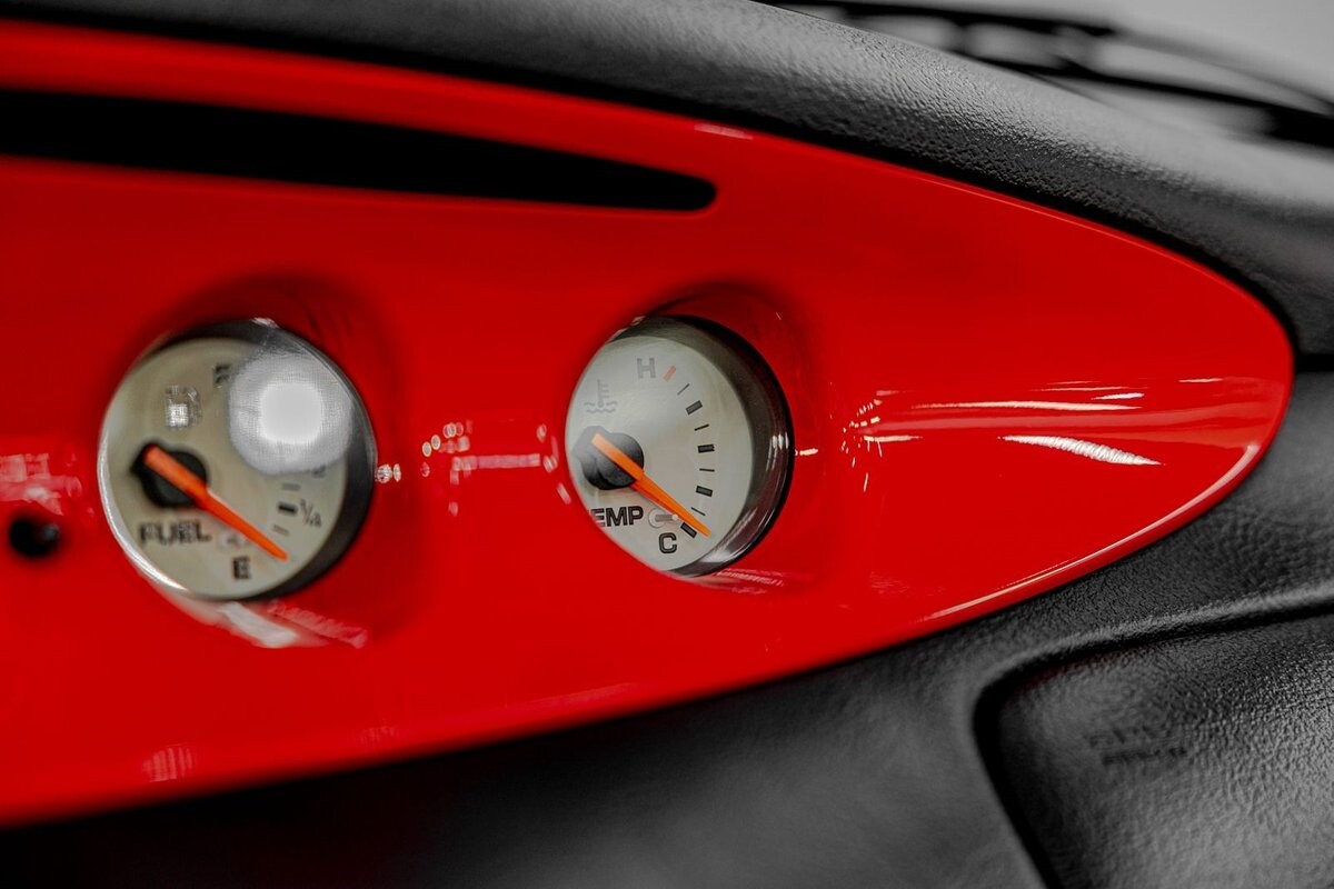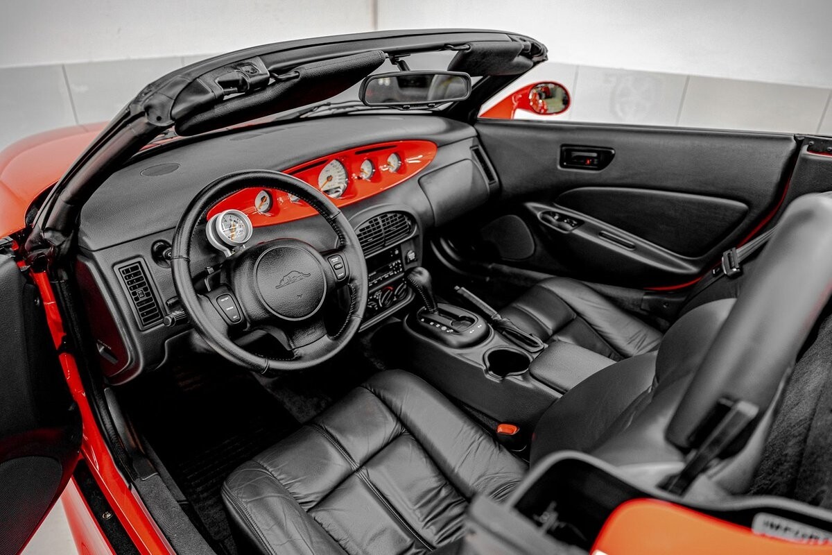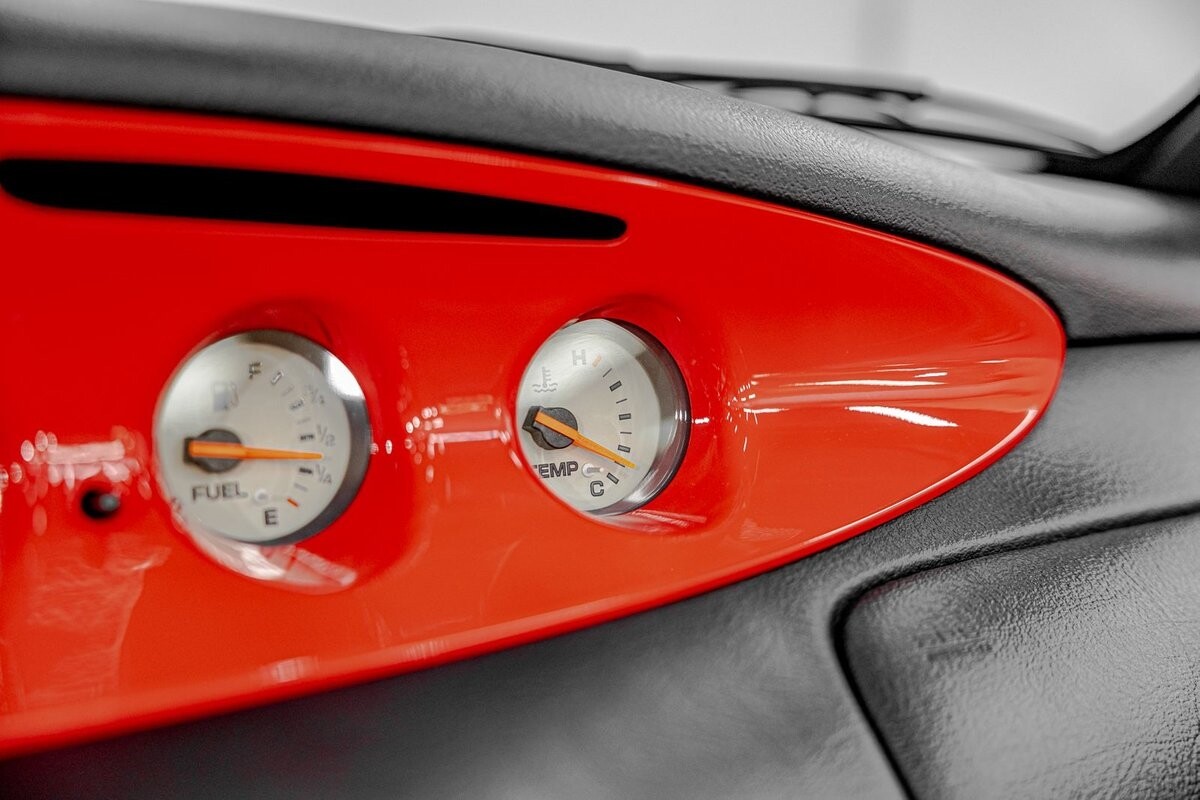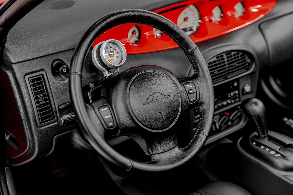 EXTERIOR: The prowler red is a very sharp color. The body is excellent, no damage anywhere that I can find. The original paint is excellent. The wheels are staggered size with 17s in front and 20s in back. The tires like new. The black cloth convertible top looks great and is very functional. It is still equipped with the factory front and rear bumpers. It literally looks like it just rolled off the assembly floor. All the exposed front suspension is immaculate.