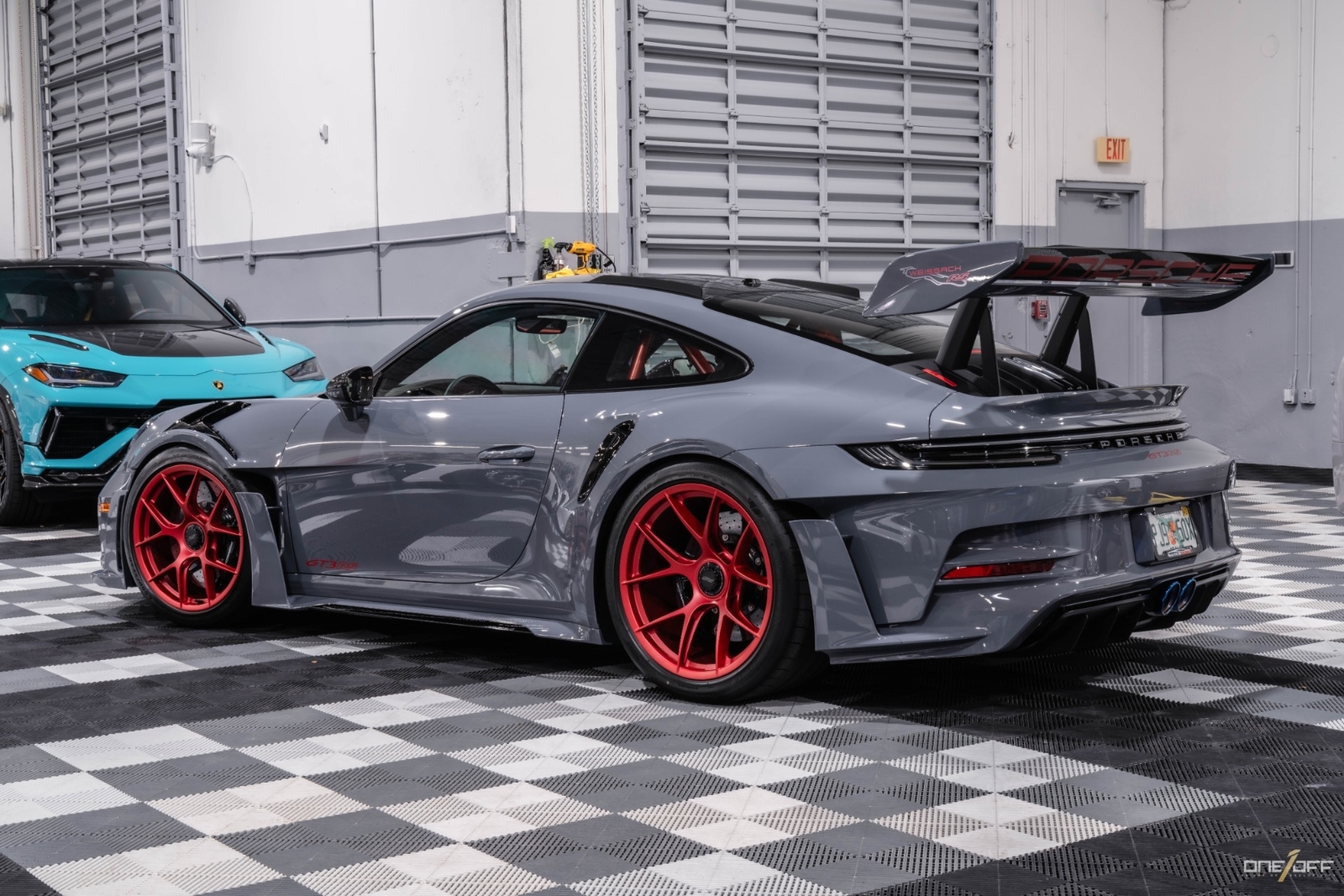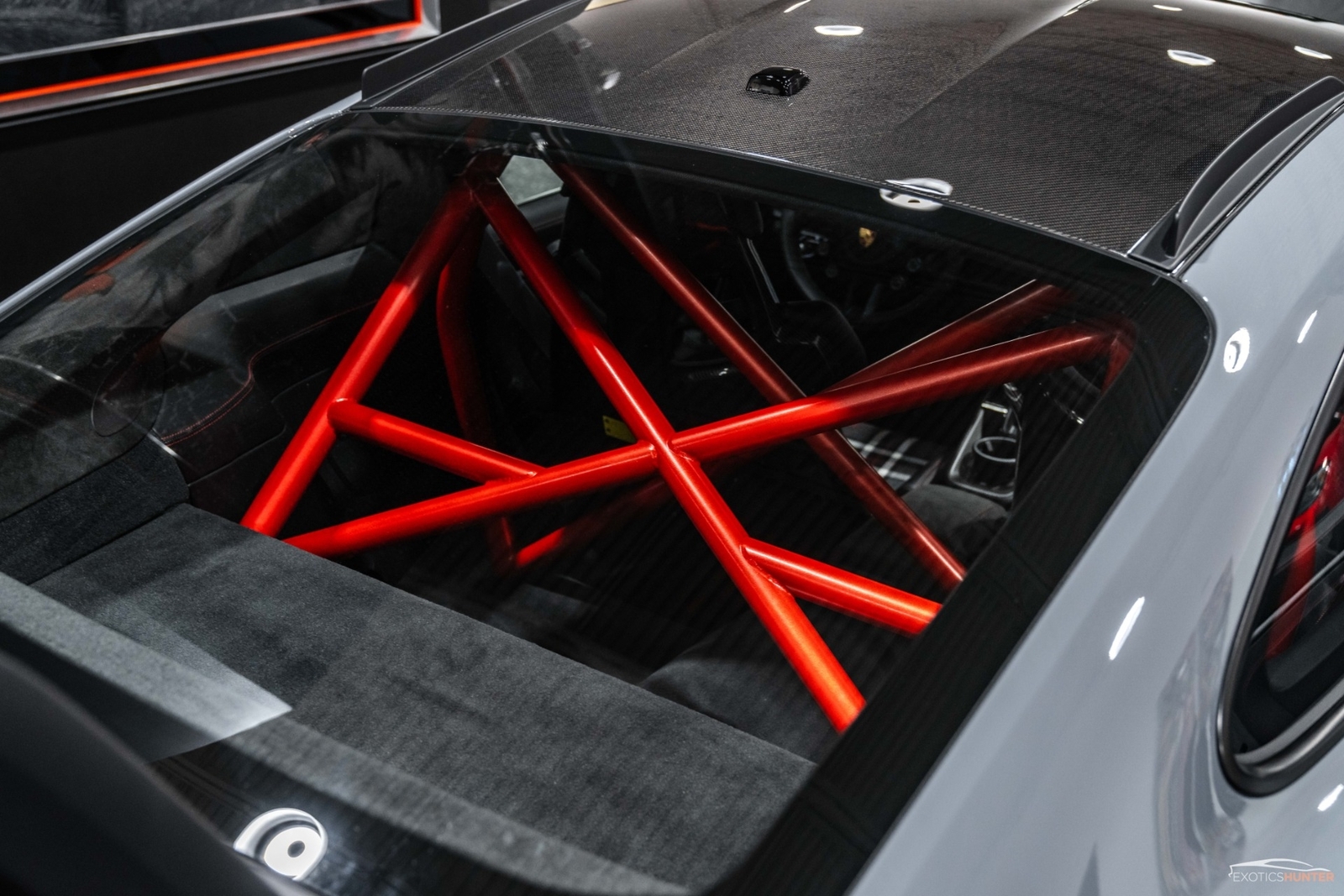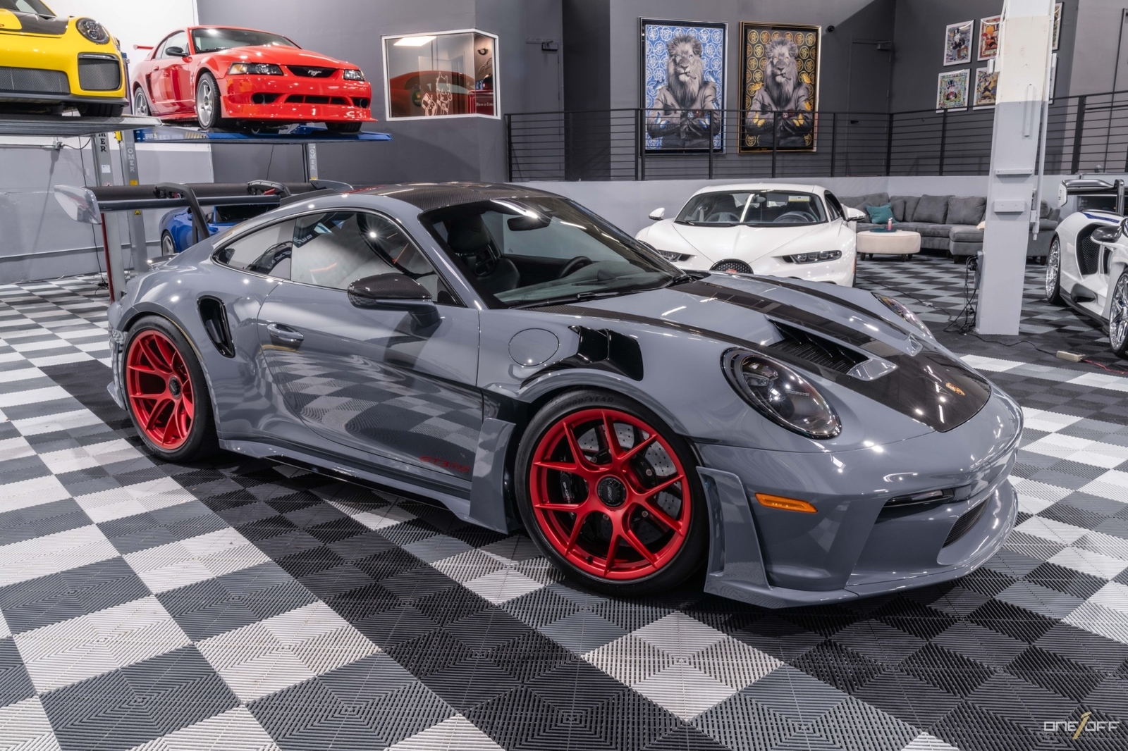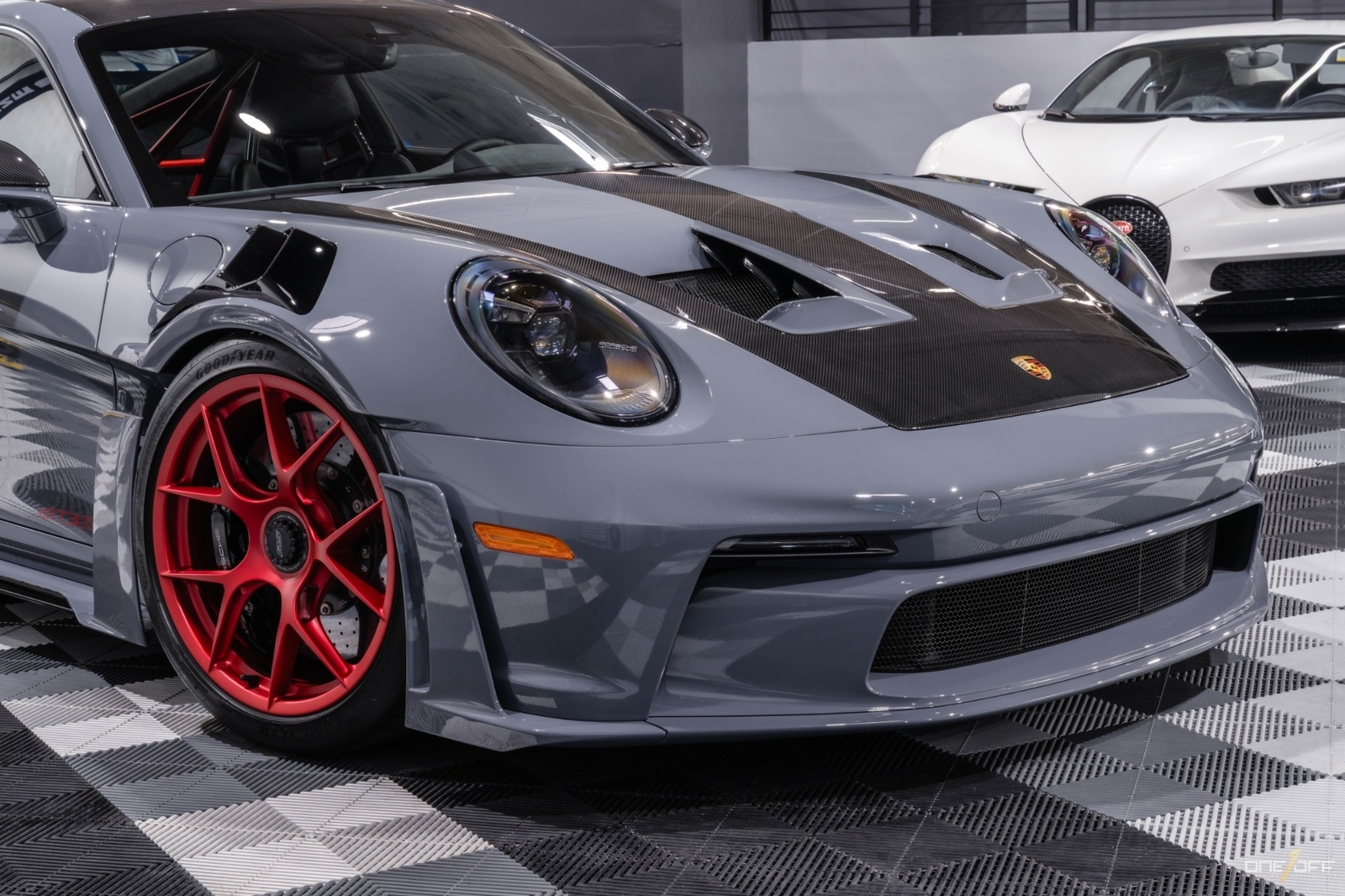 The 911 that is taking the world by storm. Making this spec truly one of a kind was the aim, and the Arctic Grey paint matched trim, heritage seat trim, along with the Pyro Red paint matched BBI roll cage did just that. This perfectly specced Weissach '24 GT3RS delivers more than what's promised. Featuring the must-have Porsche carbon ceramic brakes, the legendary Weissach package, the Porsche dynamic lighting system+, front axle lift, unparalleled Bose surround sound, and a Pyro Red/Arctic Grey color specification.