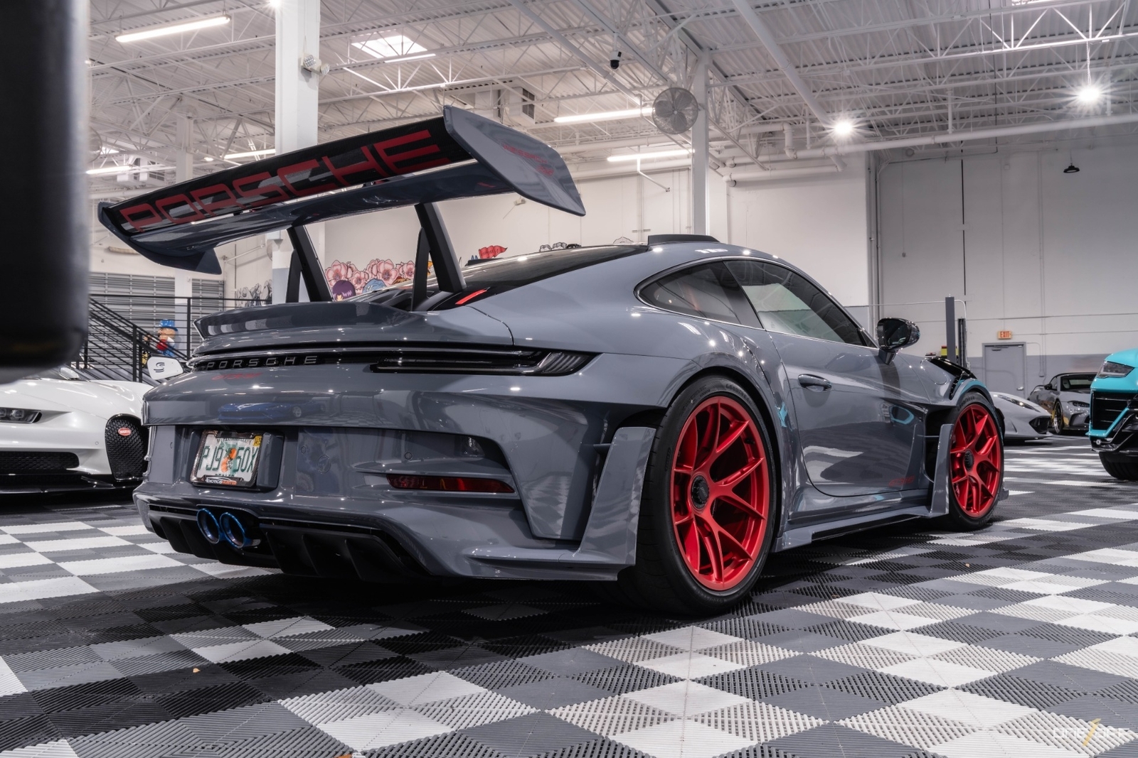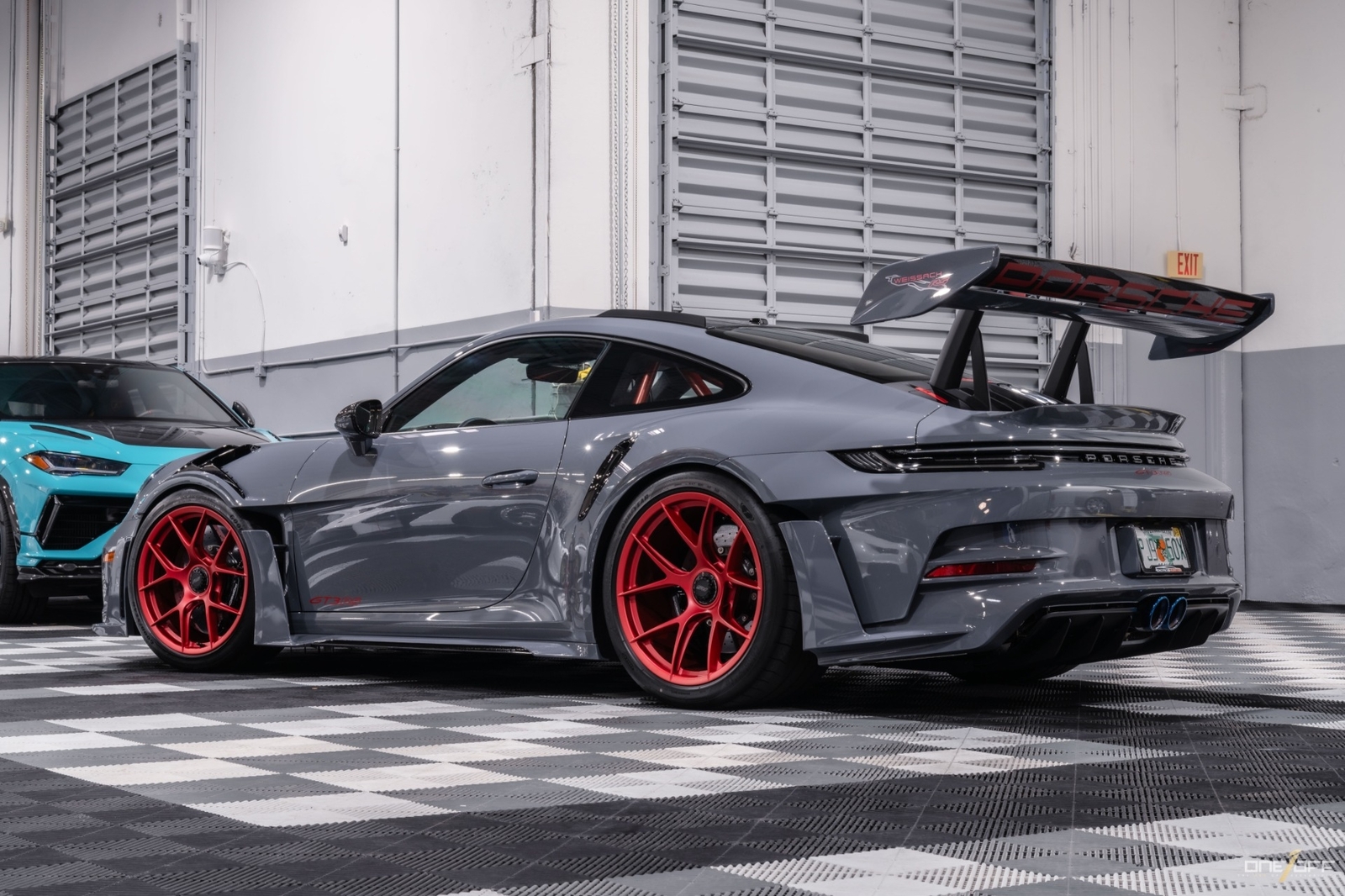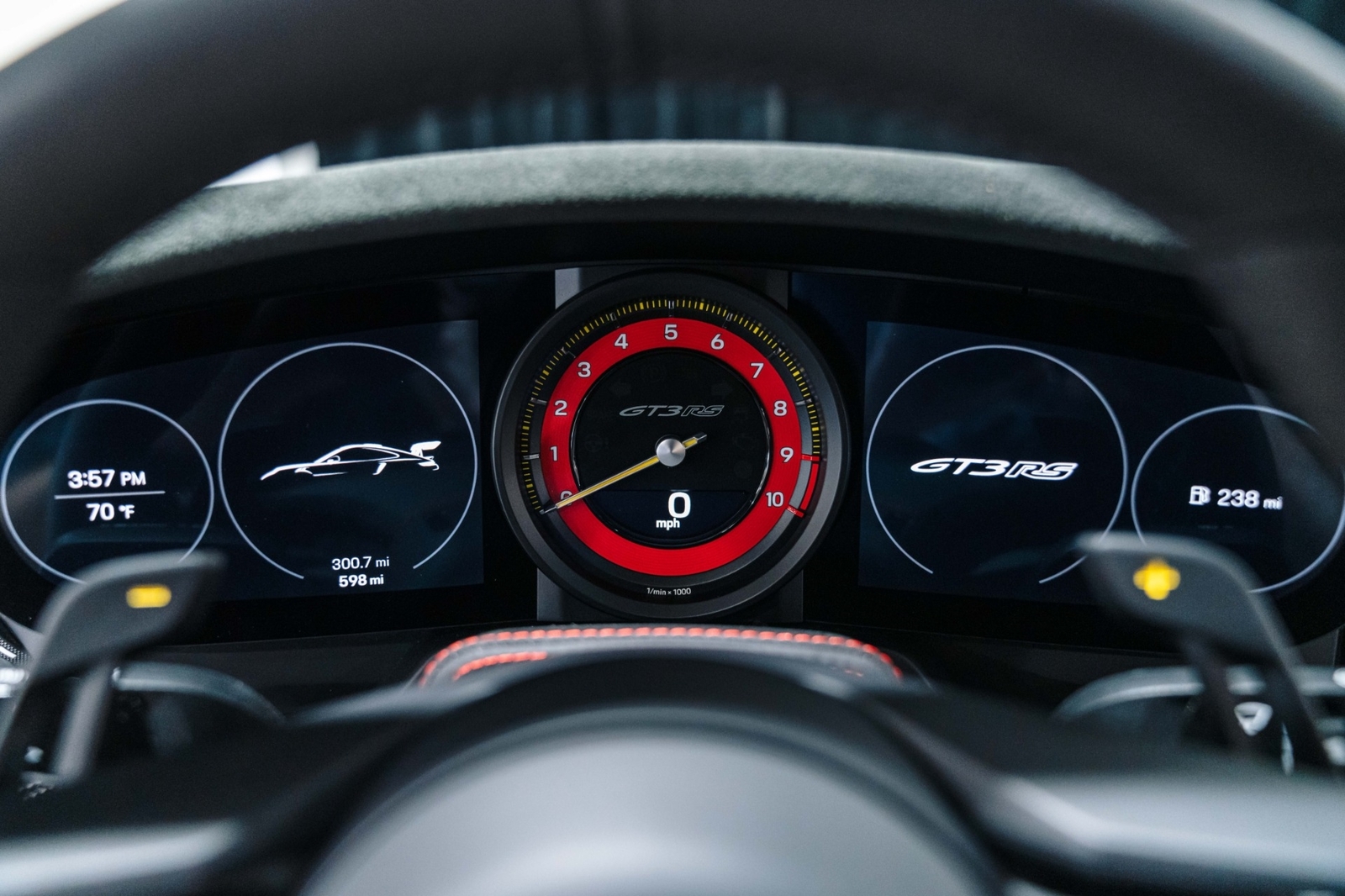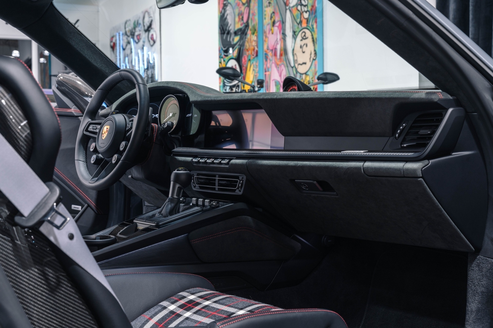 The 911 that is taking the world by storm. Making this spec truly one of a kind was the aim, and the Arctic Grey paint matched trim, heritage seat trim, along with the Pyro Red paint matched BBI roll cage did just that. This perfectly specced Weissach '24 GT3RS delivers more than what's promised. Featuring the must-have Porsche carbon ceramic brakes, the legendary Weissach package, the Porsche dynamic lighting system+, front axle lift, unparalleled Bose surround sound, and a Pyro Red/Arctic Grey color specification.