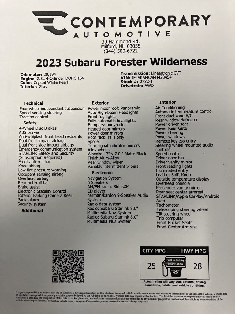 Recent Arrival! CONTEMPORARY CHRYSLER DODGE JEEP RAM is proud to present you with another True Market Priced Pre-Owned Vehicle. This 2023 Subaru Forester Wilderness is loaded with the following Factory Options: 8 Audio w/harman/kardon & Power Rear Gate (harman/kardon 9-Speaker Audio System, Power Rear Gate, and Radio: Subaru Starlink 8.0 Multimedia Nav System), Navigation System, Power moonroof: Panoramic, and Wheels: 17 x 7.0 J Matte Black Finish Alum-Alloy 8 Audio w/harman/kardon & Power Rear Gate (harman/kardon 9-Speaker Audio System, Power Rear Gate, and Radio: Subaru Starlink 8.0 Multimedia Nav System), Navigation System, Power moonroof: Panoramic, Wheels: 17 x 7.0 J Matte Black Finish Alum-Alloy, 4-Wheel Disc Brakes, 4.11 Axle Ratio, 6 Speakers, ABS brakes, Air Conditioning, Alloy wheels, AM/FM radio: SiriusXM, Anti-whiplash front head restraints, Auto High-beam Headlights, Automatic temperature control, Brake assist, Bumpers: body-color, CD player, Driver door bin, Driver vanity mirror, Dual front impact airbags, Dual front side impact airbags, Electronic Stability Control, Emergency communication system: STARLINK Safety and Security (Subscription Required), Exterior Parking Camera Rear, Four wheel independent suspension, Front anti-roll bar, Front Bucket Seats, Front Center Armrest, Front dual zone A/C, Front fog lights, Front reading lights, Fully automatic headlights, Heated door mirrors, Heated Front Bucket Seats, Heated front seats, Illuminated entry, Knee airbag, Leather Shift Knob, Low tire pressure warning, Occupant sensing airbag, Outside temperature display, Overhead airbag, Overhead console, Panic alarm, Passenger door bin, Passenger vanity mirror, Power door mirrors, Power driver seat, Power steering, Power windows, Radio data system, Radio: Subaru Starlink 8.0 Multimedia Plus System, Rear anti-roll bar, Rear seat center armrest, Rear window defroster, Rear window wiper, Remote keyless entry, Roof rack: rails only, Security system, Speed control, Speed-sensing steering, Split folding rear seat, Spoiler, STARLINK/Apple CarPlay/Android Auto, Steering wheel mounted audio controls, Tachometer, Telescoping steering wheel, Textured StarTex Upholstery, Tilt steering wheel, Traction control, Trip computer, Turn signal indicator mirrors, and Variably intermittent wipers!!