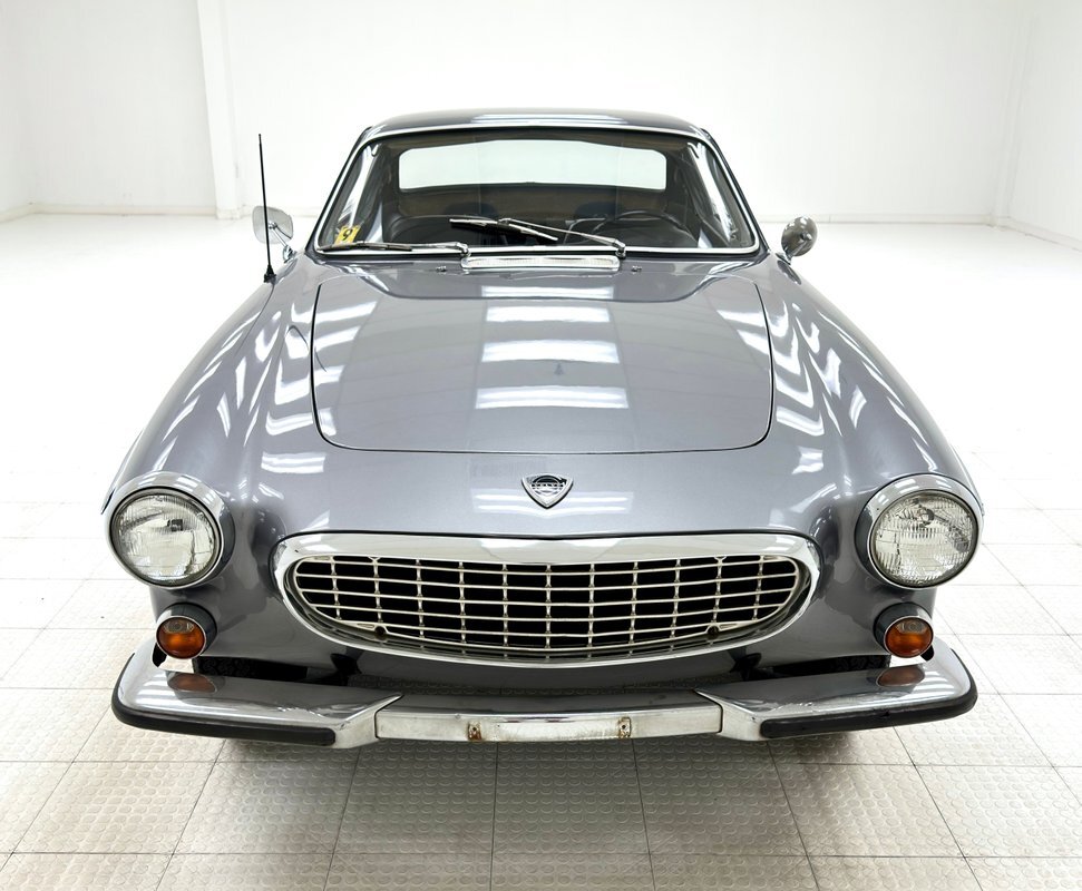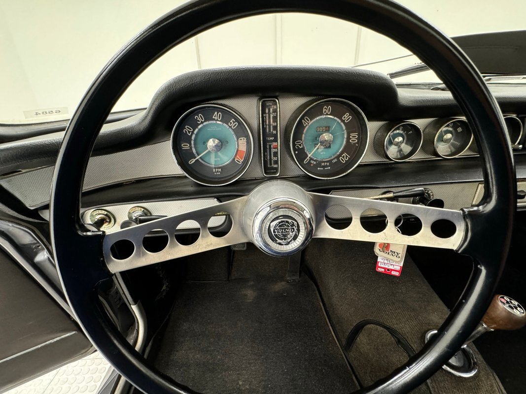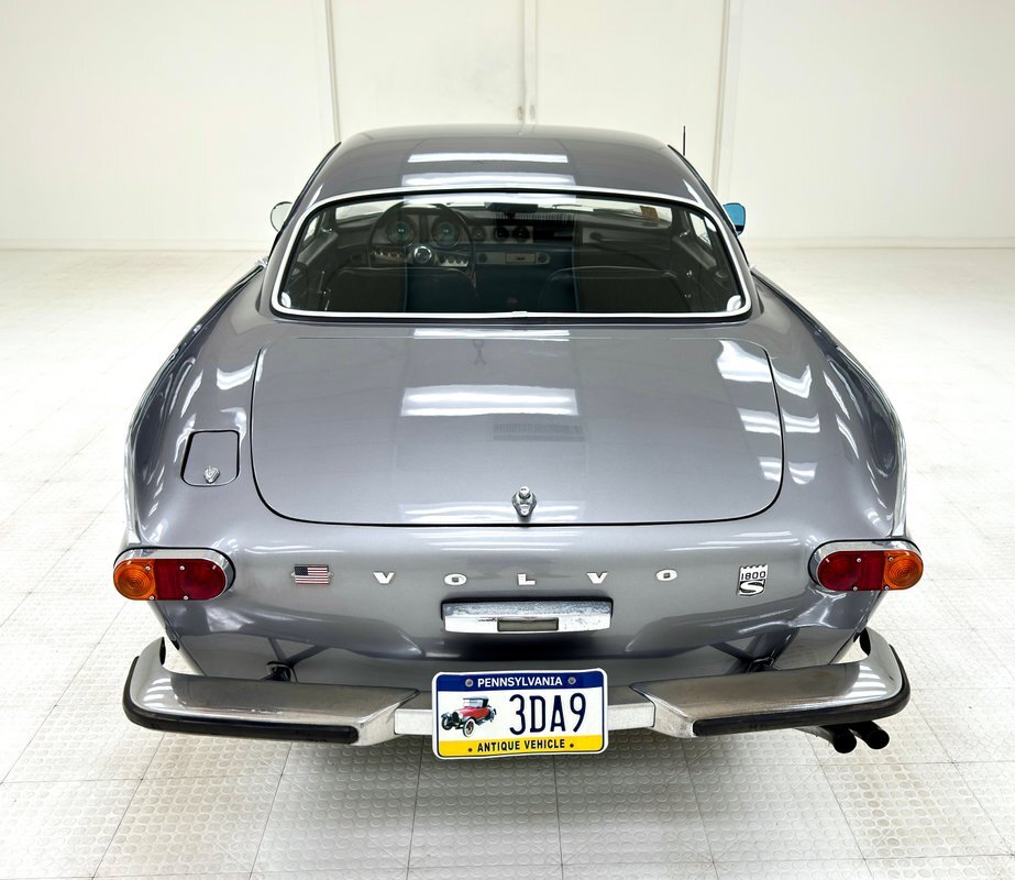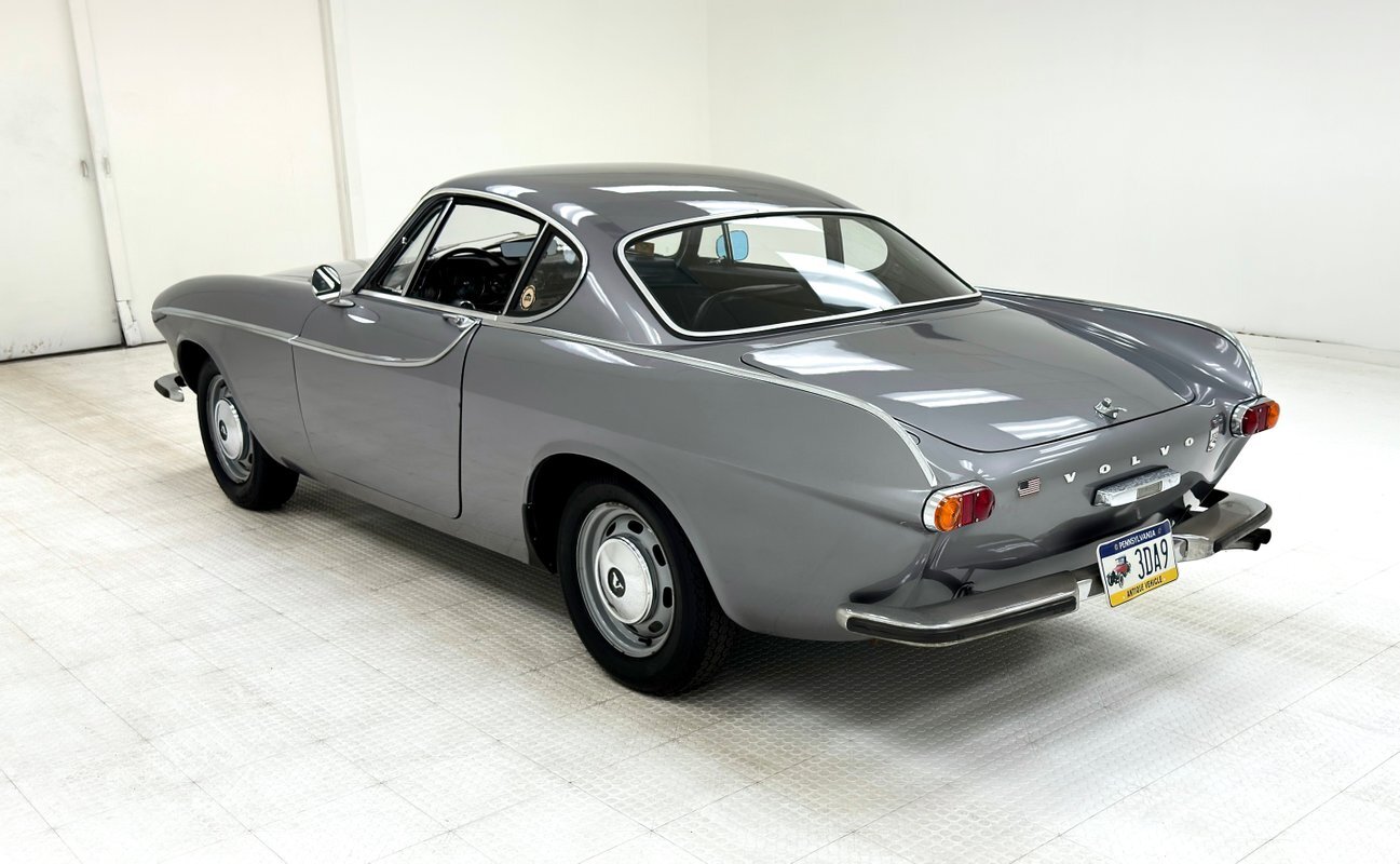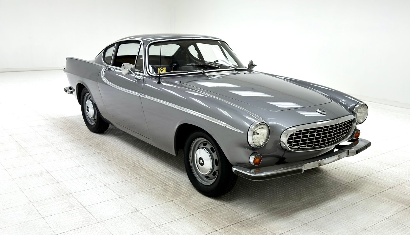Five designers submitted their concepts for the P1800 coupe and the one chosen was actually a Swede, Pelle Peterson. That design, we now see our 1966 example bathed in Graphite Gray, has a front end with some British influence with its single round headlight on the end of the front quarters, and central chrome edged open wide oval grille, indicating perhaps some Italian influence which pervades. Some of the brightwork is in fine condition while other pieces could benefit from some restoration. As we tour visually back, we see a trim spear, high doors, well minded gaps and a slight wrap around windscreen. The roofline dives downward and has an aircraft influence and as it descends to the trunk line, it takes from the upper doors and runs a line rearward that will eventually form the rear quarters with a fin-like upper protrusion which will make a blunt point ending for the taillights on back. These lights are oval and flank an inward raking roll pan with a Volvo badge on the top and a shiny bumper below. A flat trunk lid is between these "fins". 15-inch steel wheels wear proper Volvo hubcaps. Overall, the paint is very nice with minor imperfections that are limited to some bubbling on lower panels.