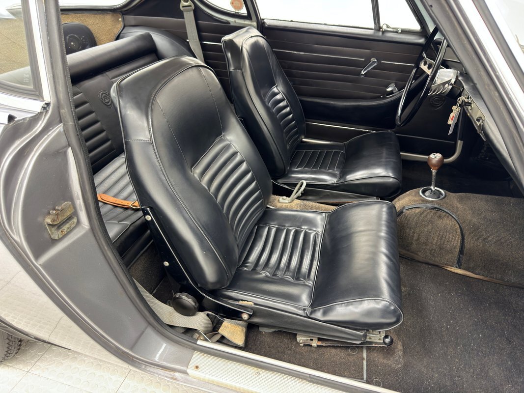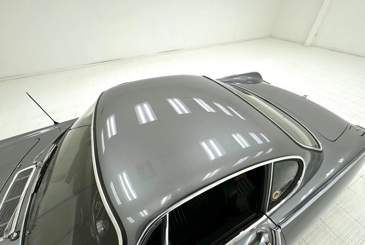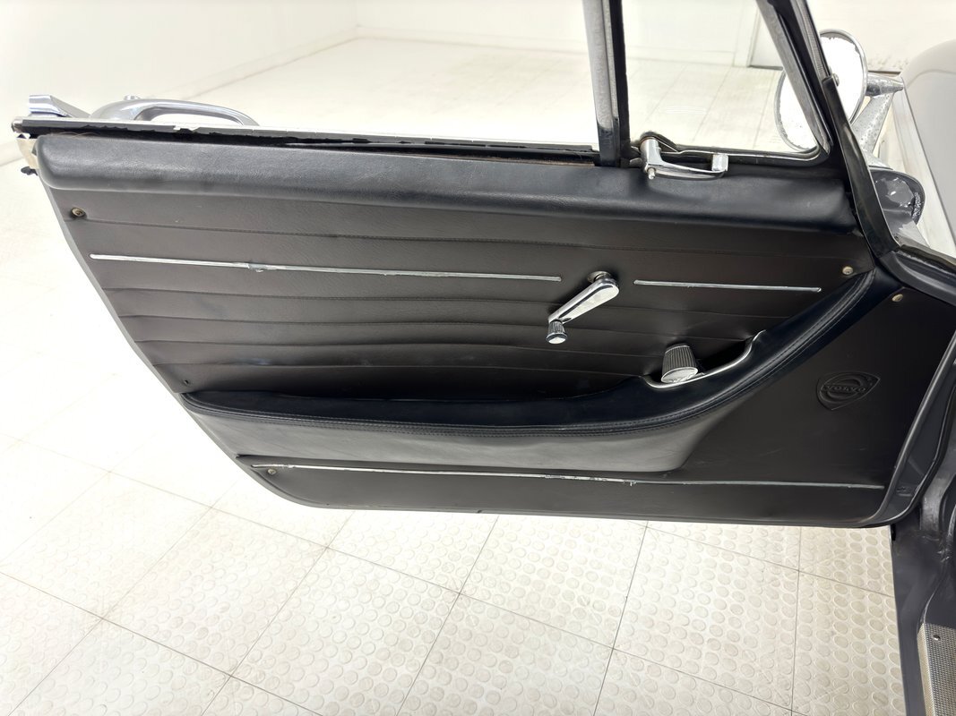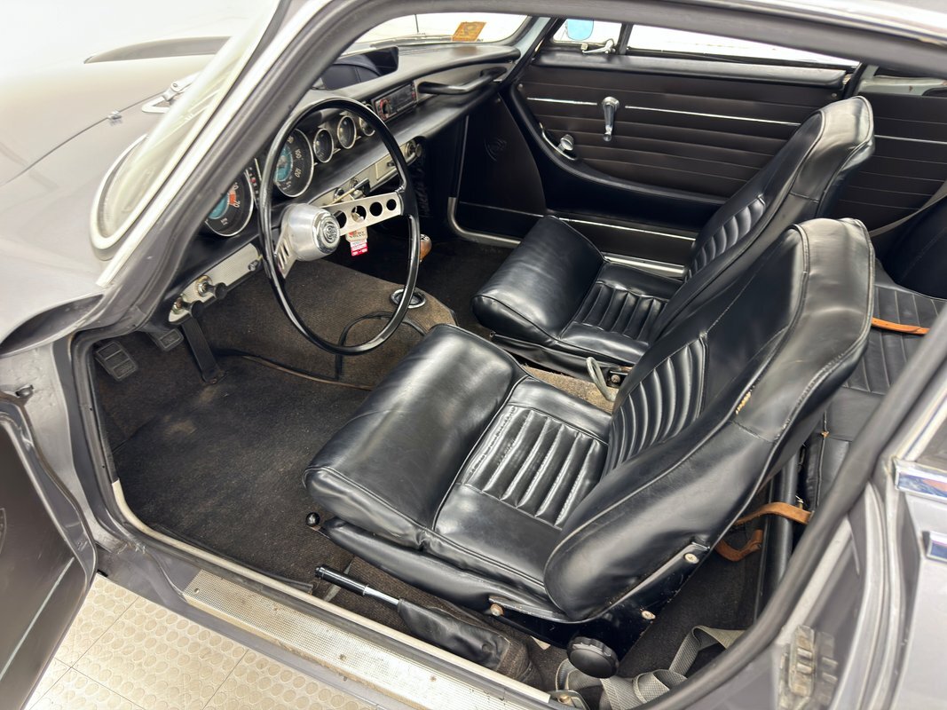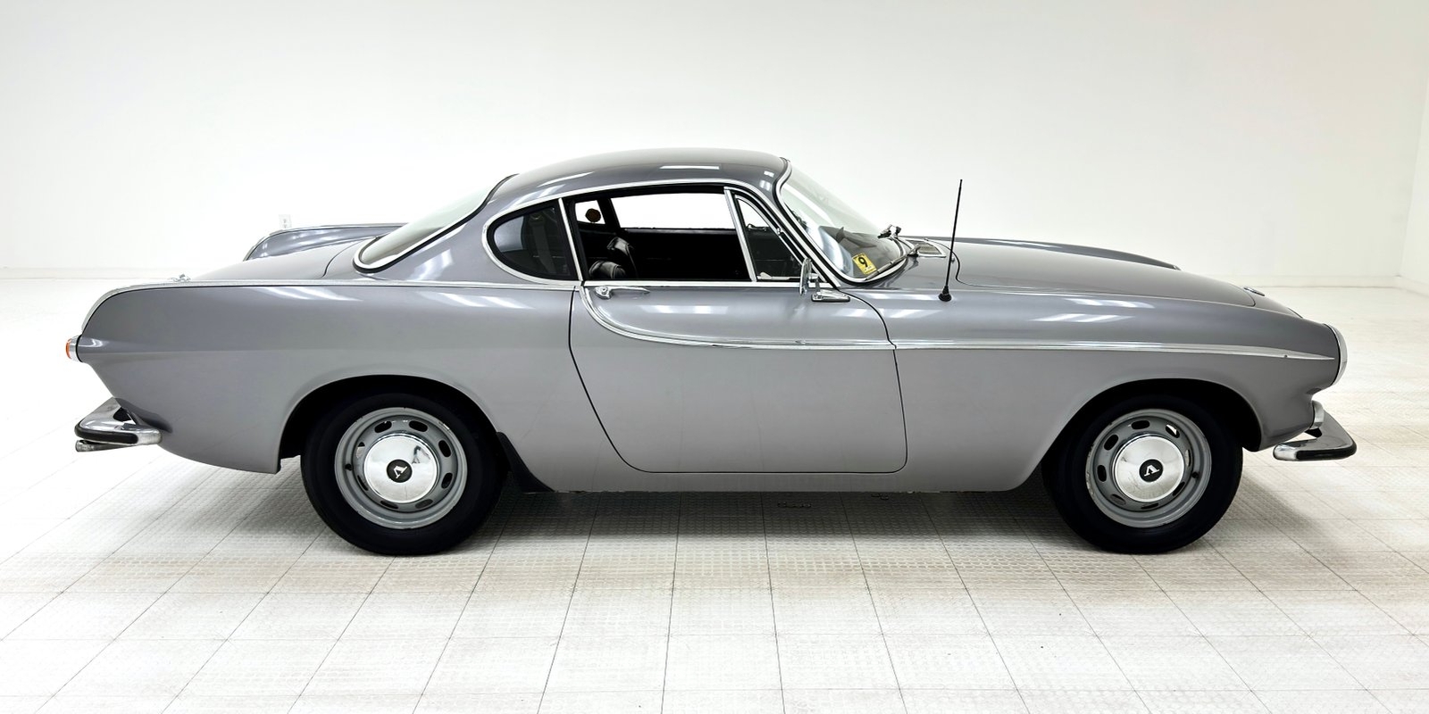 Five designers submitted their concepts for the P1800 coupe and the one chosen was actually a Swede, Pelle Peterson. That design, we now see our 1966 example bathed in Graphite Gray, has a front end with some British influence with its single round headlight on the end of the front quarters, and central chrome edged open wide oval grille, indicating perhaps some Italian influence which pervades. Some of the brightwork is in fine condition while other pieces could benefit from some restoration. As we tour visually back, we see a trim spear, high doors, well minded gaps and a slight wrap around windscreen. The roofline dives downward and has an aircraft influence and as it descends to the trunk line, it takes from the upper doors and runs a line rearward that will eventually form the rear quarters with a fin-like upper protrusion which will make a blunt point ending for the taillights on back. These lights are oval and flank an inward raking roll pan with a Volvo badge on the top and a shiny bumper below. A flat trunk lid is between these "fins". 15-inch steel wheels wear proper Volvo hubcaps. Overall, the paint is very nice with minor imperfections that are limited to some bubbling on lower panels.