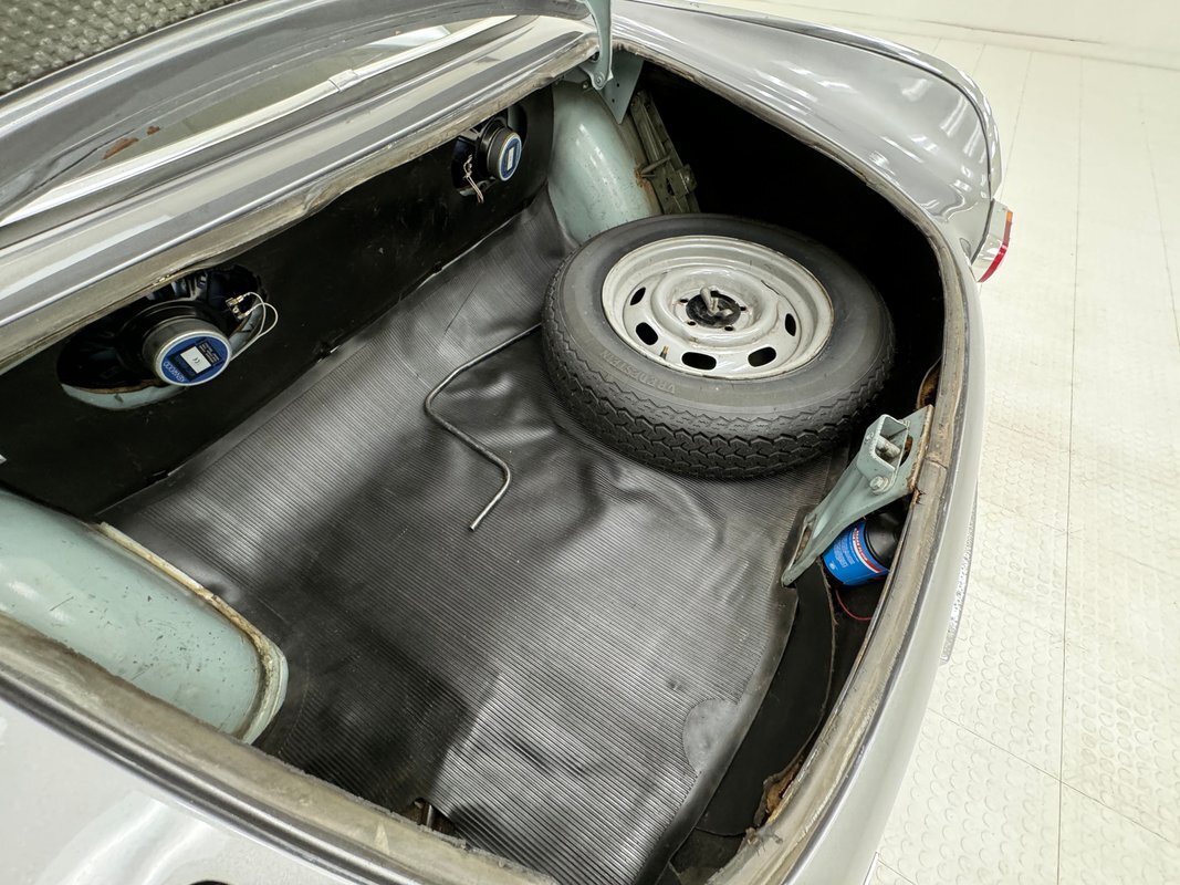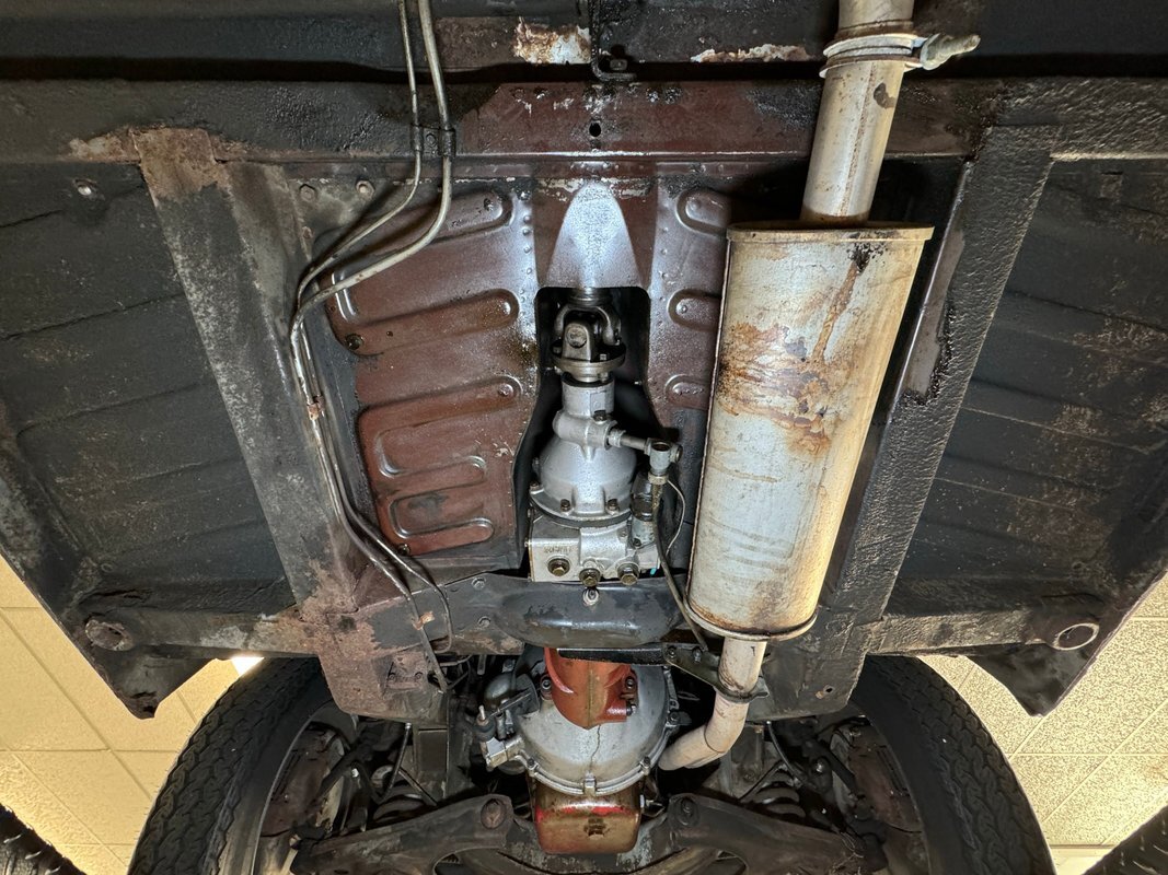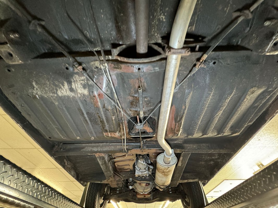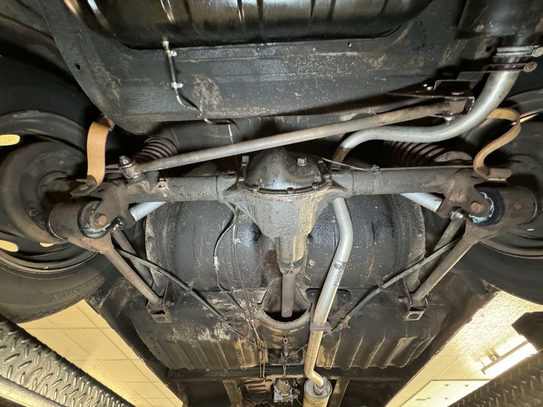Here we find driver quality conditions with the presence of surface rust, some flaking rust on one floor pan crease, errant fluid on the gas tank but generally dry conditions underneath. Independent coil springs make up the suspension in front while trailing arm, coil springs and a panhard bar fill the back. A single exhaust meets a stock style muffler before exiting stylishly with twin tips on the right rear.