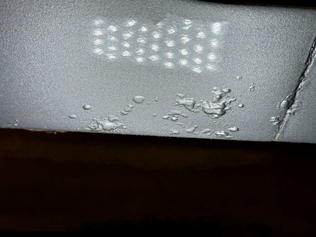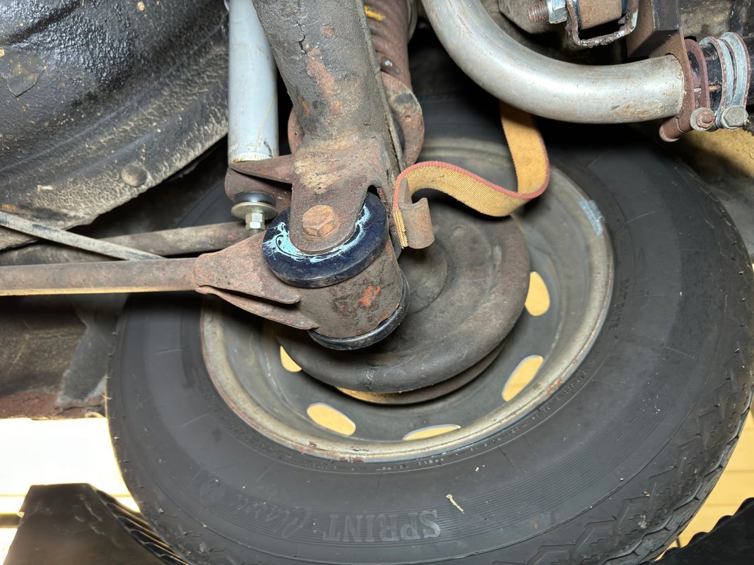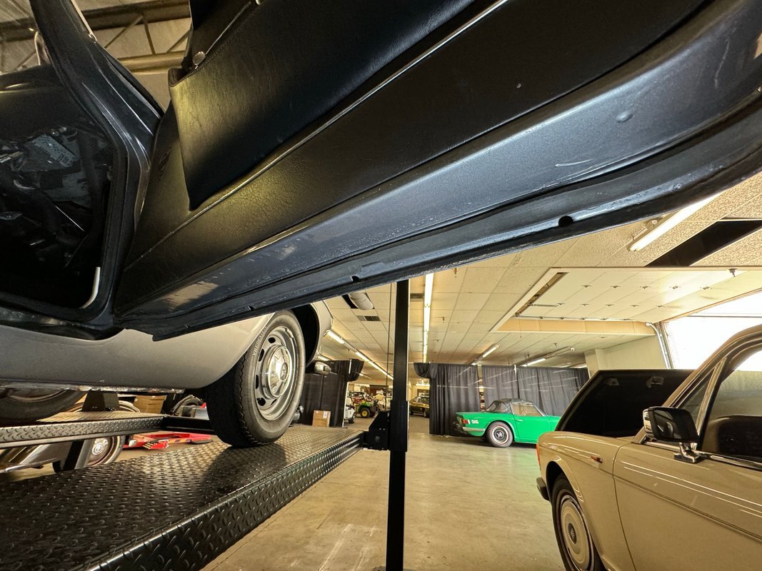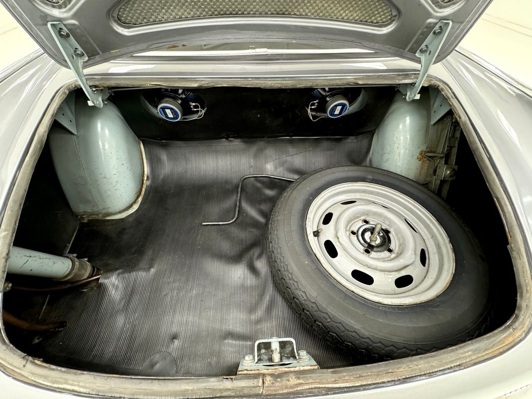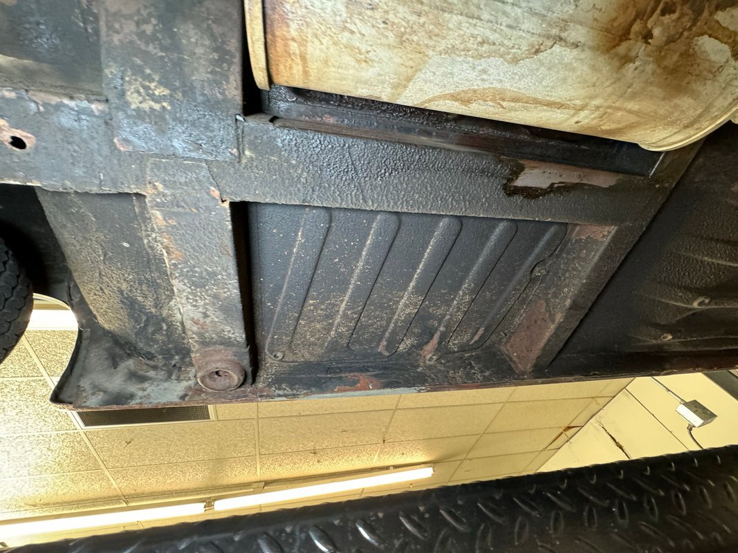 Here we find driver quality conditions with the presence of surface rust, some flaking rust on one floor pan crease, errant fluid on the gas tank but generally dry conditions underneath. Independent coil springs make up the suspension in front while trailing arm, coil springs and a panhard bar fill the back. A single exhaust meets a stock style muffler before exiting stylishly with twin tips on the right rear.