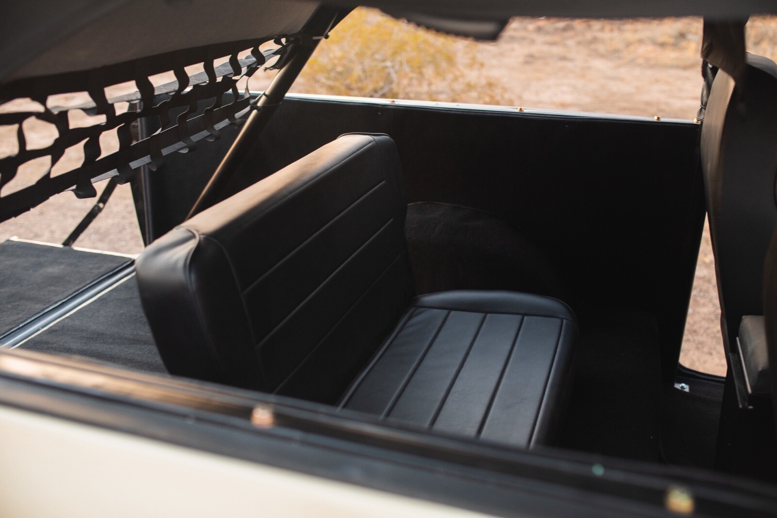 - Re-upholstered OEM style sliding Front Seating w/OEM style tumble matching rear bench, and NOS seatbelts.