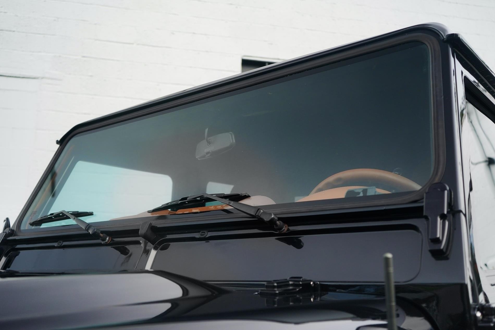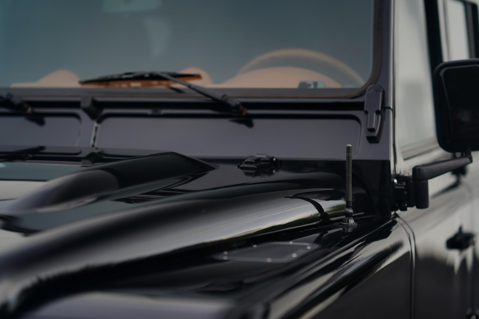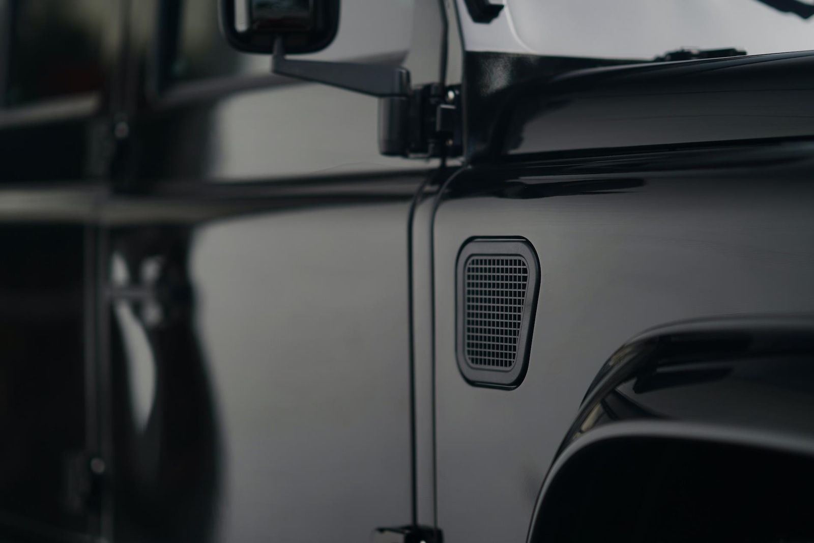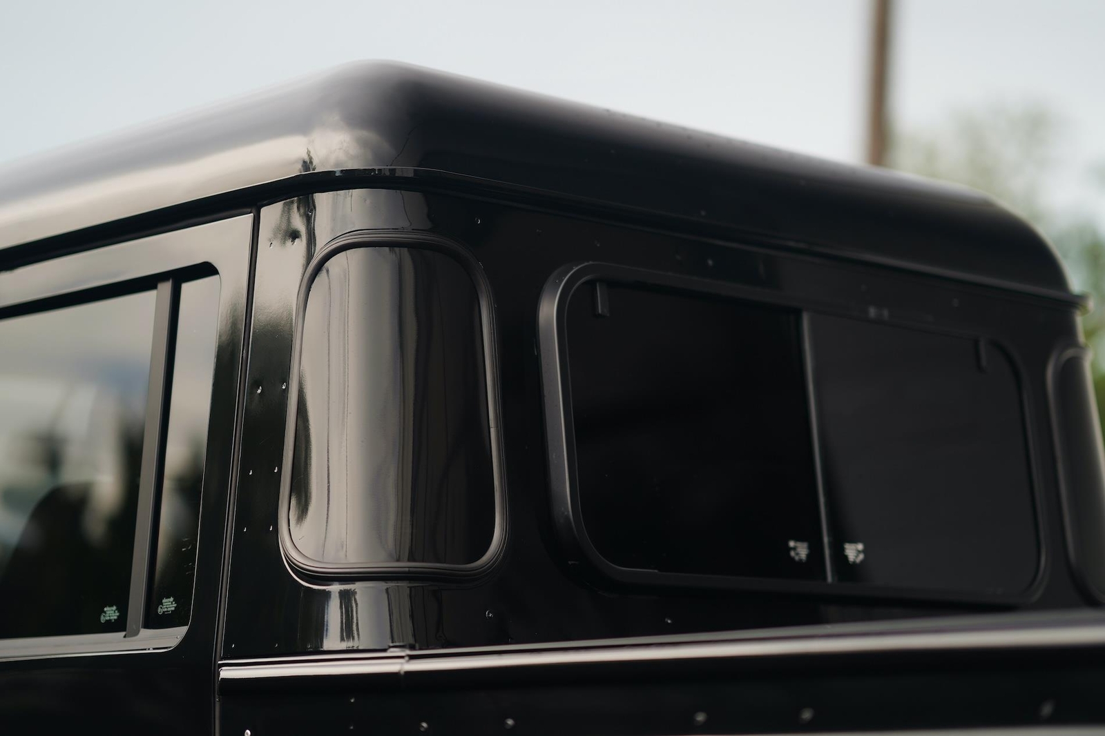 The special 4-door-with-a-bed body was expertly finished in deep, sultry Santorini Black Metallic paint, exuding a sense of sophistication and luxury, with a timeless look and subtle contemporary flair. It is complemented by color-matched wheel arches and trim, all completed at our in-house body and paint facility. Optimill® black anodized billet aluminum door, bonnet, and windscreen hinges add to the understated color palette.