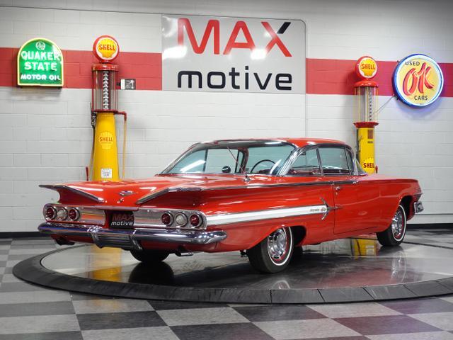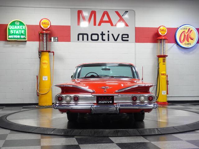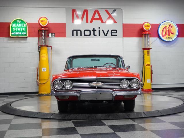 Here’s a nice, tight and straight 1960 Chevrolet Impala available now from the MaxMotive Pittsburgh Showroom. The car is remarkably stock right down to the full wheel covers. Under the hood is one of the great small block V8 engines of all time, the vaunted 283, backed by a rugged Powerglide automatic transmission. The color is Roman Red, complemented by a red and white vinyl interior. Power steering makes the big Chevy easy to handle. That this Impala has been well cared for is evident first in its overall condition where all the doors open and close so smoothly, and in the presence of an oil pressure gauge and a shiny new dual exhaust system with chrome tips. Firestone radial tires and a Sony AM/FM/Cassette stereo have been added as well. Inside the enormous trunk are a spare tire and jack, plus a set of fender skirts. It also comes with a helpful and informative 1960 Chevrolet Owners Guide. This iconic 1960 Chevrolet Impala has been beautifully preserved, and is ready for many more years of seeing the USA. Please be sure to see the detailed photos at