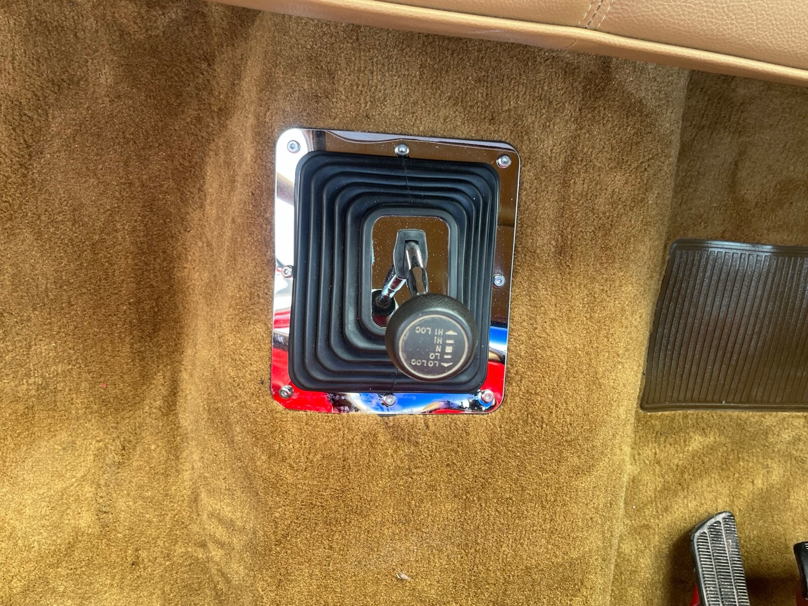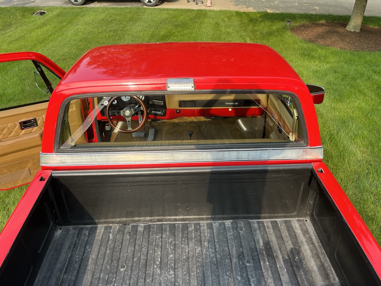 The truck is bright red and has a lovely coustum tan interior that is all premium peanut butter vinyl. The dash is padded and wrapped to match the seat the door cards are wrapped also in the same vinyl. the headliner is a lovely perforated vinyl in the same color. The whole interior is brand new the gauges are new glow shift gauges that has a gps speedometer. the stereo is a retro sound that has a nice factory look with all the features of a new radio. This is a Silverado so it has power windows and power locks